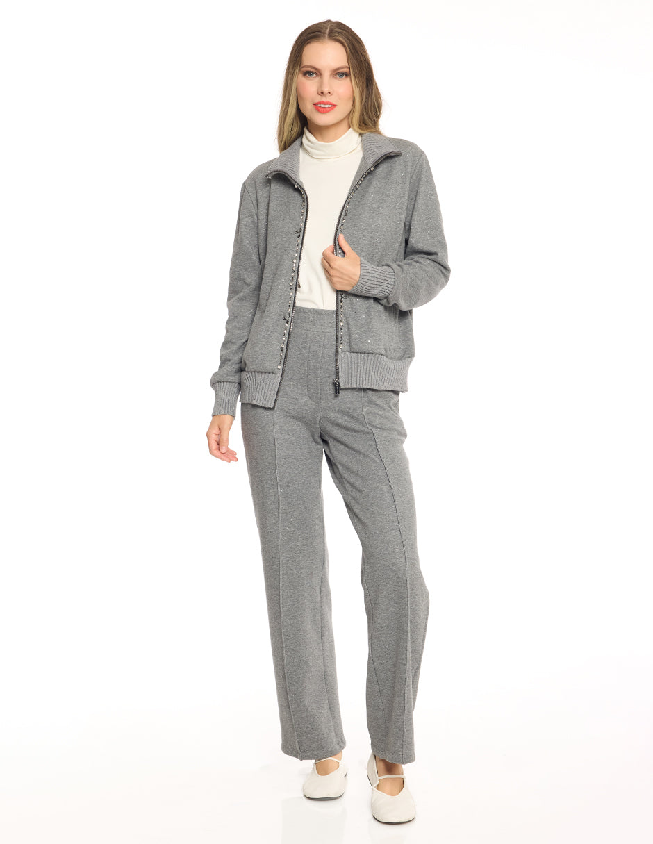 Chamarra punto liso con lurex, cuello alto, puños y ruedo en cárdigan, cierre al frente con bordado de pedrería, bolsas de vivo en costados, manga larga
