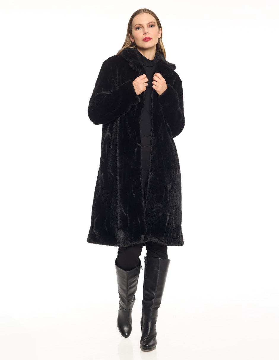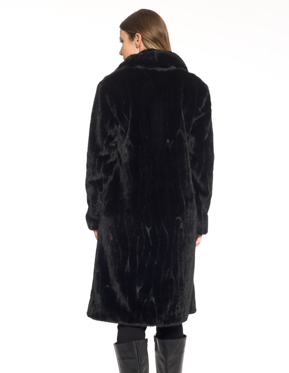 Abrigo mink largo, solapa con broche al frente, bolsas en costados, manga larga