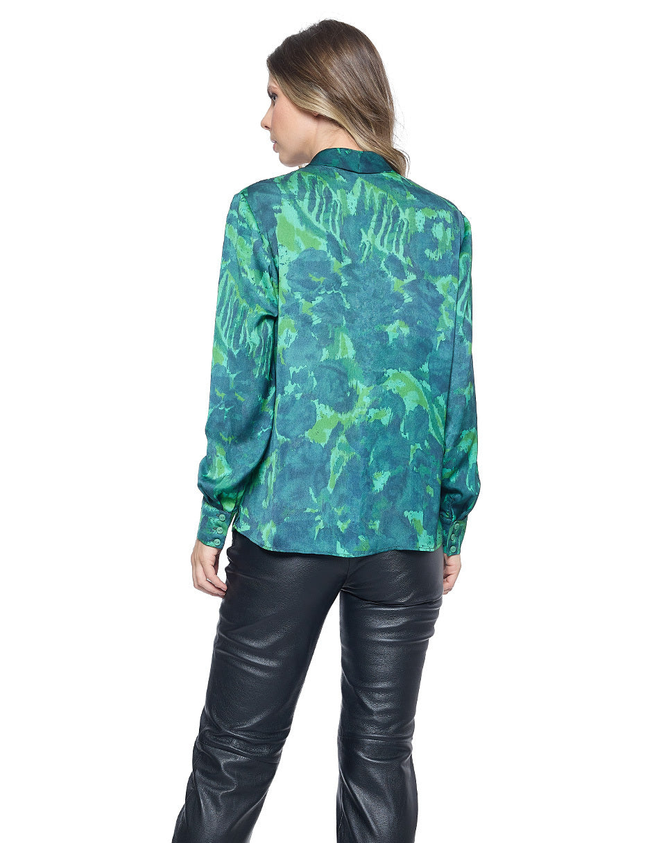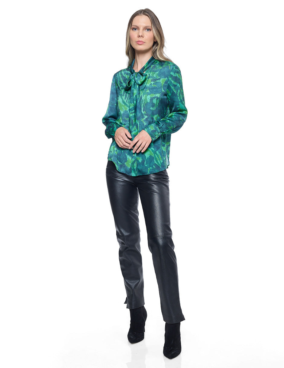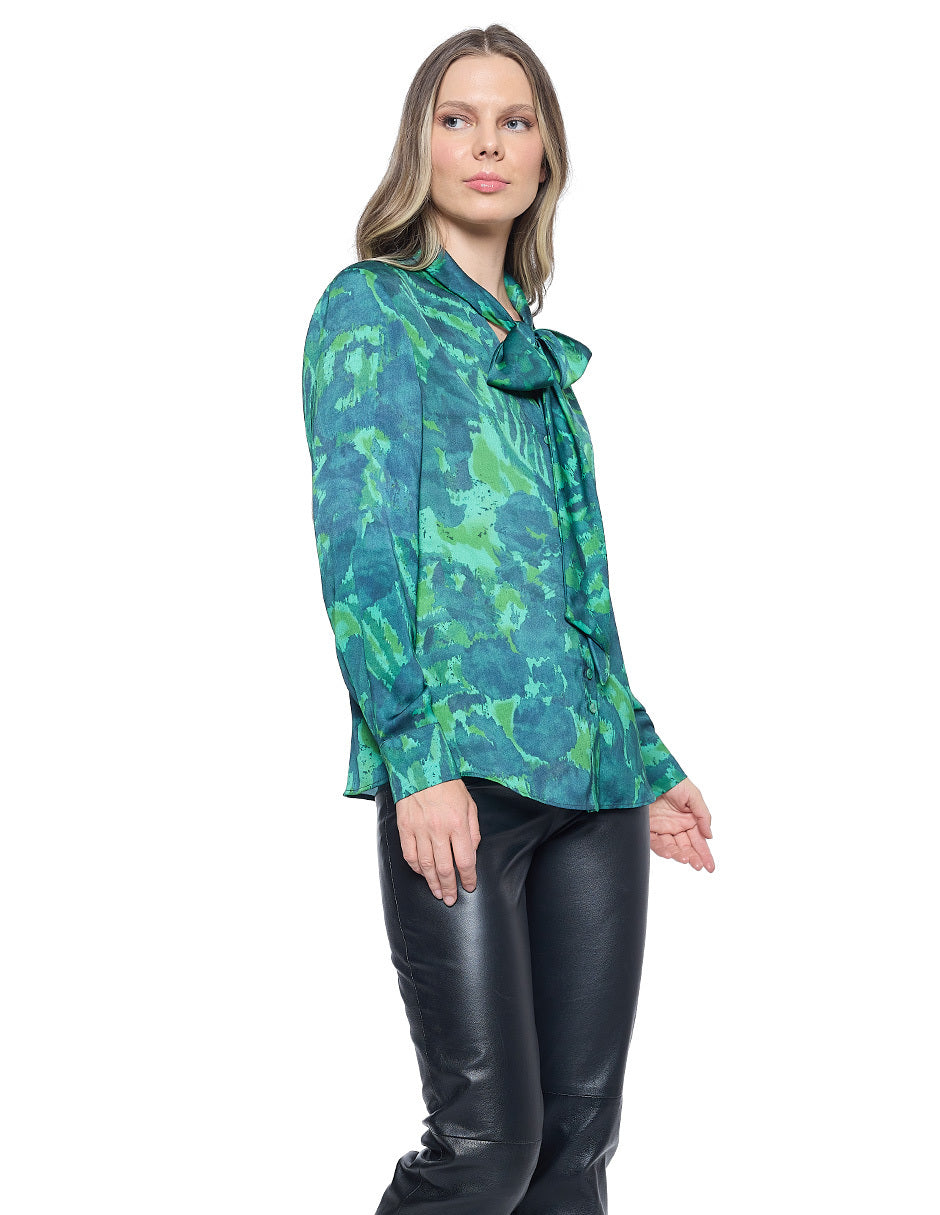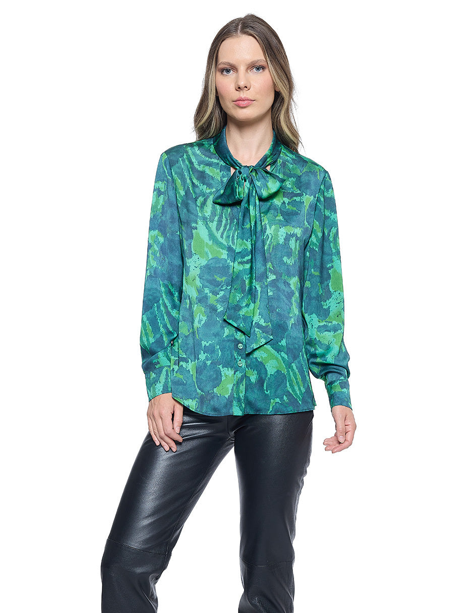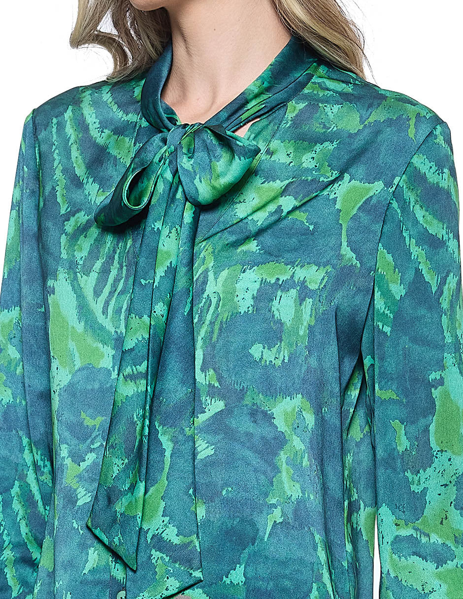 Blusa estampada color verde, cuello redondo, escote V con corbata, aberturas en costados, y manga larga con puño