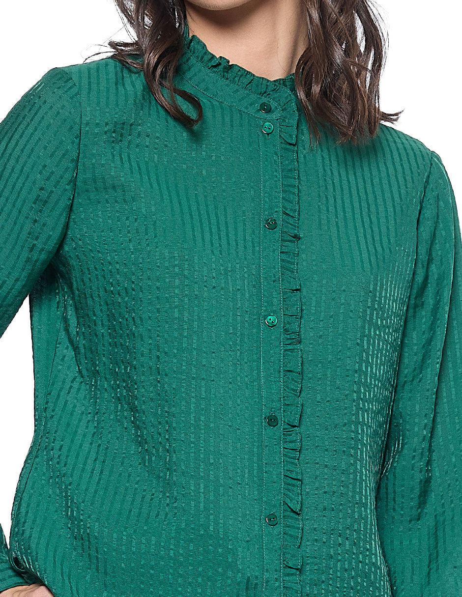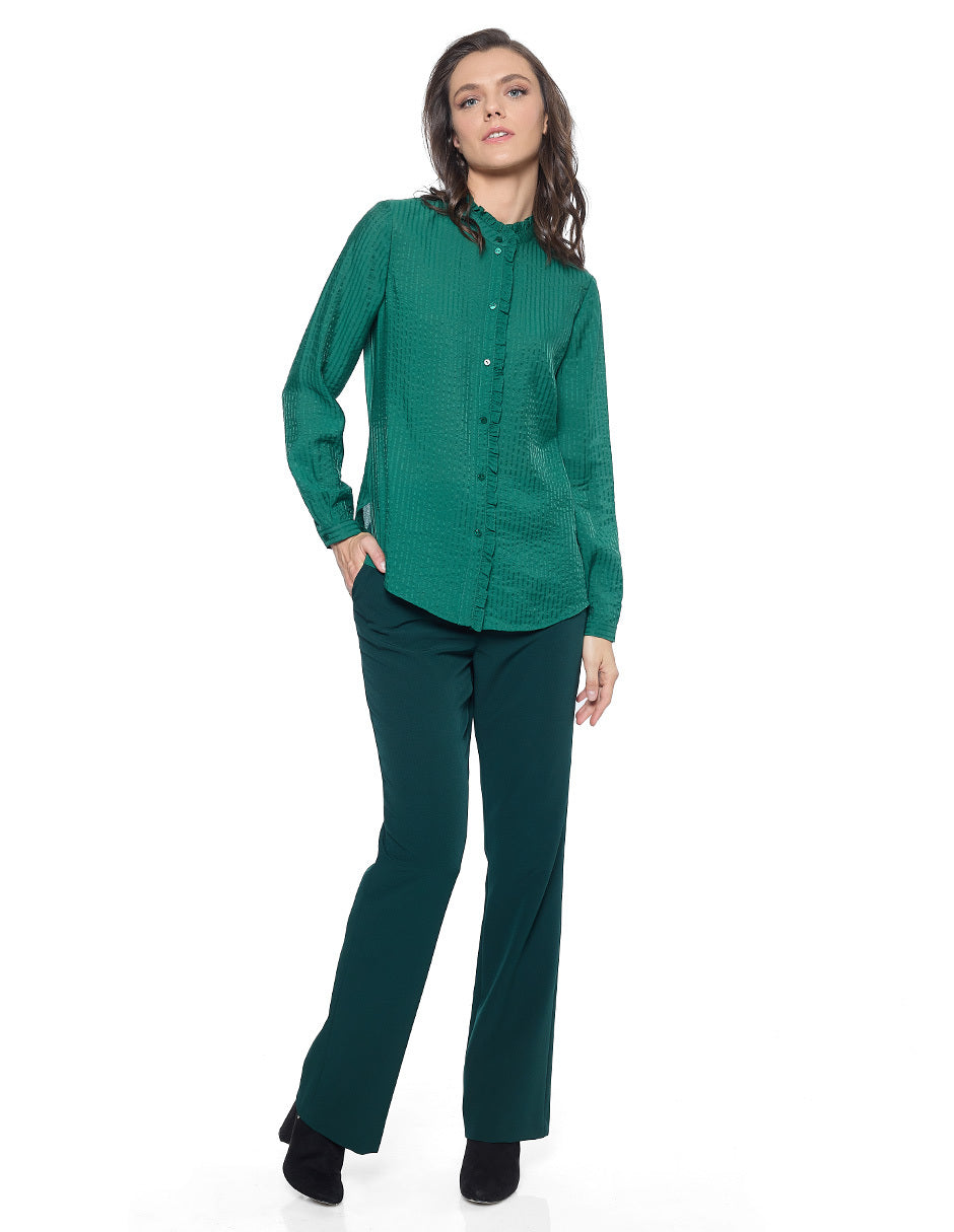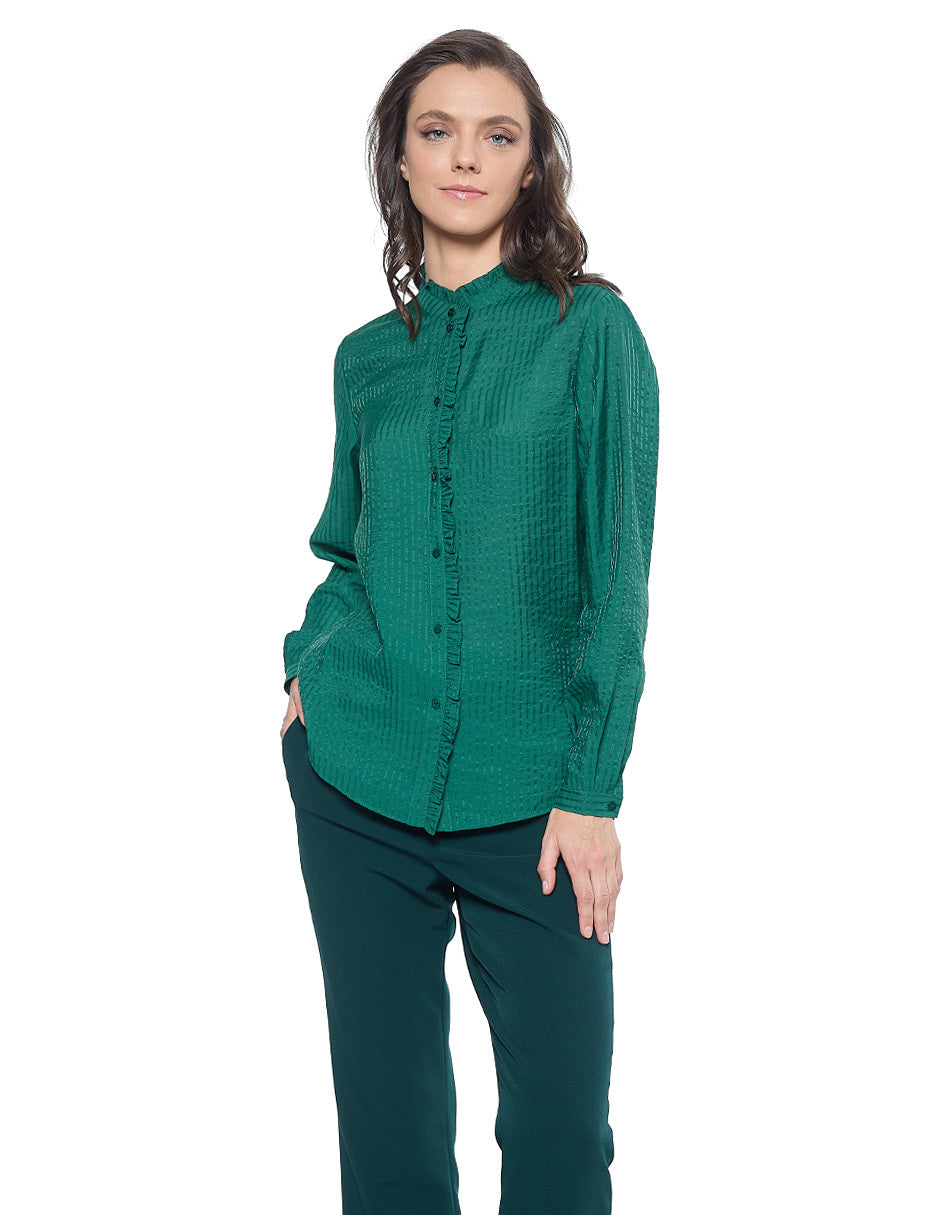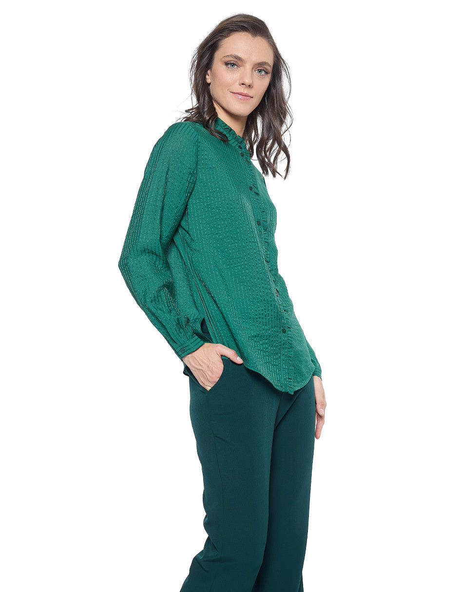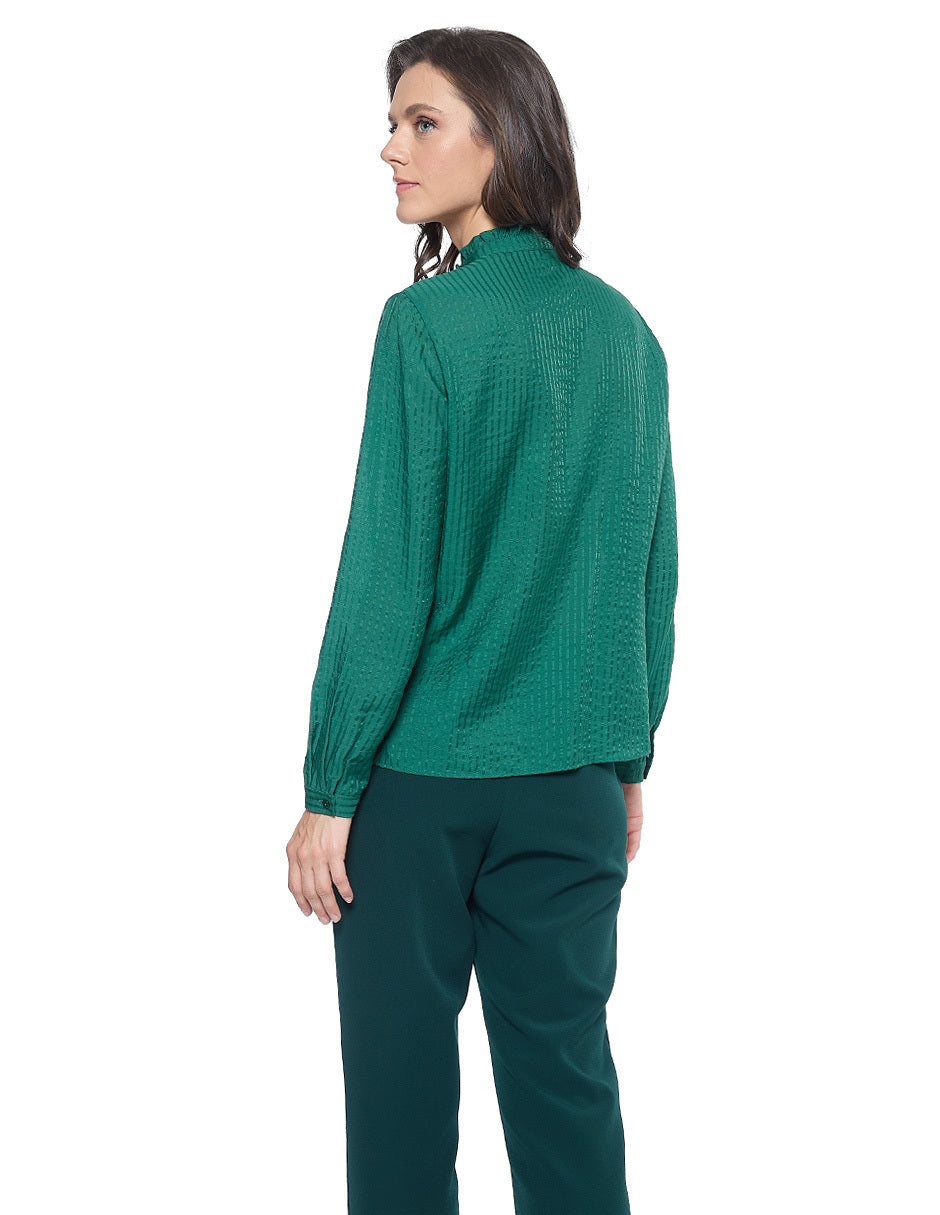Blusa lisa con textura color verde, cuello mao con olan plisado, aberturas en costados,y manga larga con puño