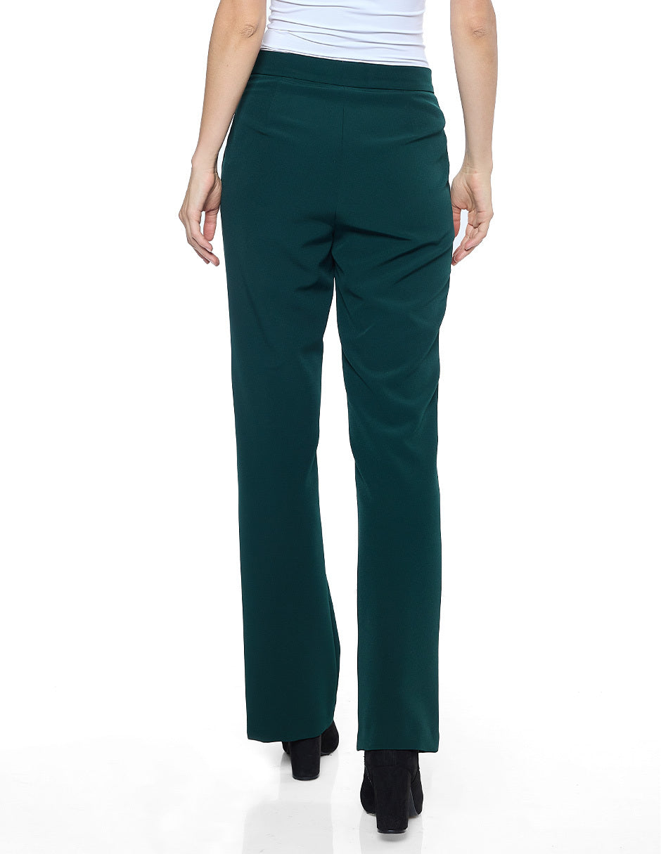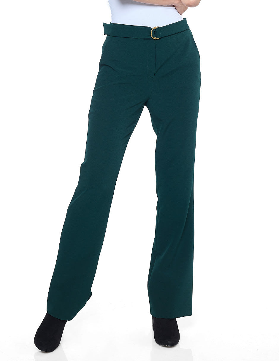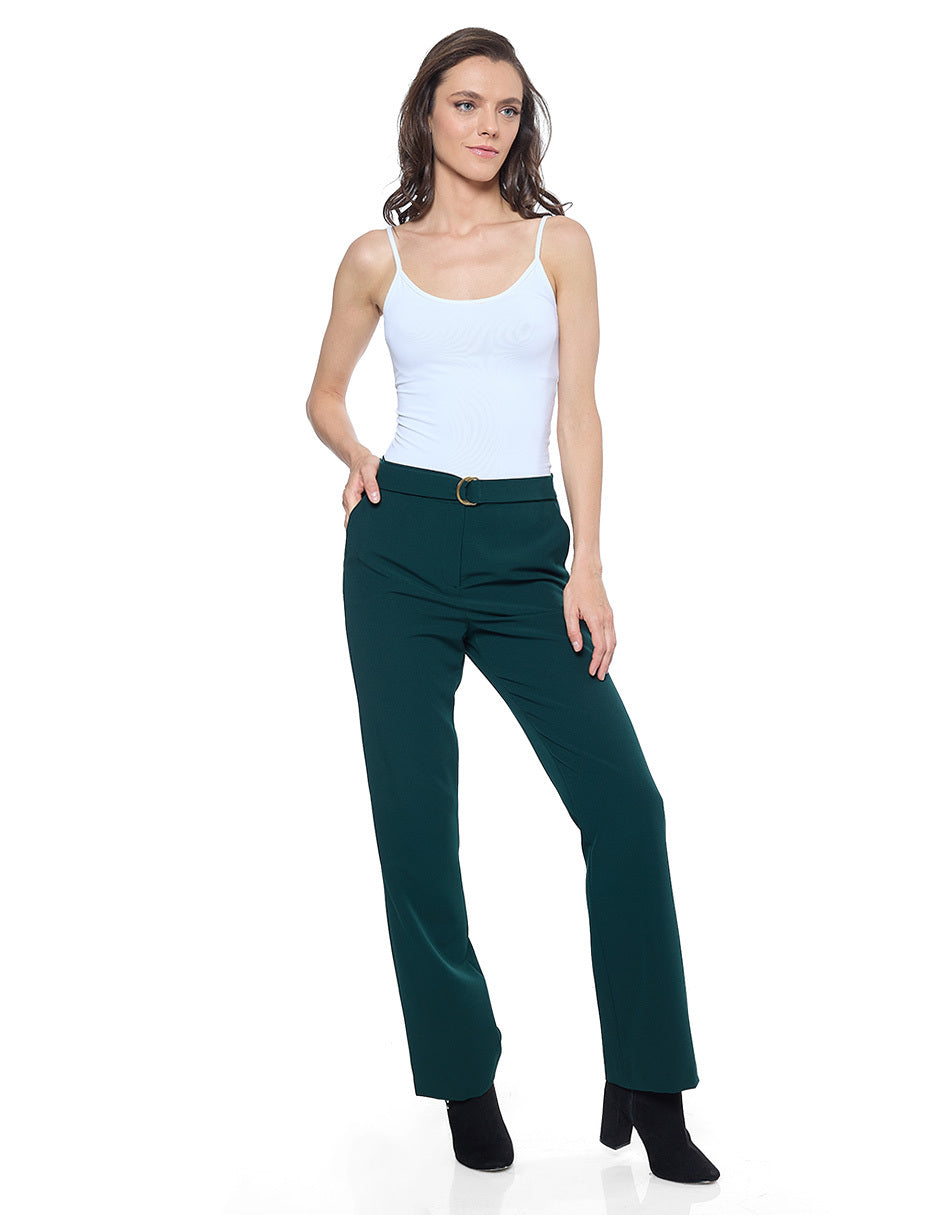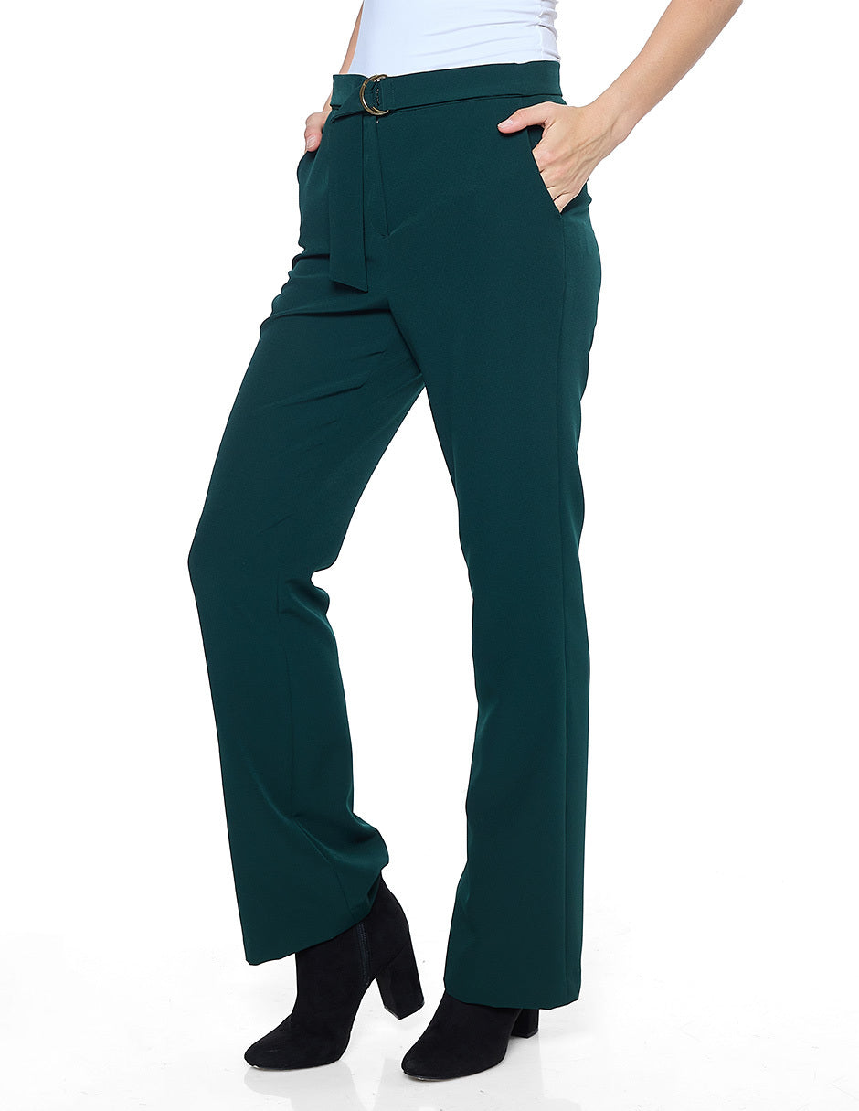 Pantalón liso color verde, cierre al frente, medio cinto con argollas, y bolsas diagonales en costados