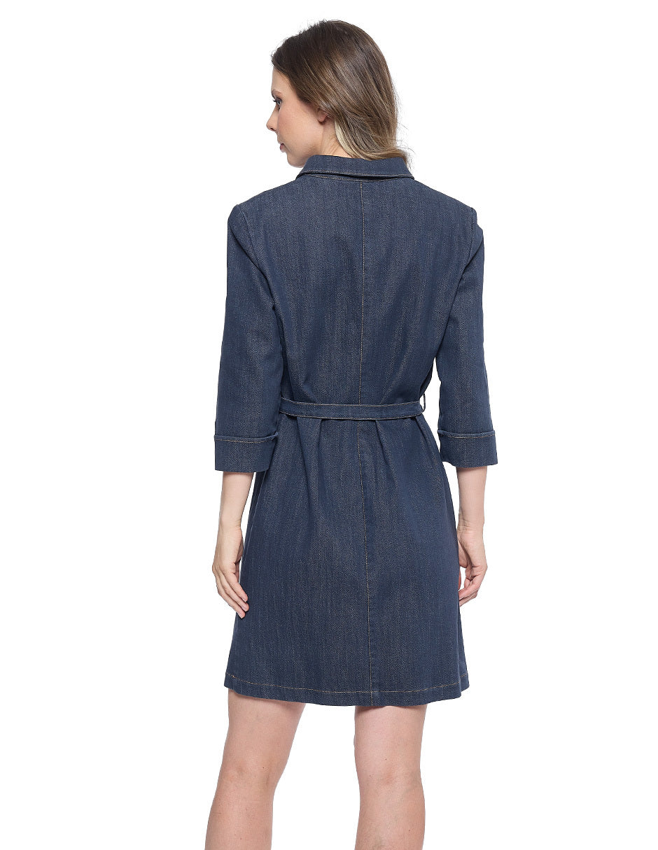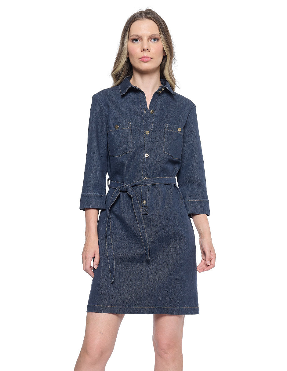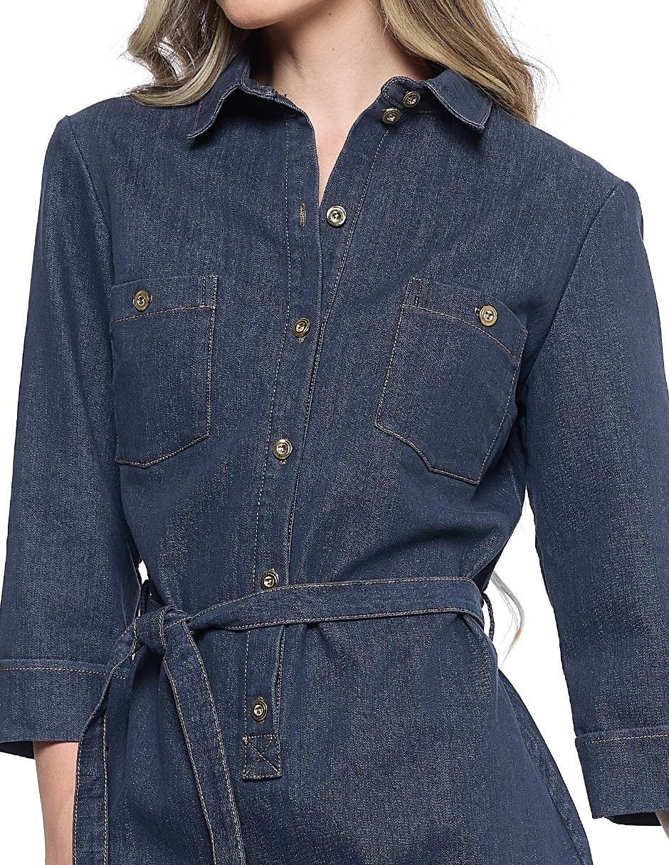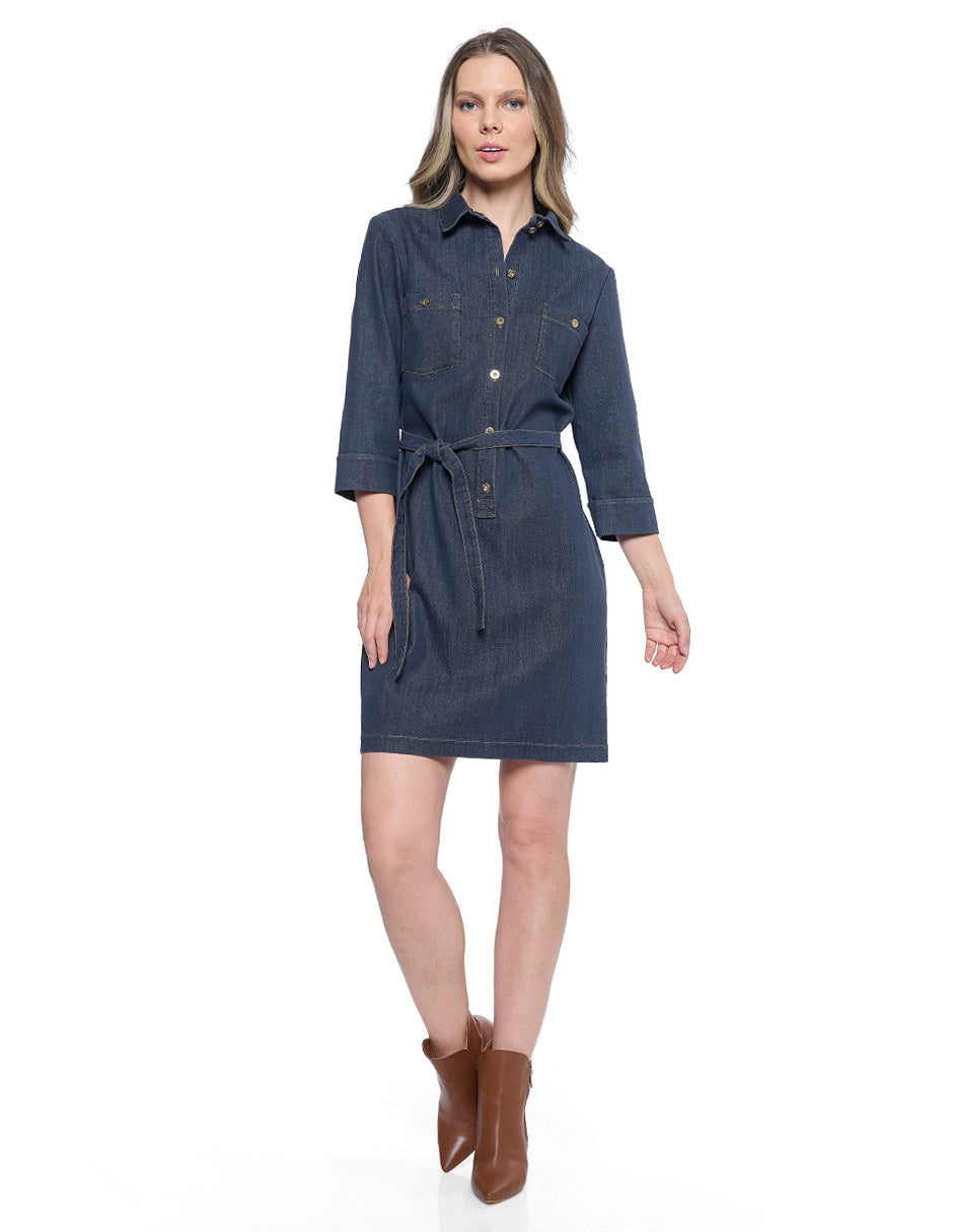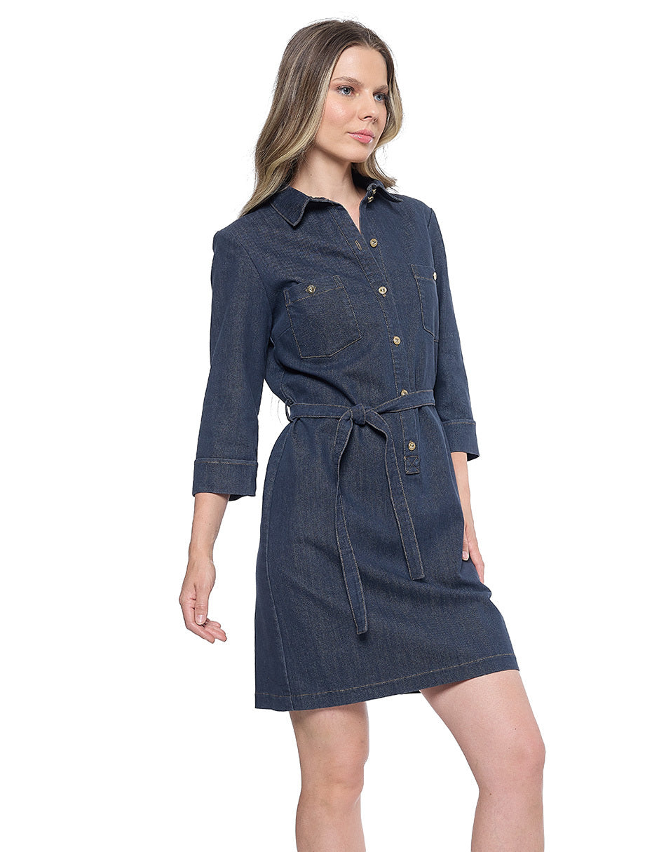 Vestido mezclilla color negro, cuello sport, media aletilla al frente, bolsas de parche, cinto en cintura, manga 3/4 con dobles