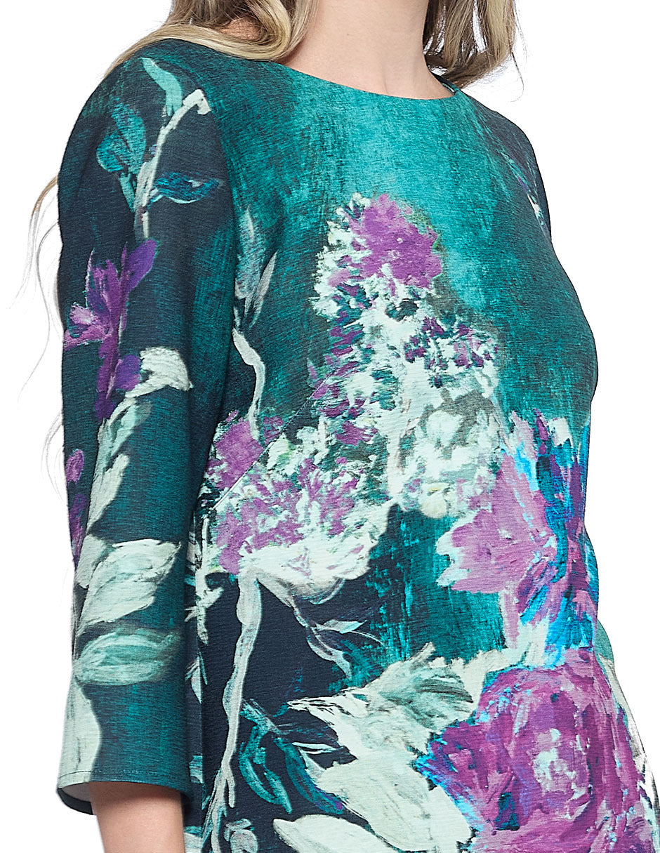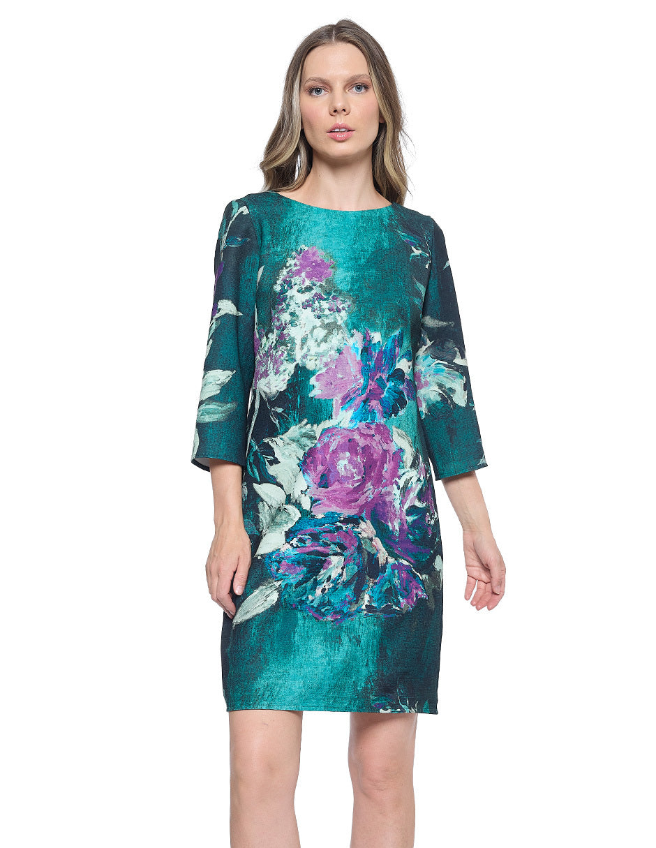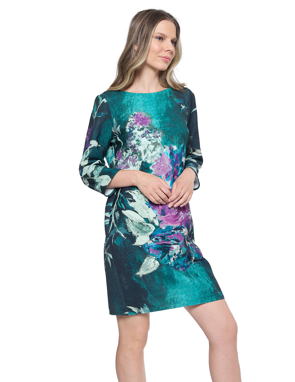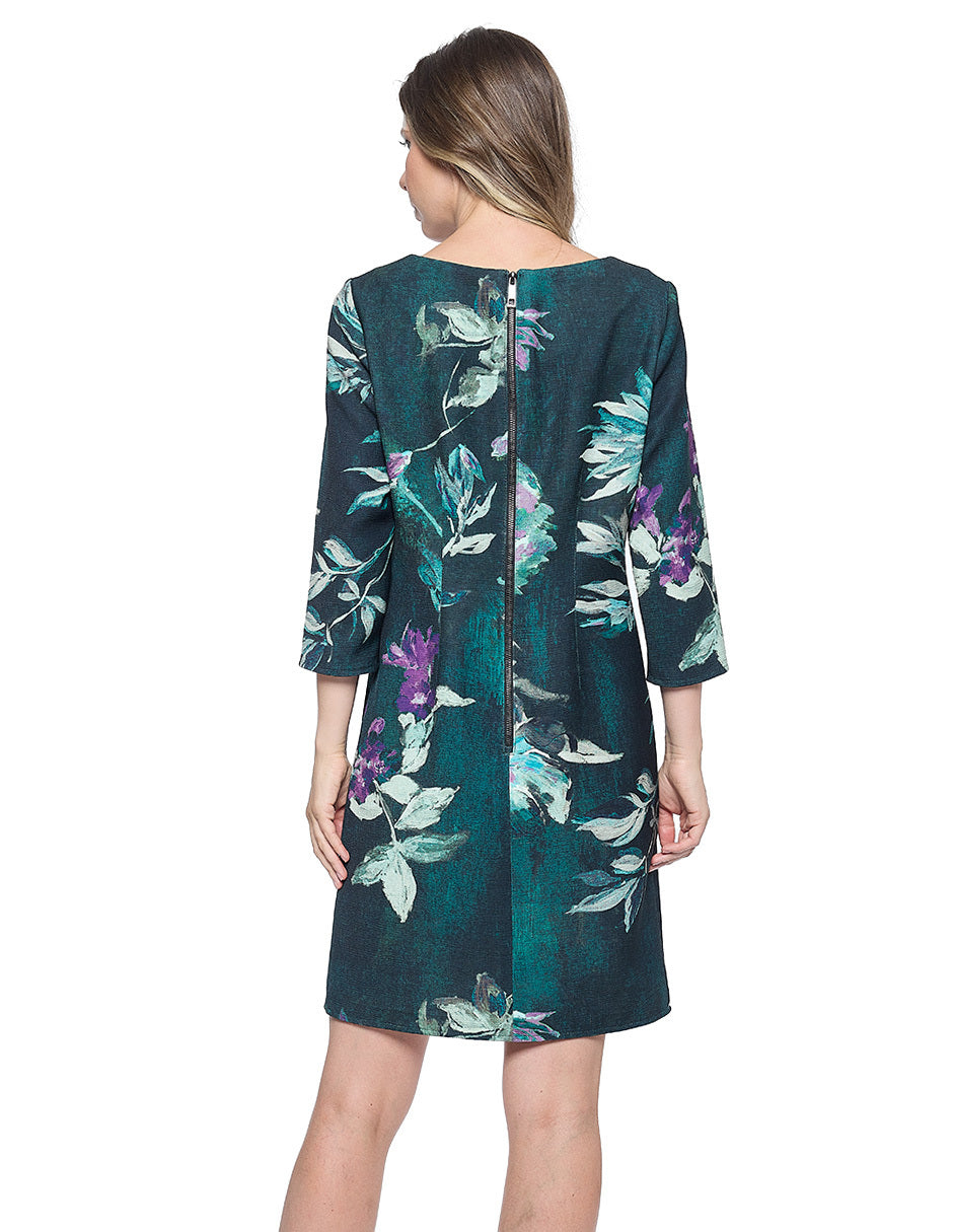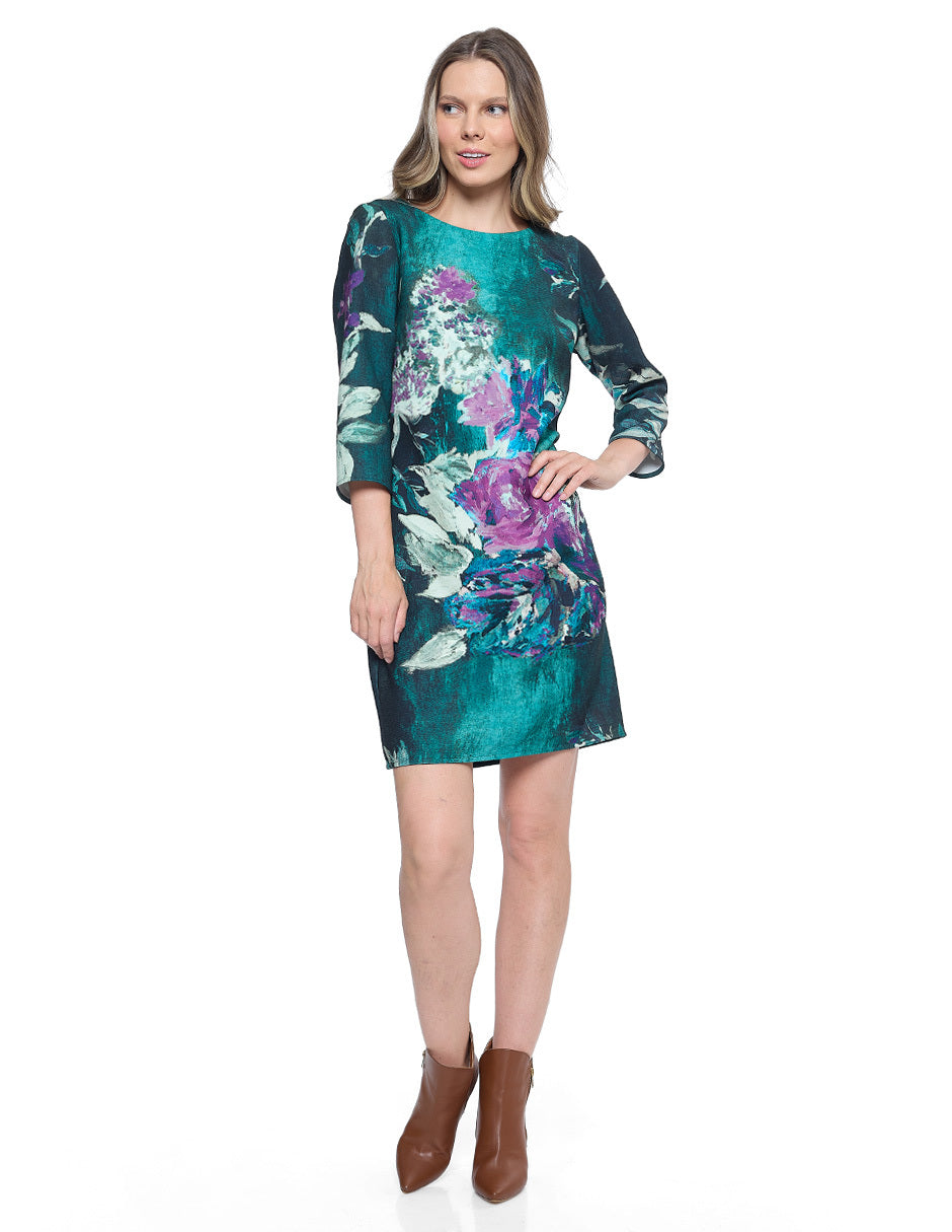 Vestido chemise estampado color verde, escote redondo, cierre trasero, y manga 3/4