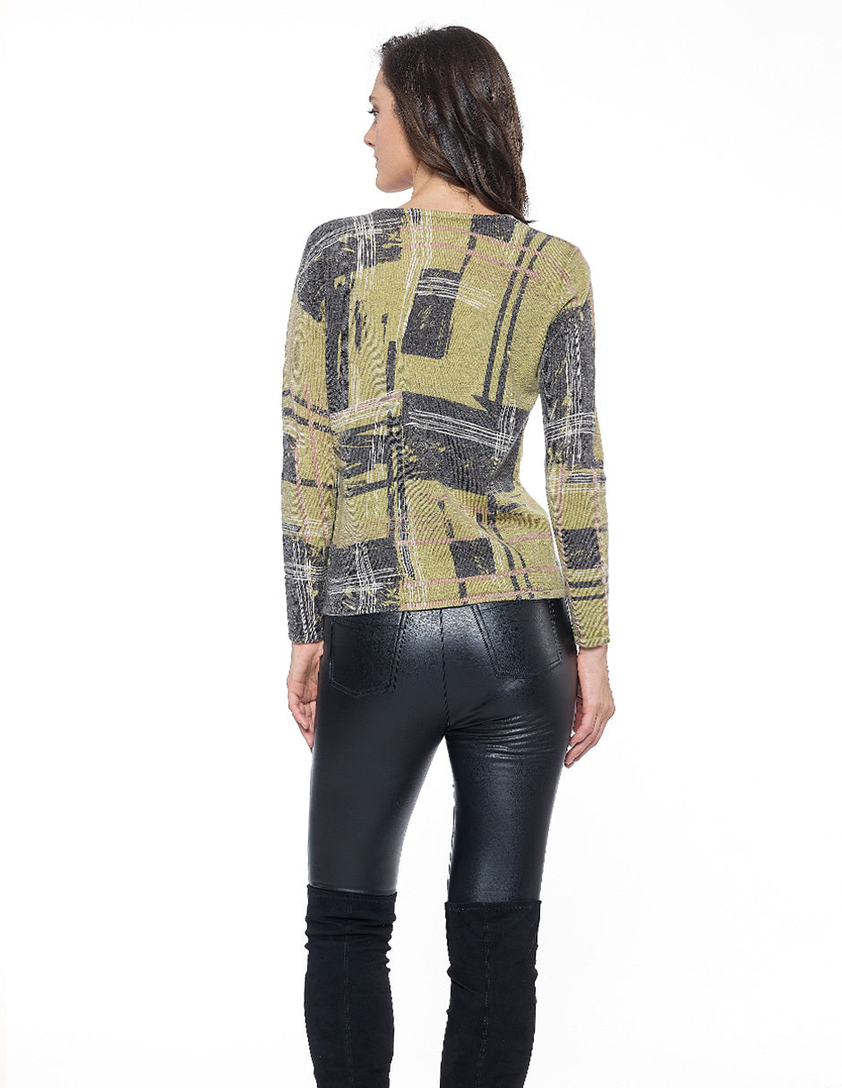 Blusa punto color verde estampado con lurex, escote redondo, y manga larga