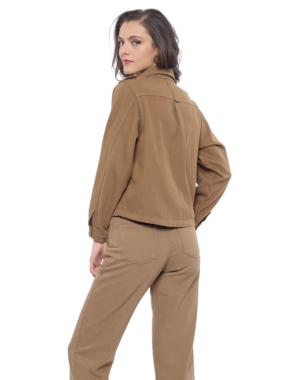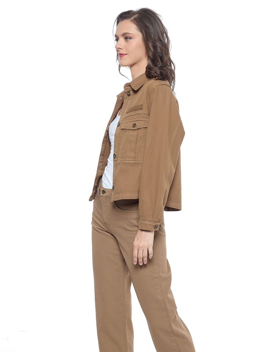 Chamarra algodón lisa color café, cuello sport, bolsas de parche con carteras, charreteras en hombro, y manga larga
