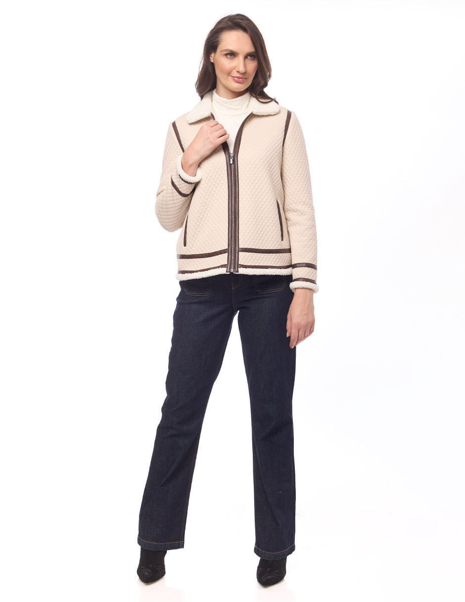 Chamarra capitonada con borrega interior, detalle de bies en tacto pile, cuello sport, cierre al frente, bolsas en costados, y manga larga