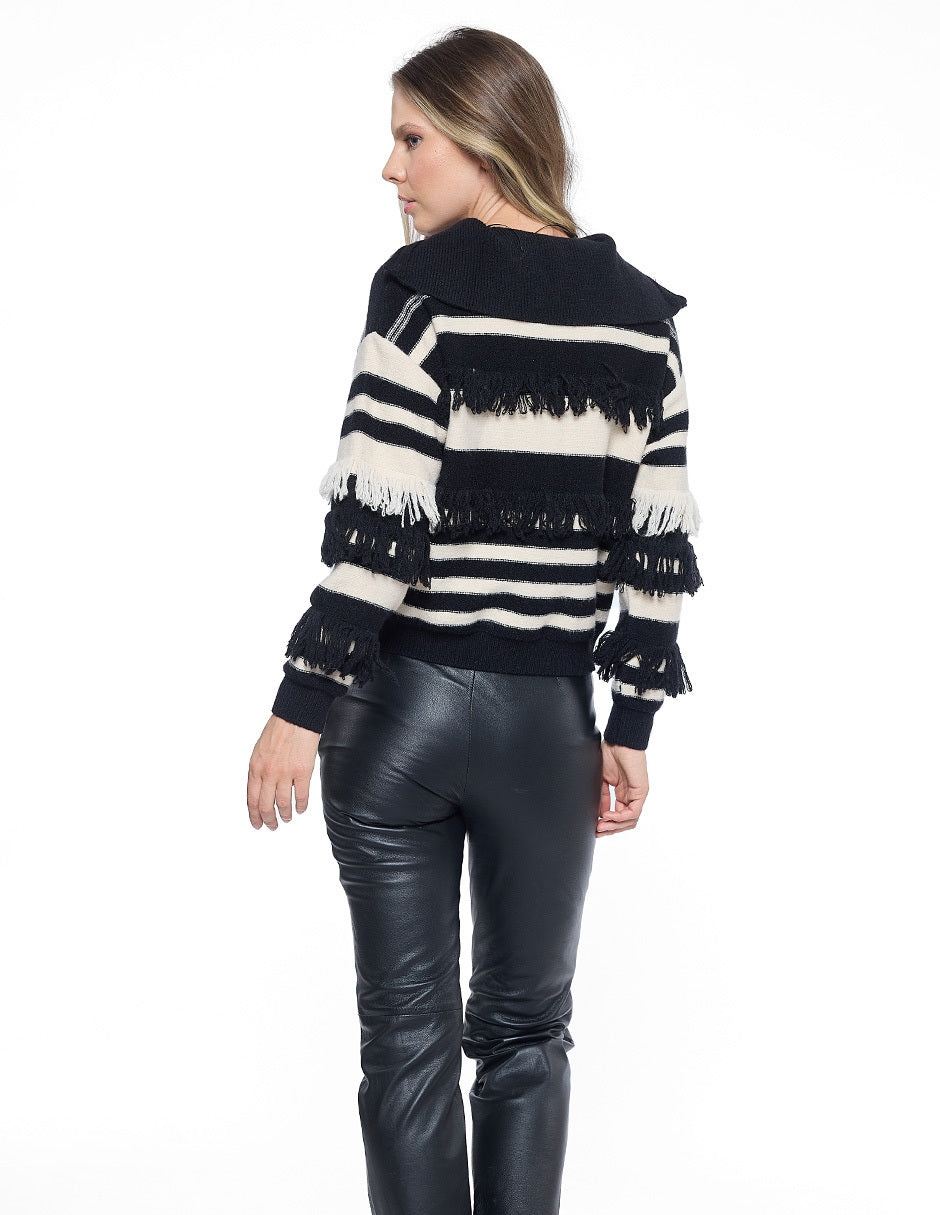 Suéter liso con franjas combinadas, cuello alto con cierre, flecos en talle y mangas