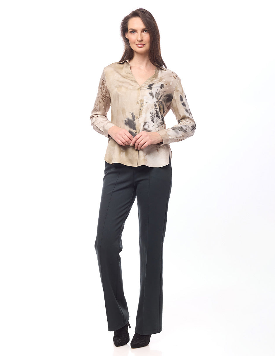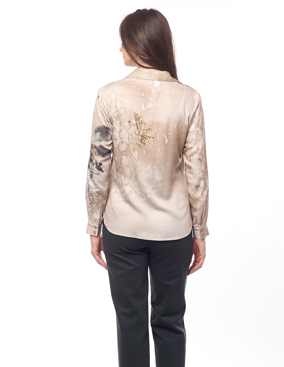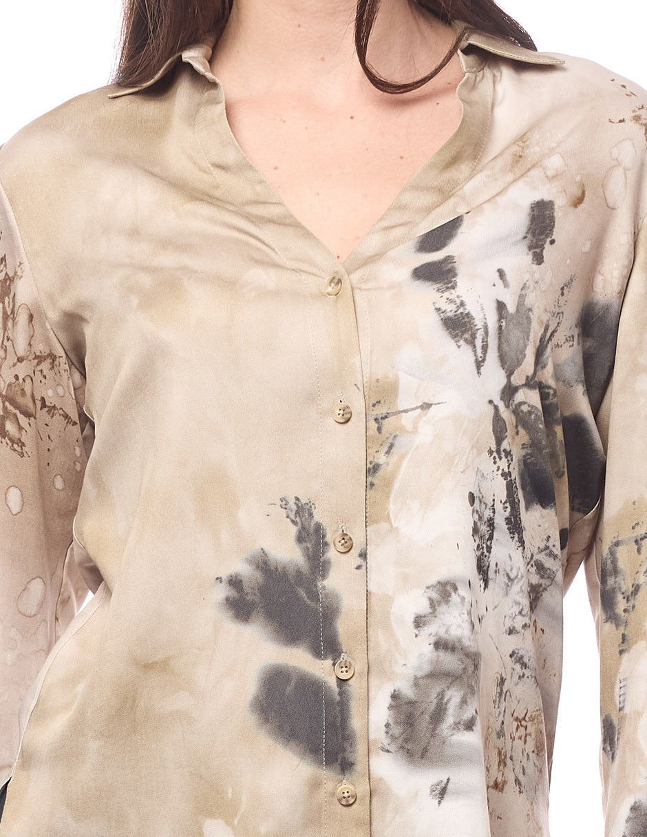 Blusa estampada, cuello sport, escote V, aletilla a frente con botones, forma en ruedo, manga larga con puño