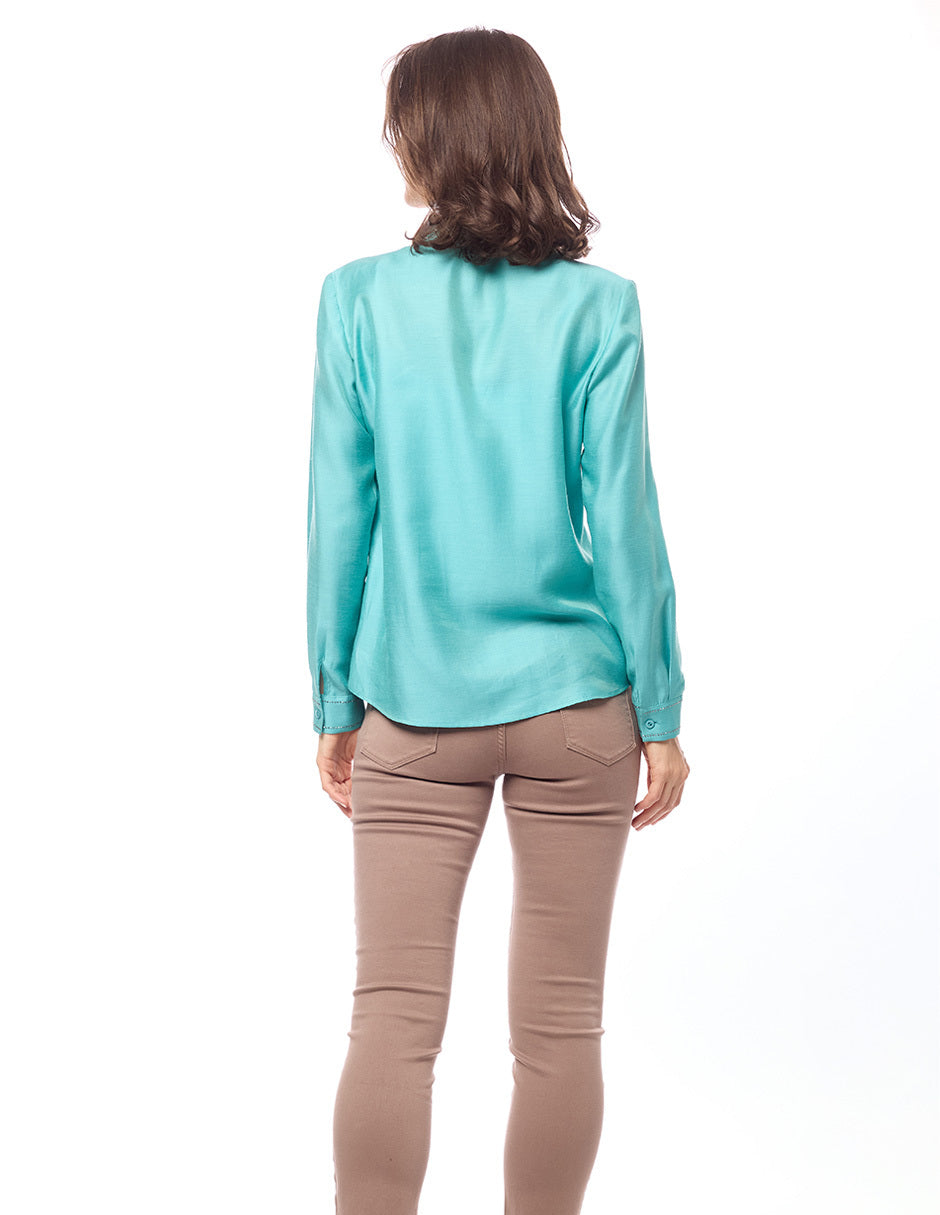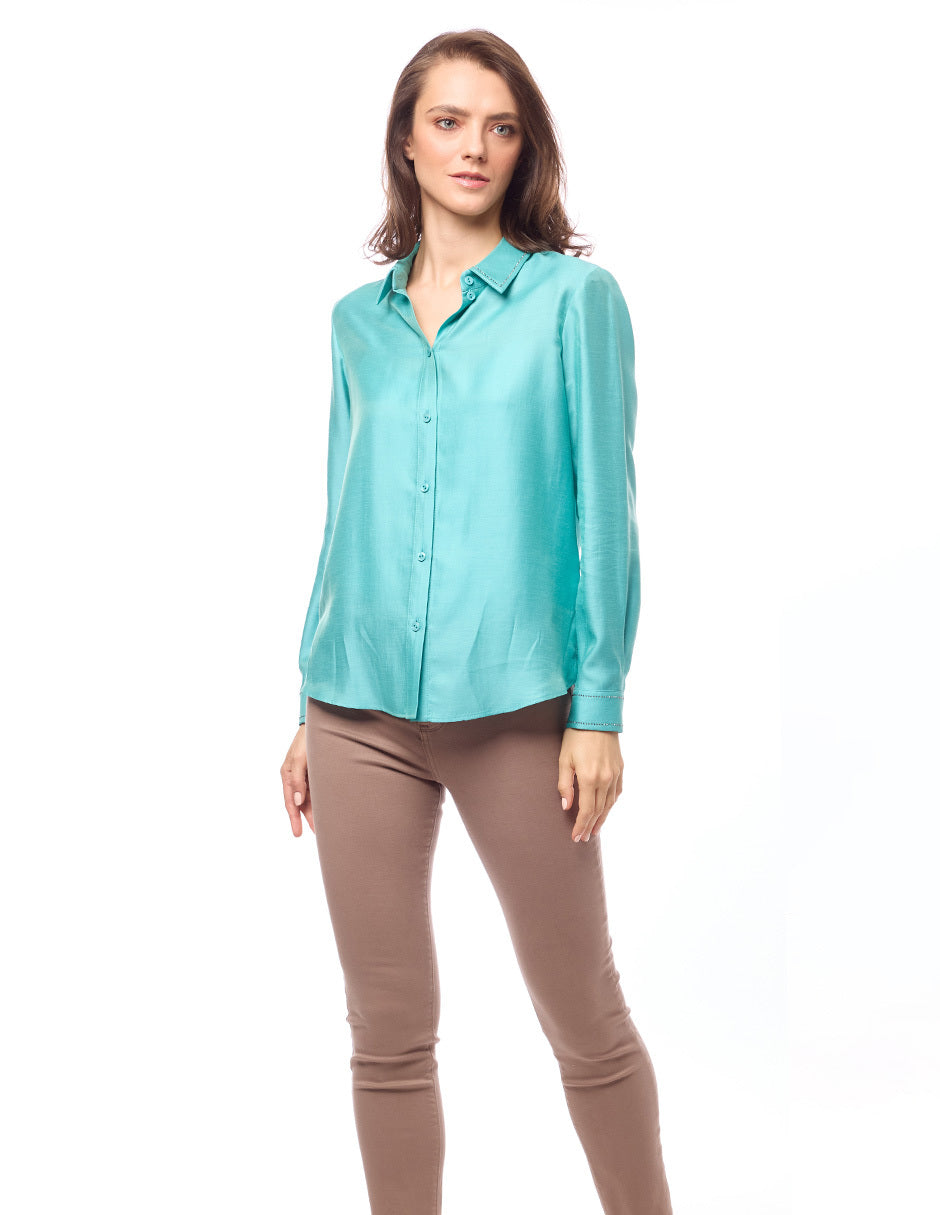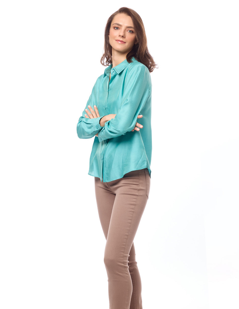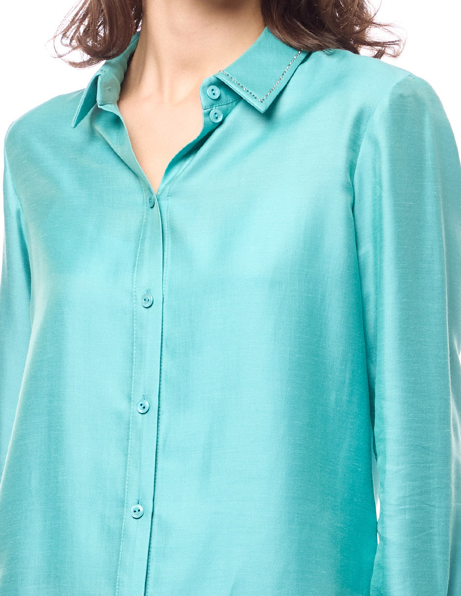 Blusa camisera lisa, detalle de transfer en cuello, aberturas en ruedo, manga larga con puño