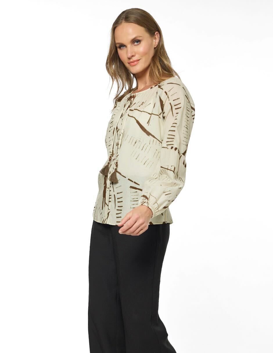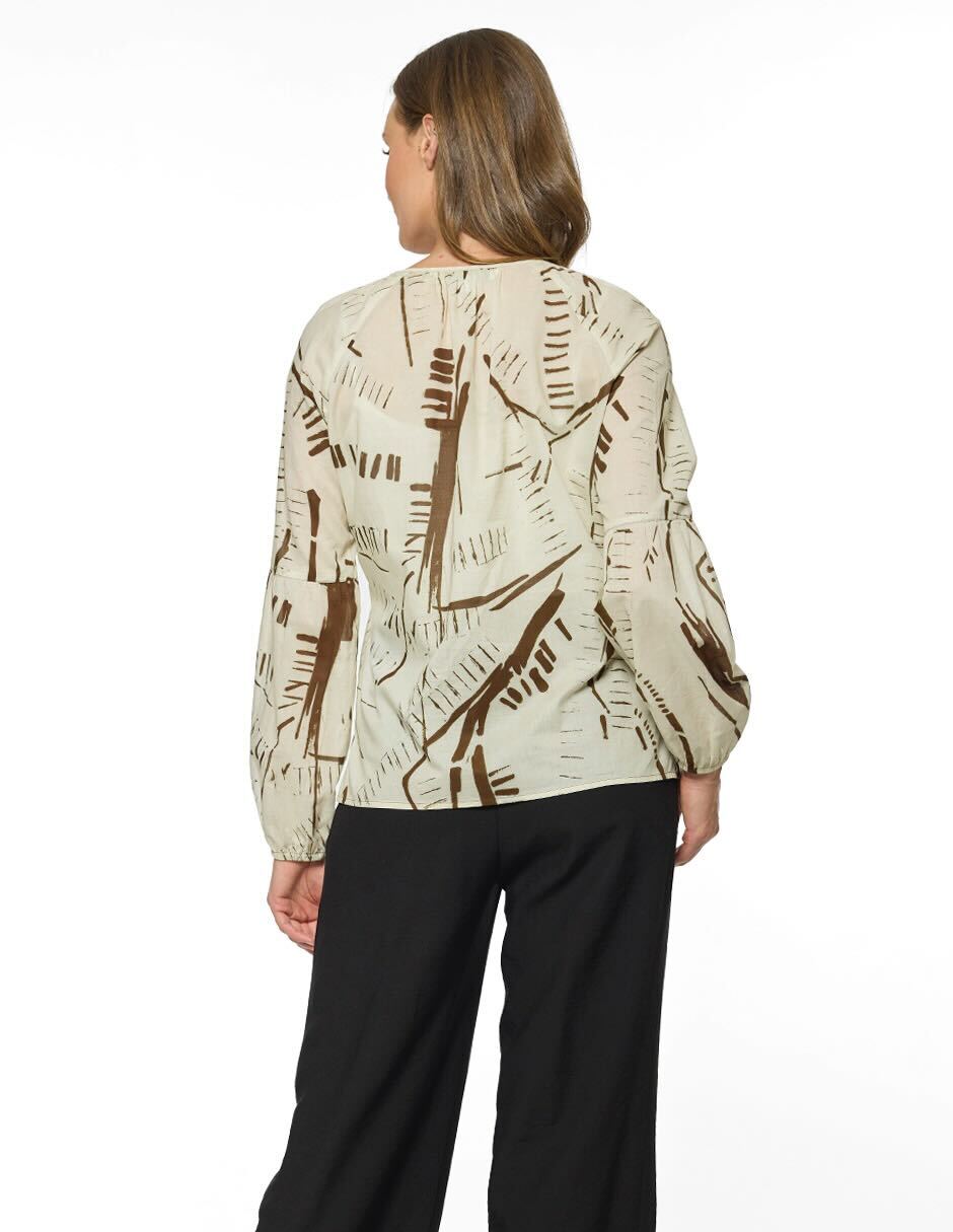 Blusa estampada, cuello redondo terminado en V con jareta y aletilla al frente, manga ranglan larga con corte y pliegues, elástico en puño