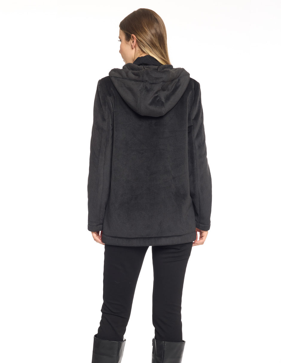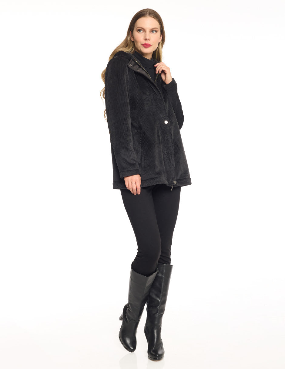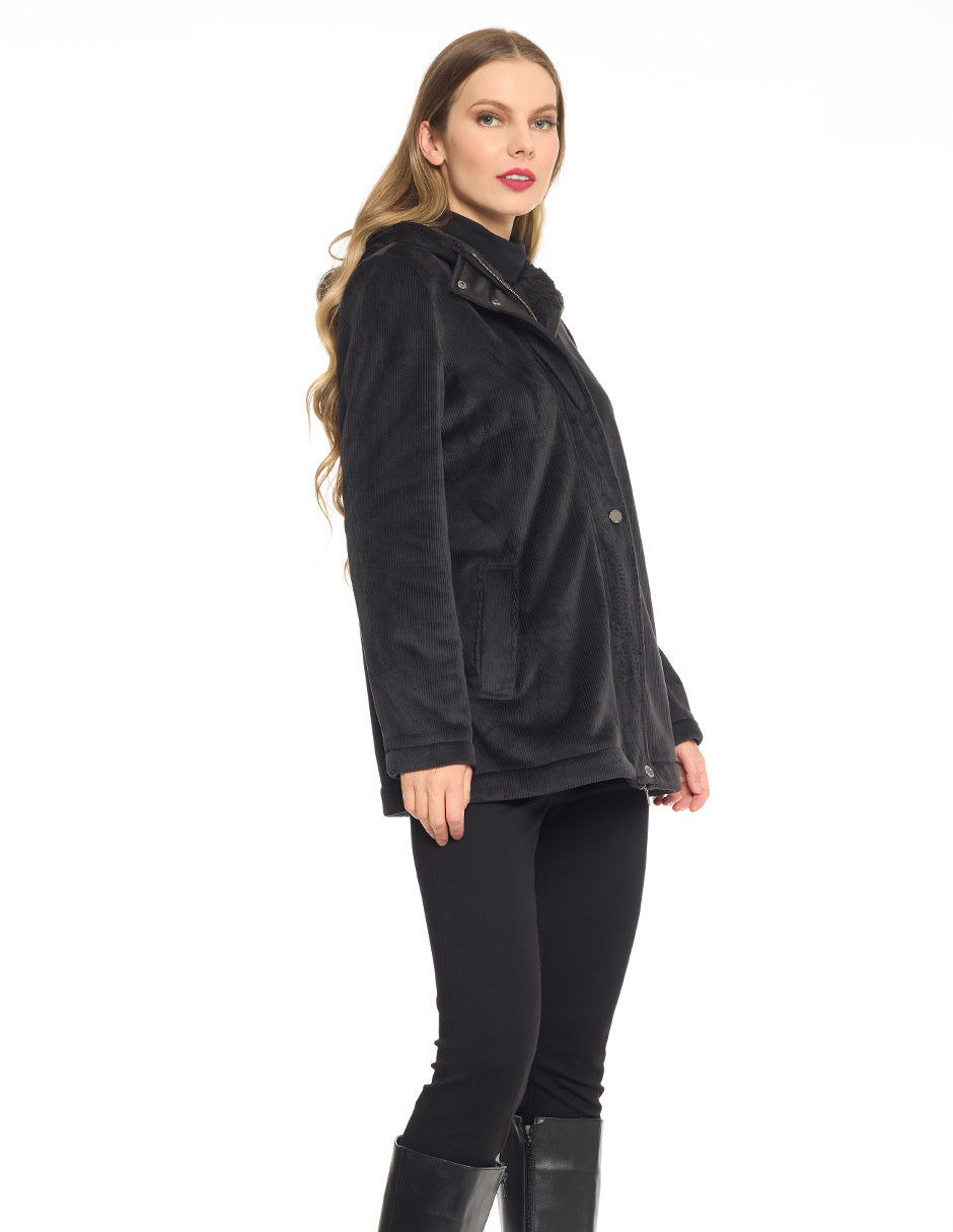 Chamarra de pana, capucha integrada, cierre al frente, taba con broches, bolsas de vivo en costados, manga larga con elástico en puño y ruedo