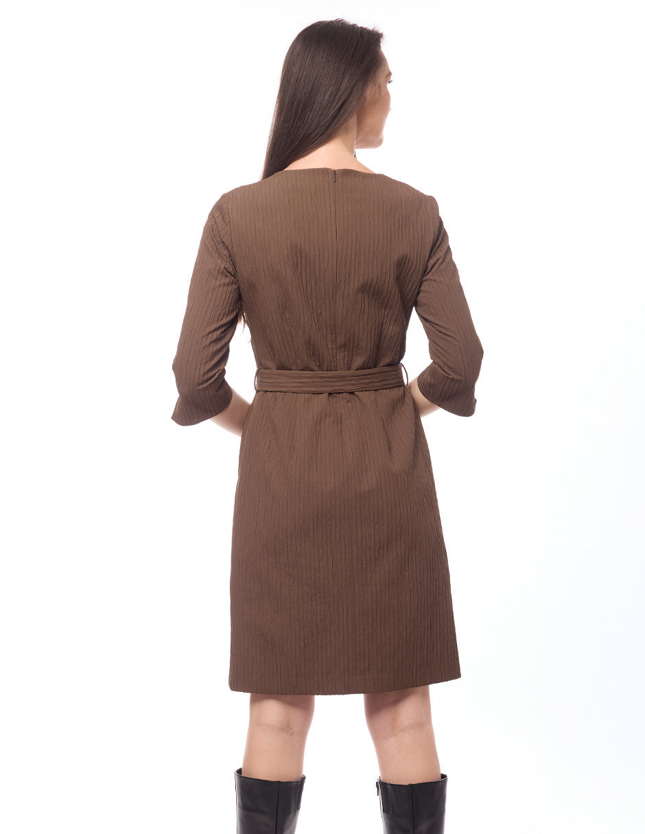 Vestido chanel liso corrugado, escote redondo, cierre trasero, amarre en cintura, manga 3/4 con abertura