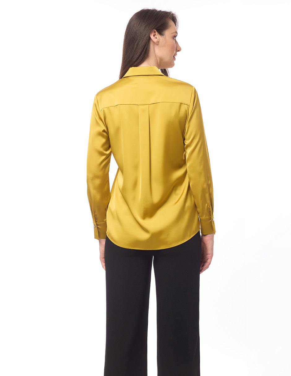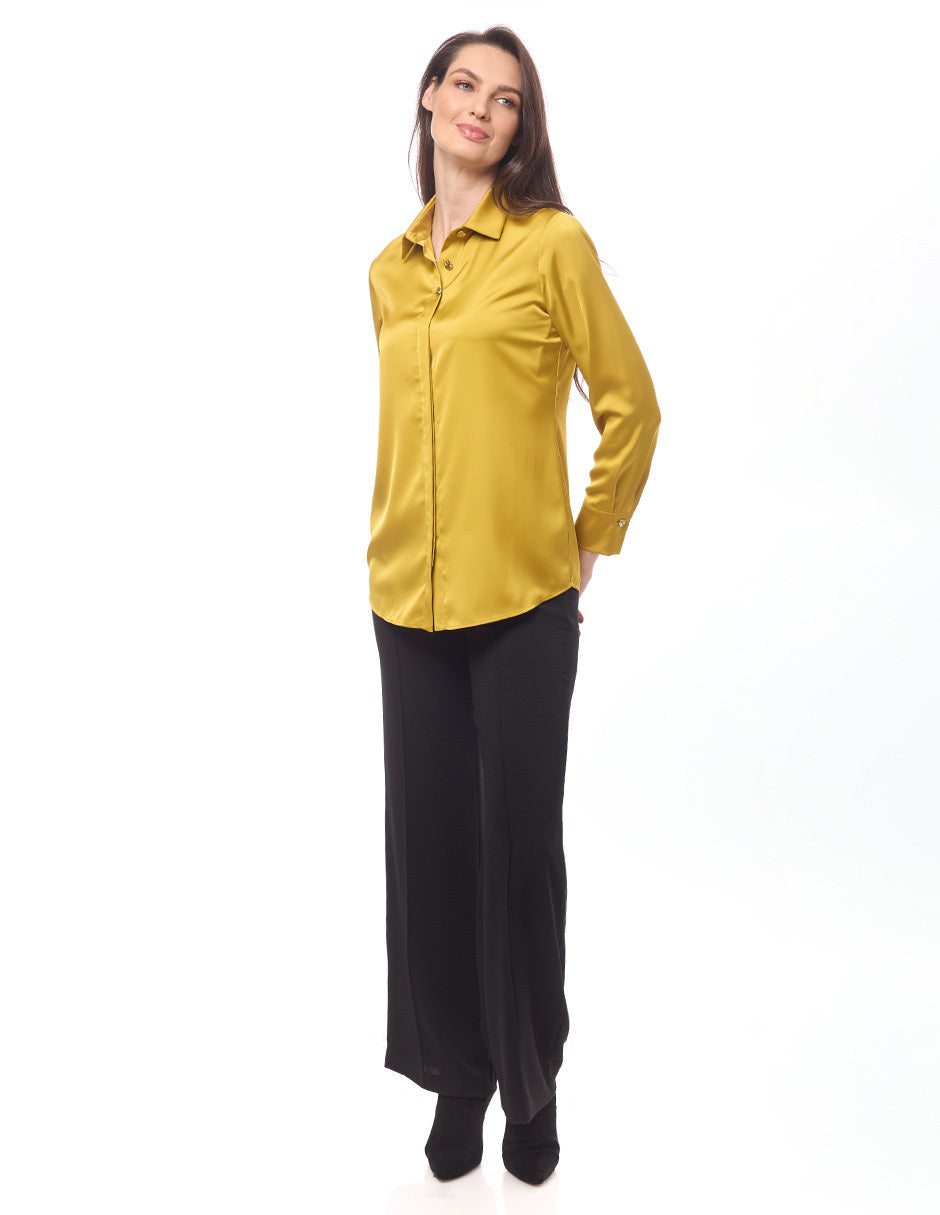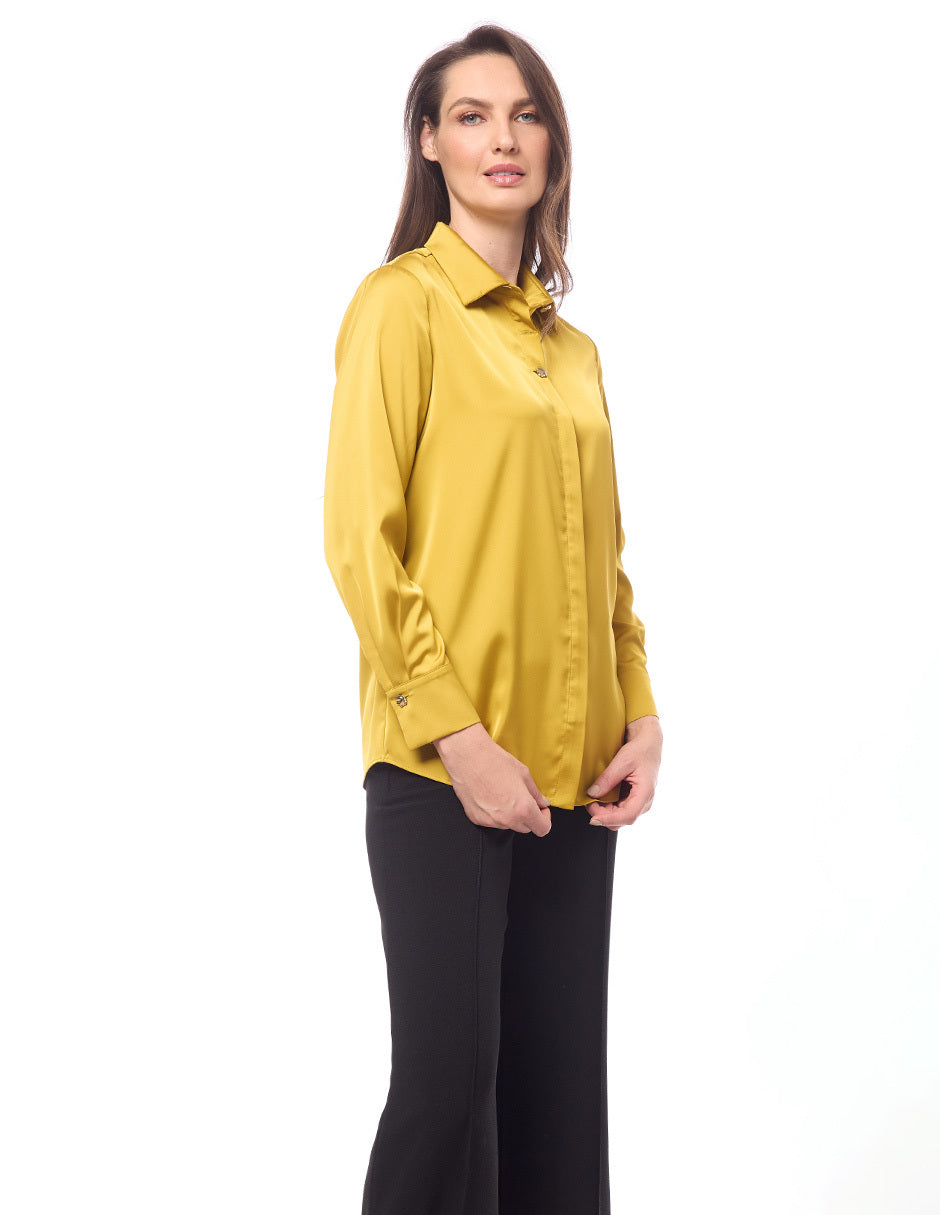 Blusón liso camisero, aletilla oculta, botones decorativos superiores, manga larga con puño