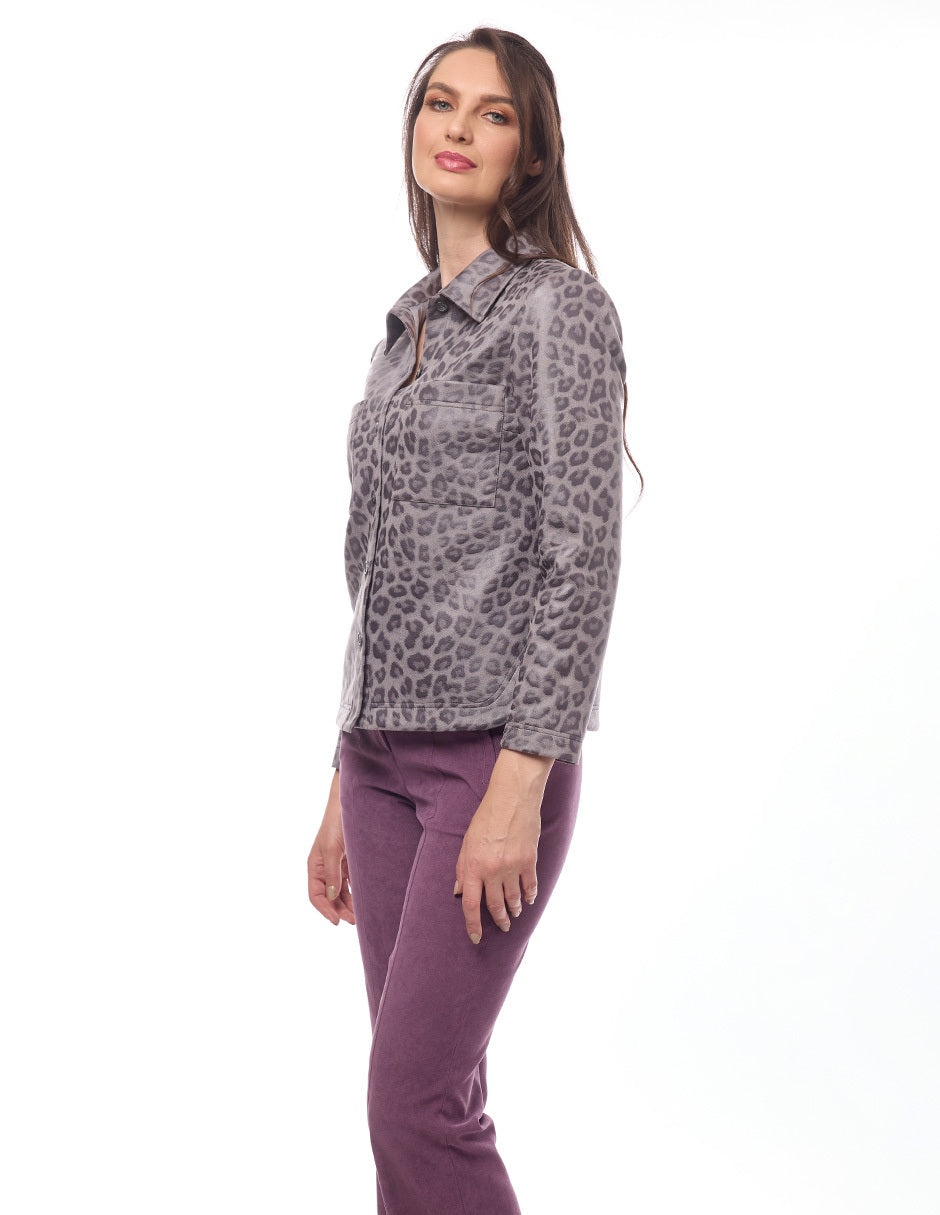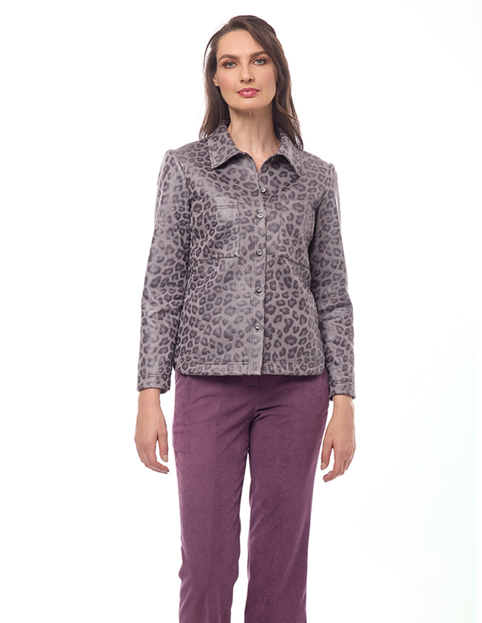 Chamarra estampado animal print color gris, cuello sport, bolsas de parche botones al frente, forma en ruedo, y manga larga