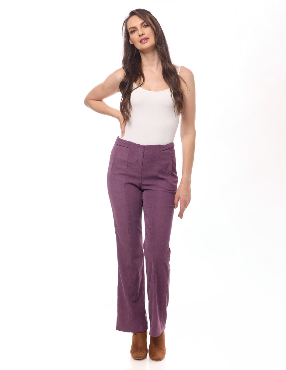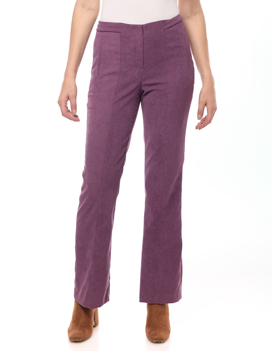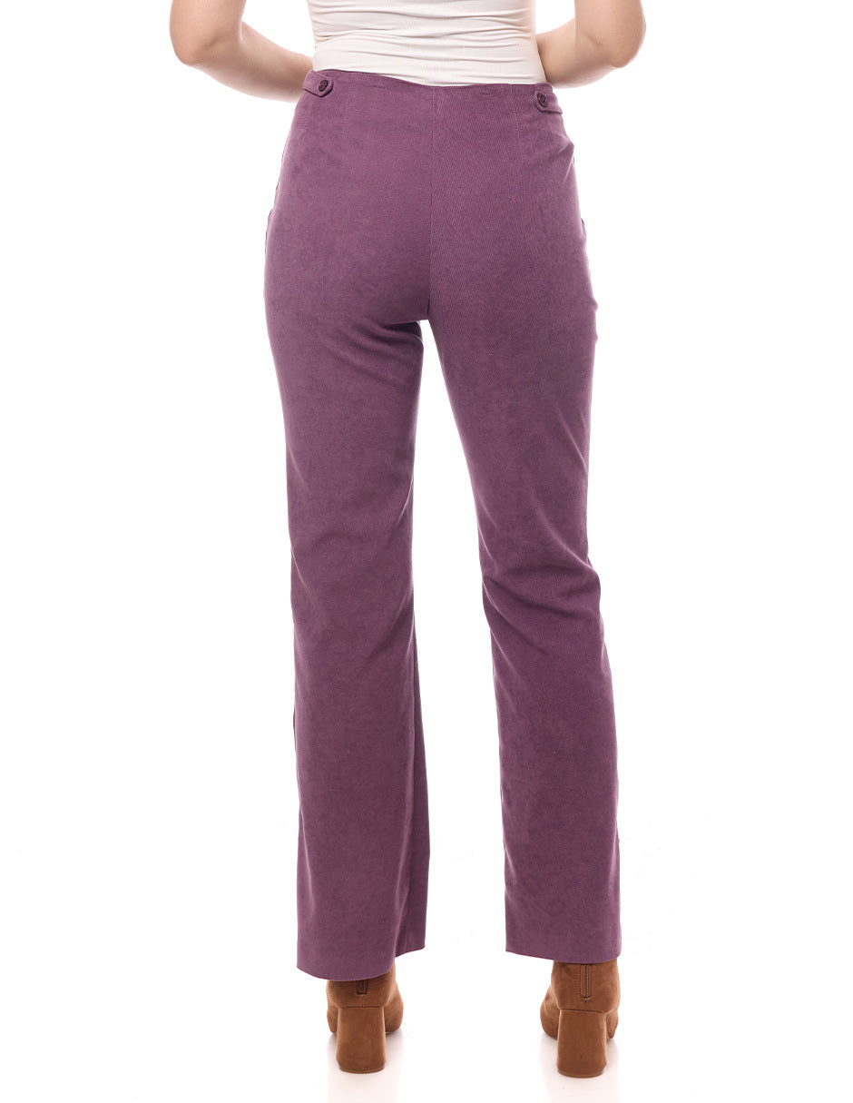 Pantalón liso color morado sin pretina, cierre y corte al frente, charretera en cintura con botón, y bolsas vivos en costados