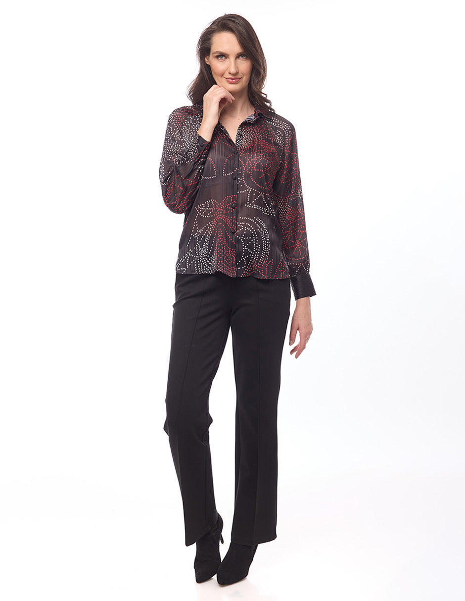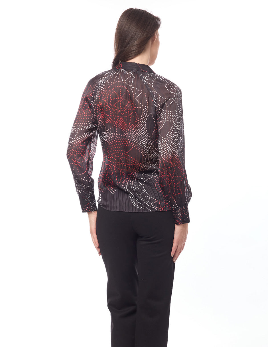 Blusa camisera estampada, aberturas en costados, manga ranglan larga con puño