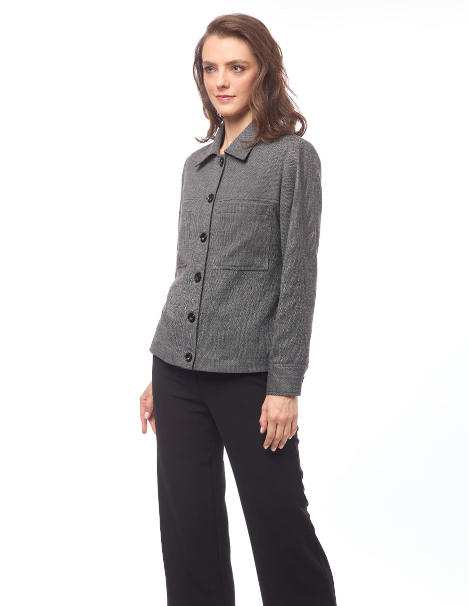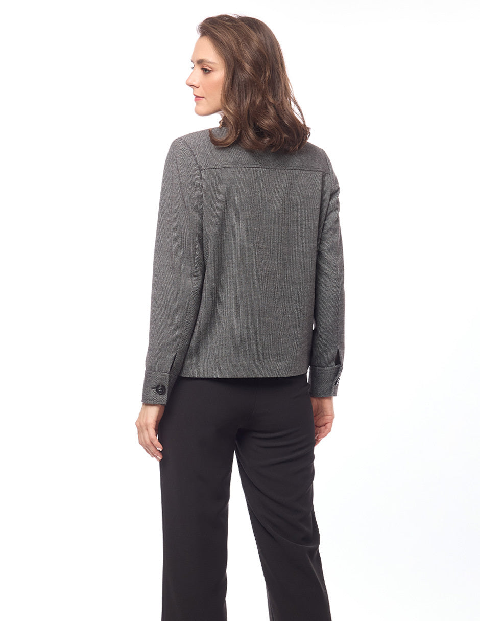 Chamarra estampado de palma, cuello sport, botones al frente, corte canesú bolsas de parche, manga larga con puño