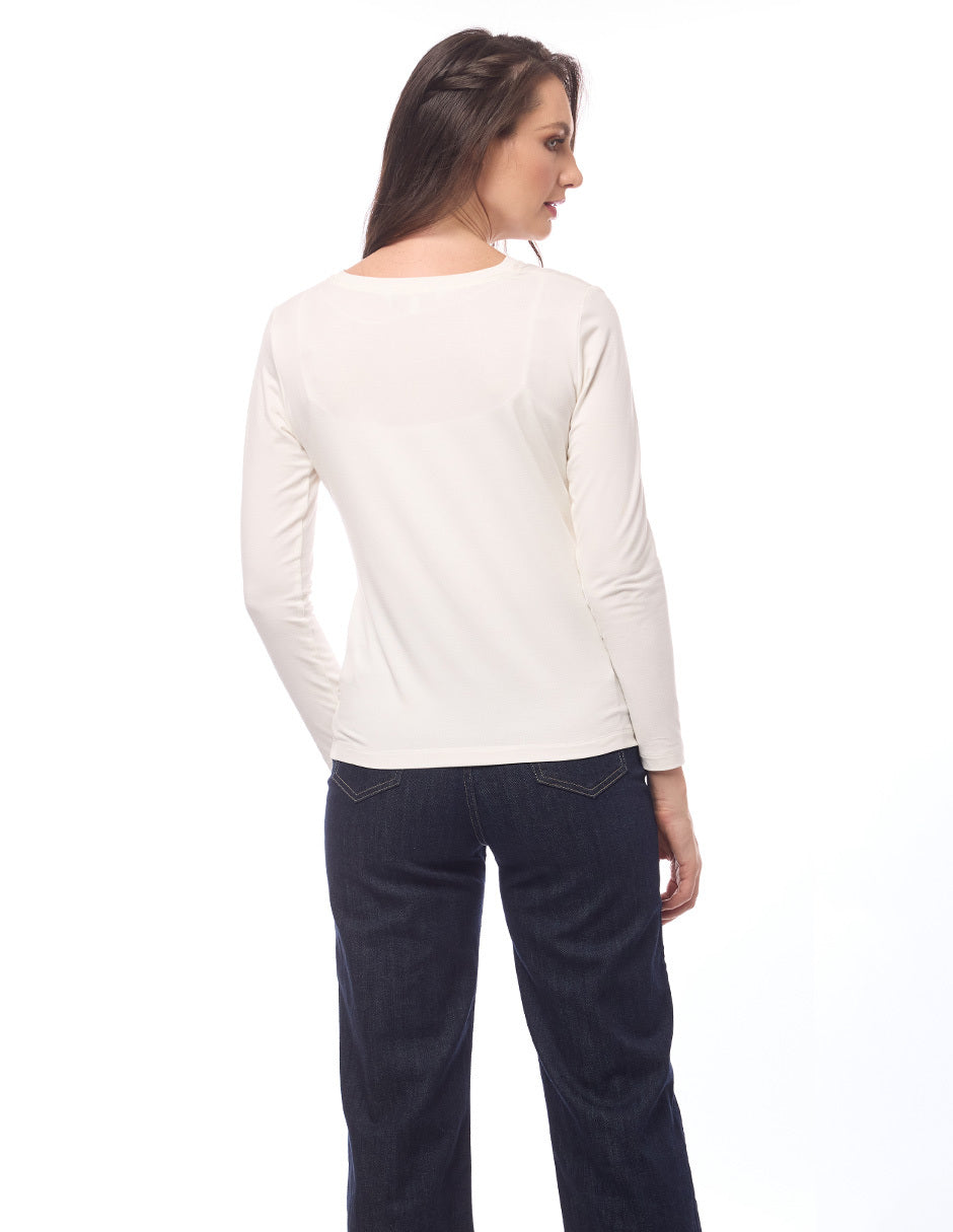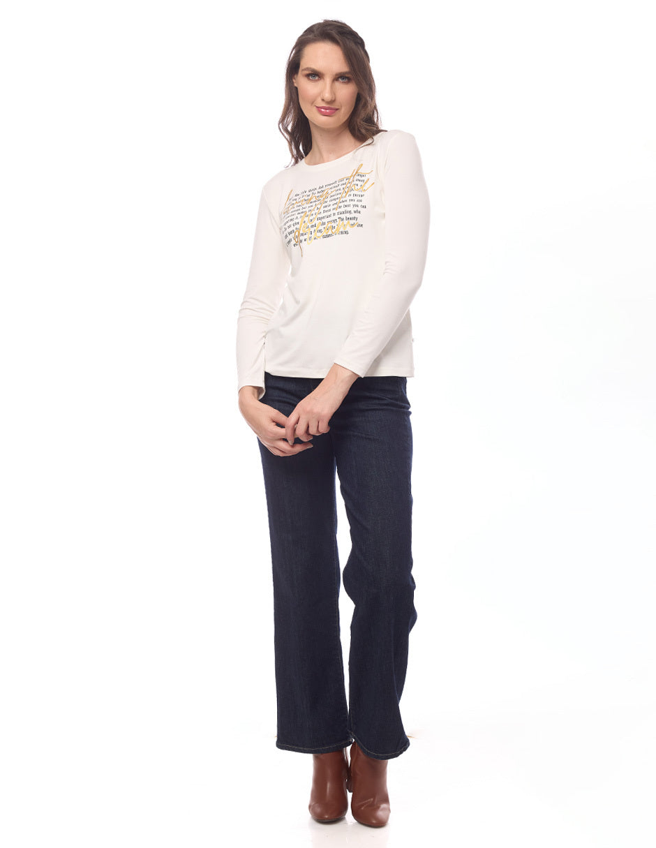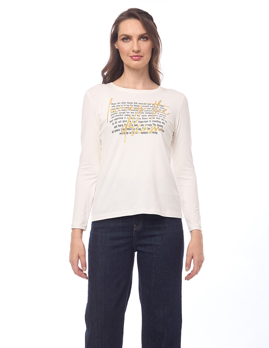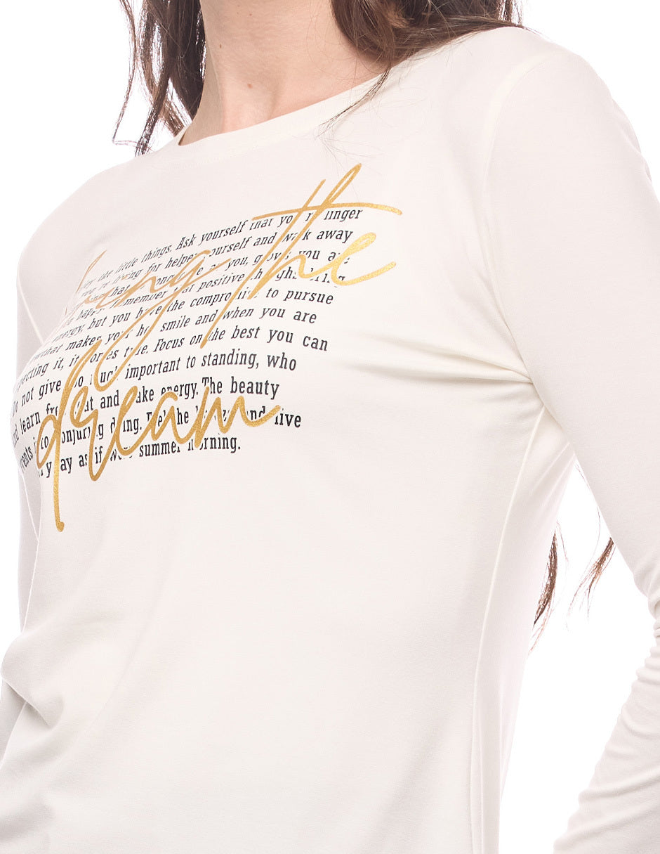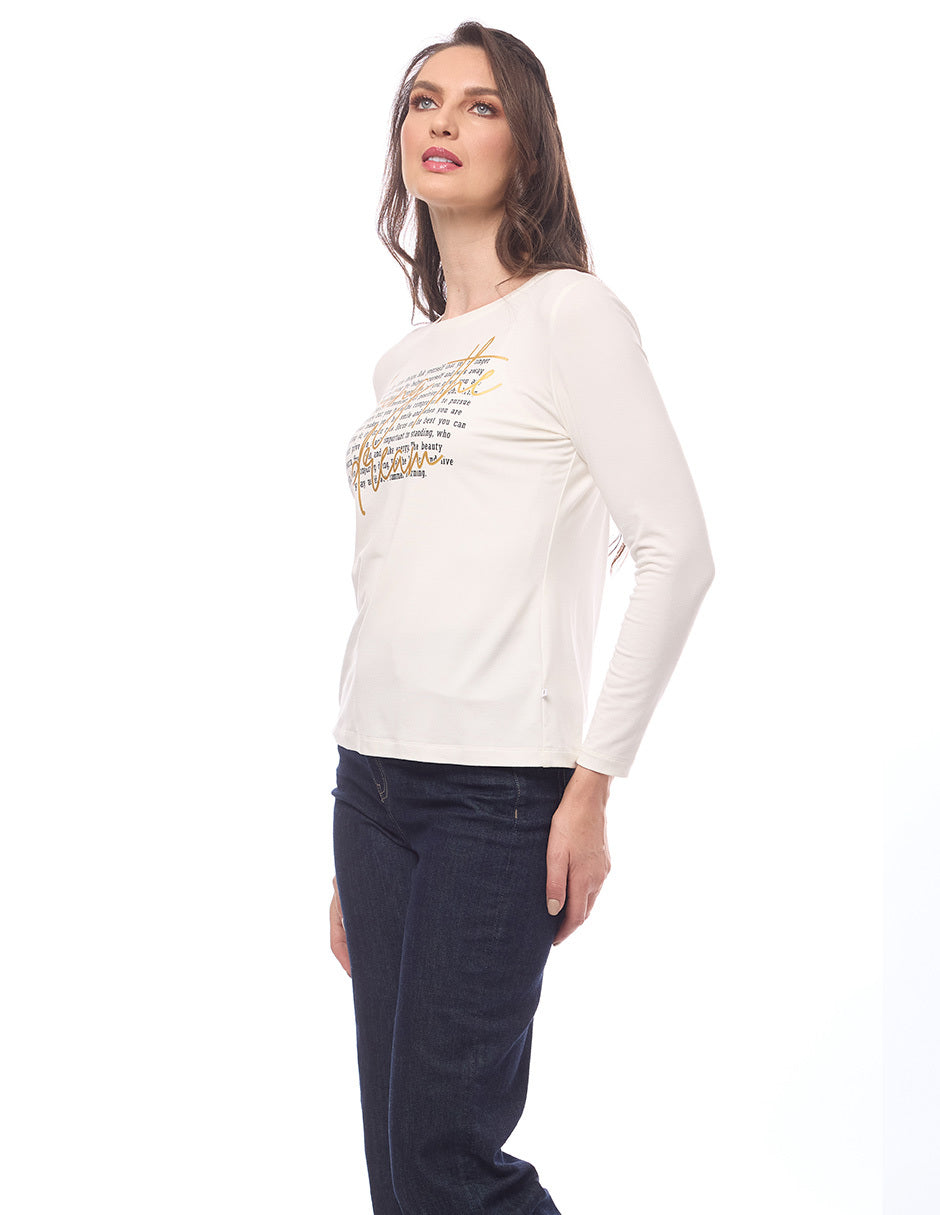 Blusa lycra lisa color hueso, escote redondo, estampado de letras, y manga larga