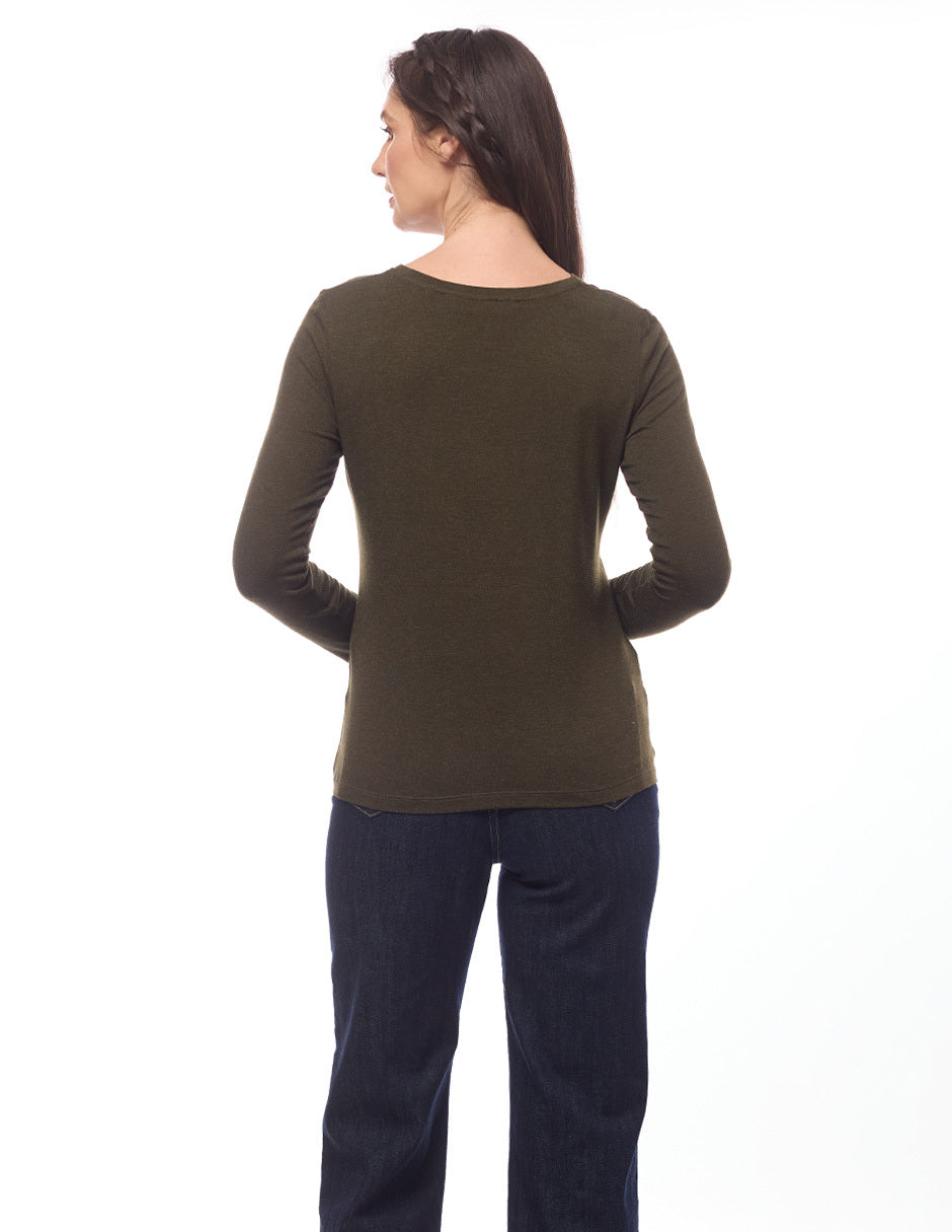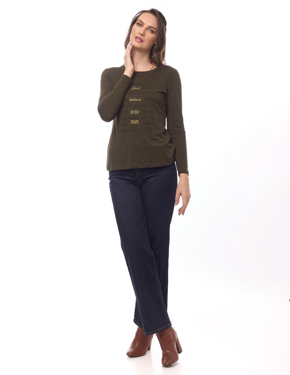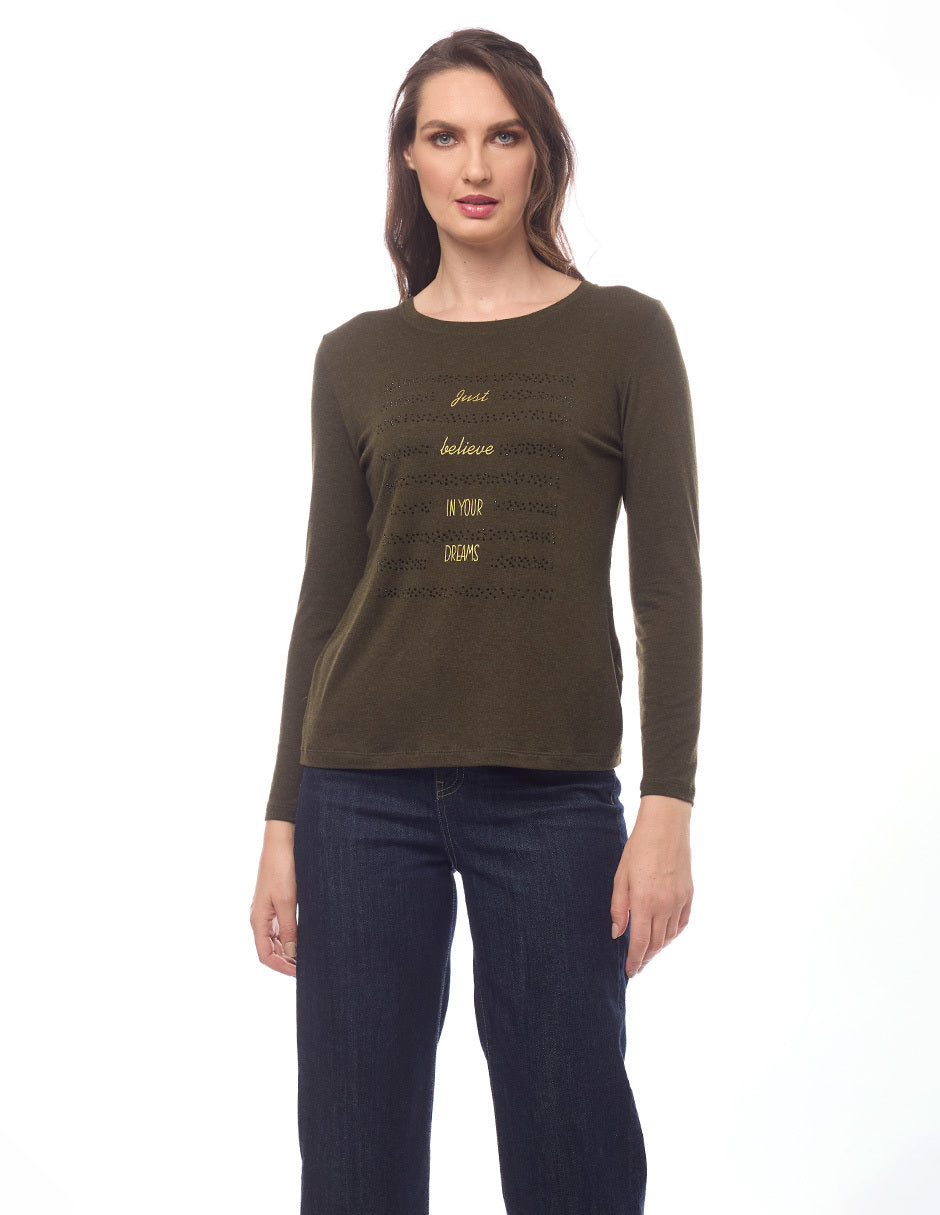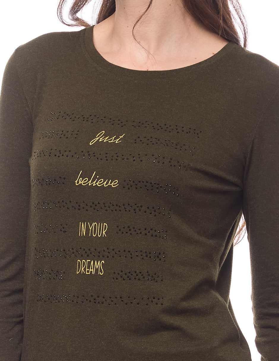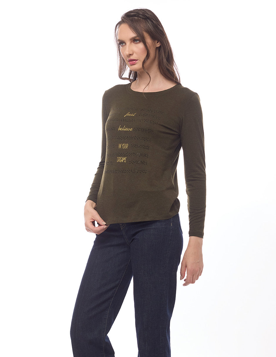 Blusa lycra lisa color verde, escote redondo, transfer y estampado de letras en delantero, manga larga