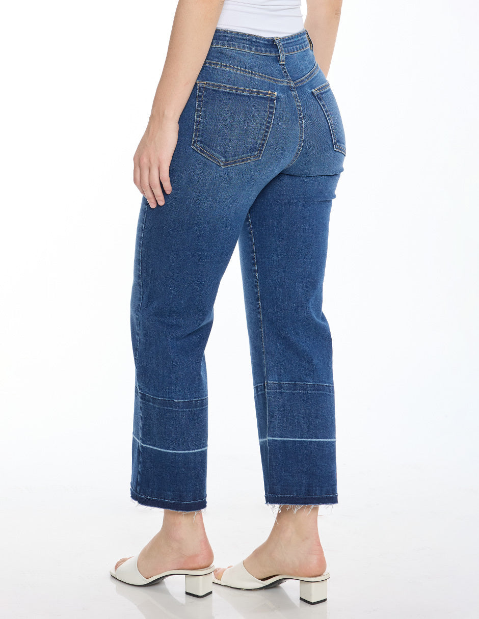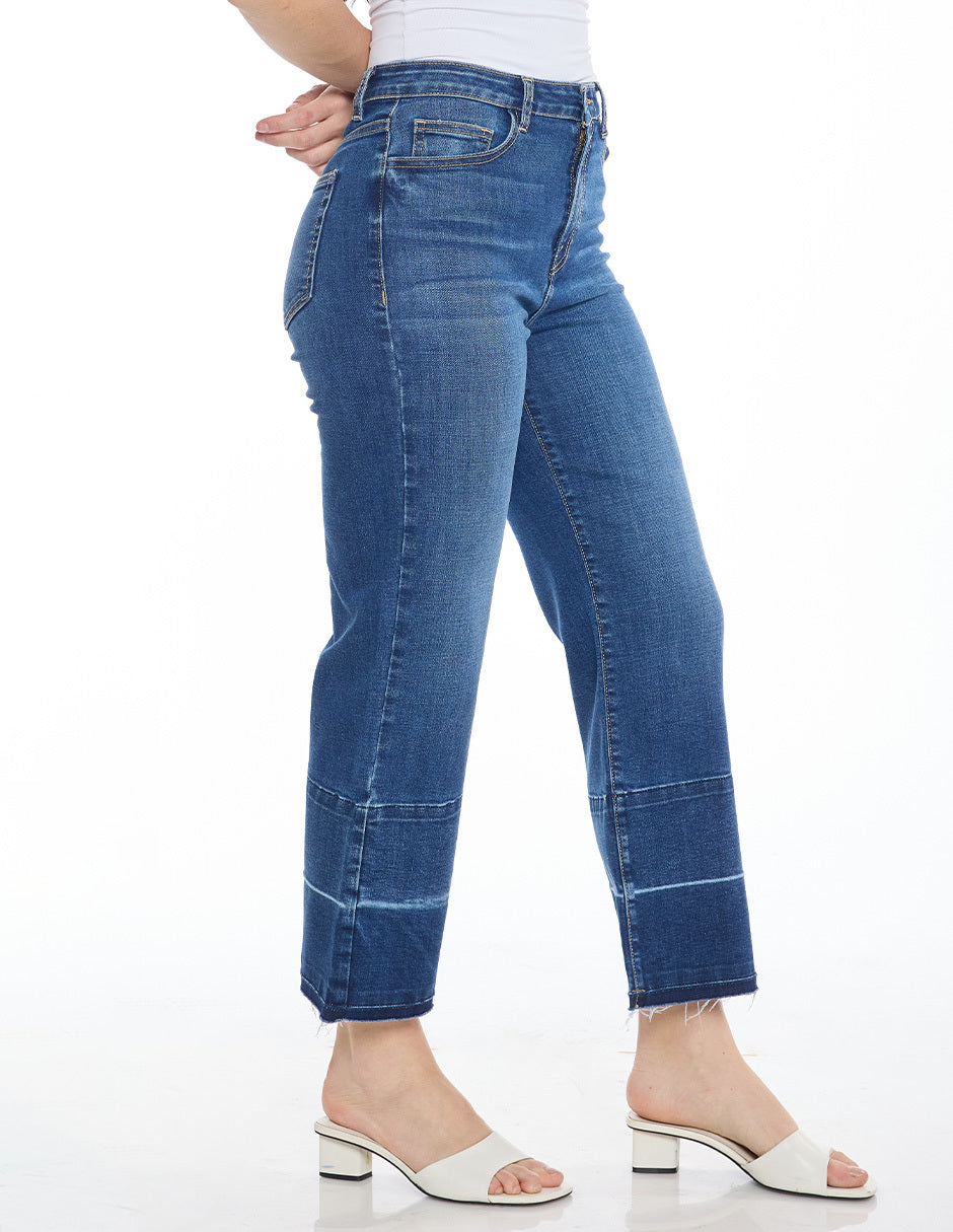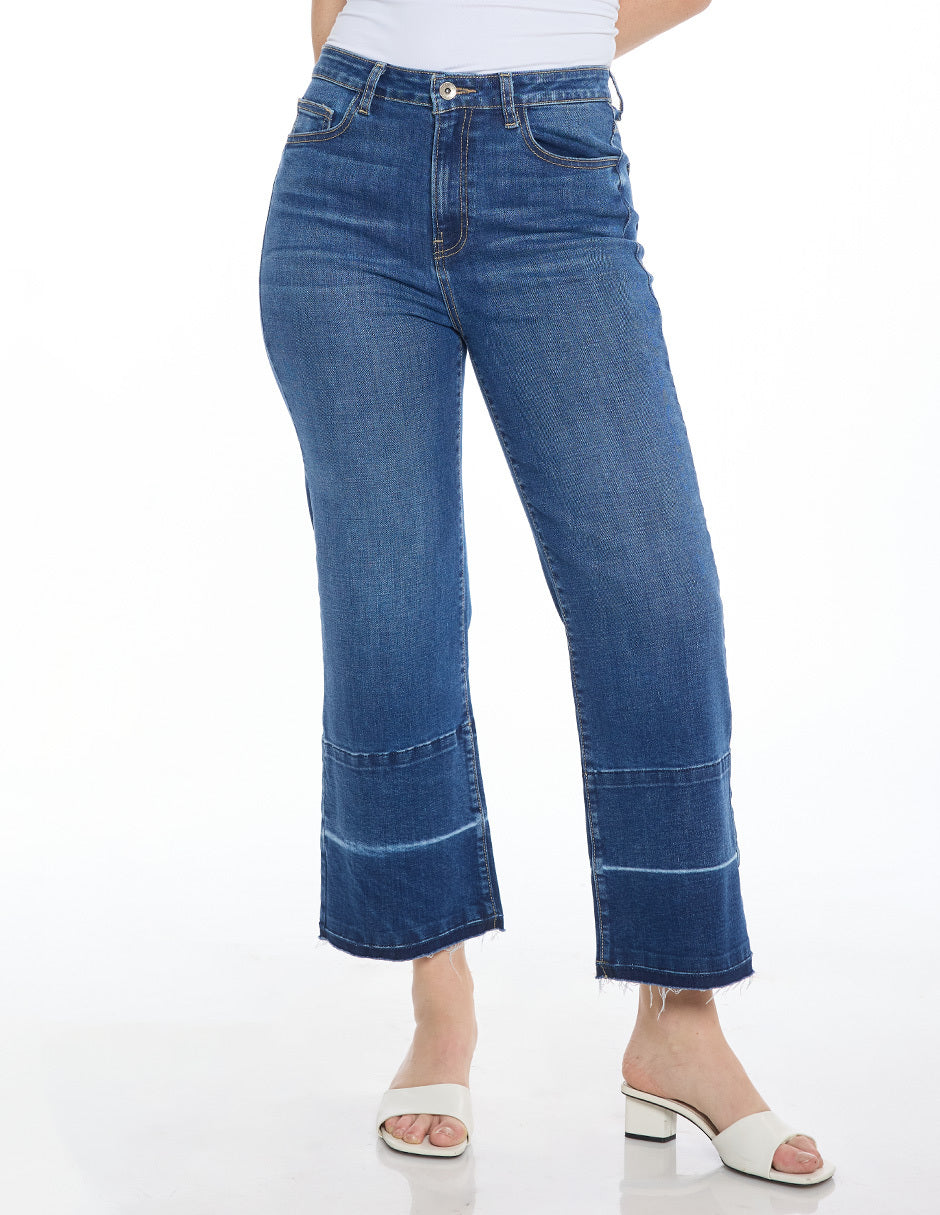 Jeans mezclilla, procesos de lavado en ruedo sin dobladillo, bolsas al frente y traseras funciones, corte amplio largo al tobillo