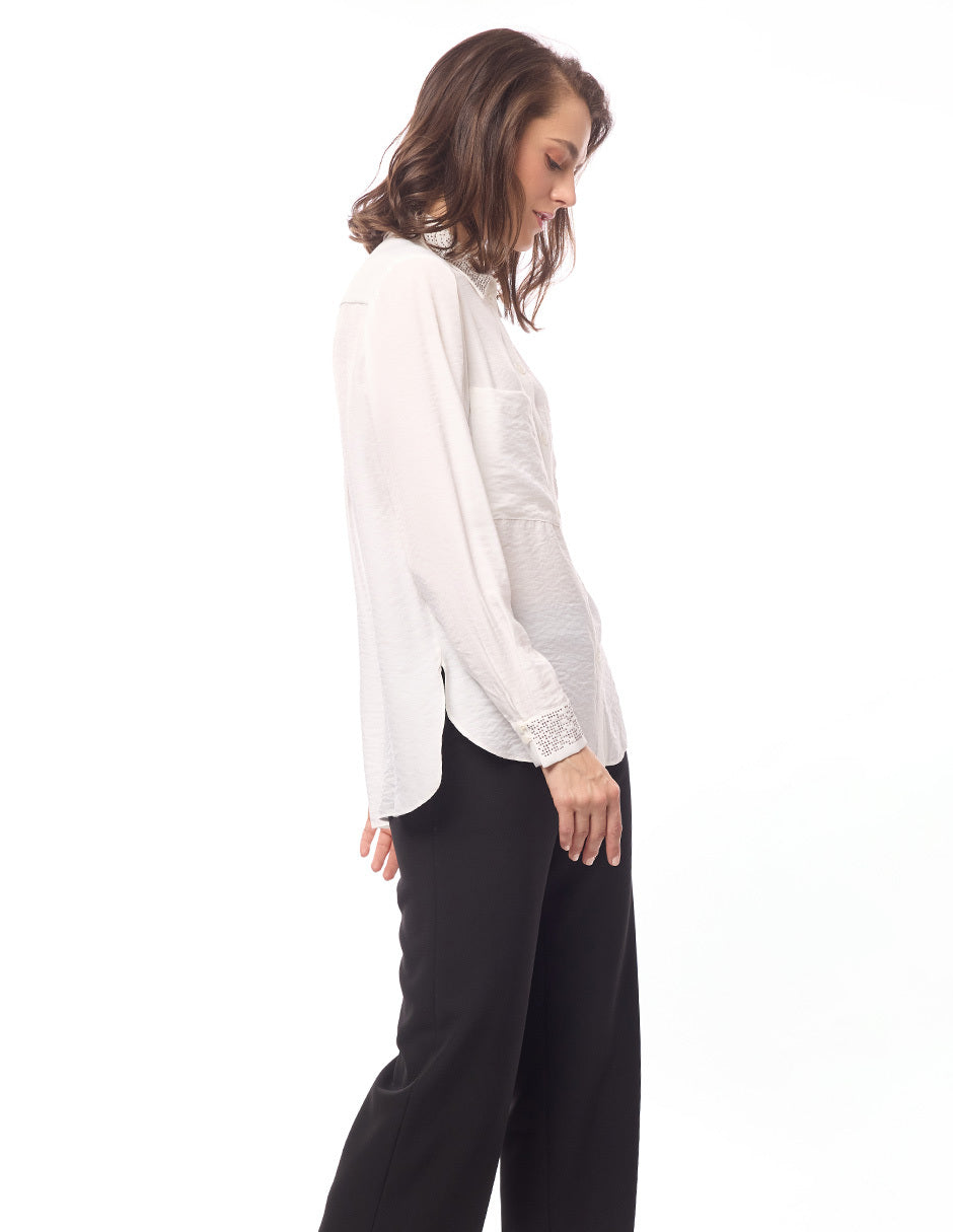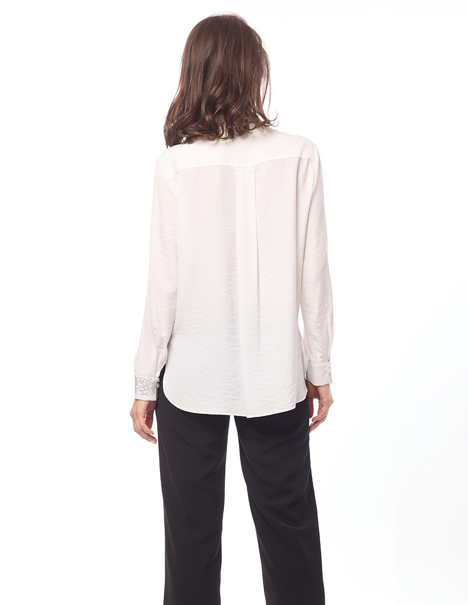 Blusa camisera lisa, transfer en cuello y puños, bolsas de parche, manga larga