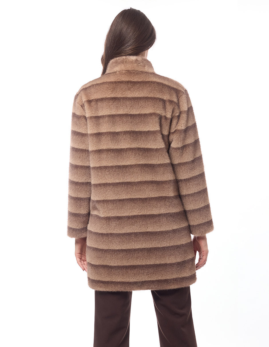 Abrigo Mink 3/4, peluche con franjas, cuello alto con broches al frente, bolsas en costados, amarre en cintura, manga larga