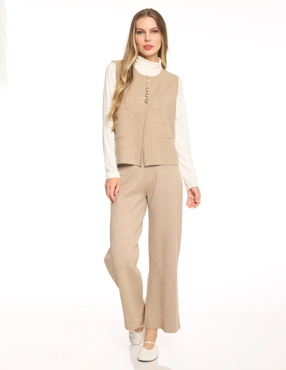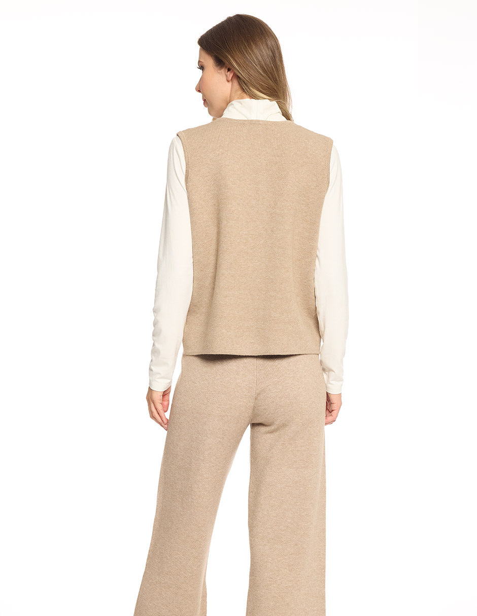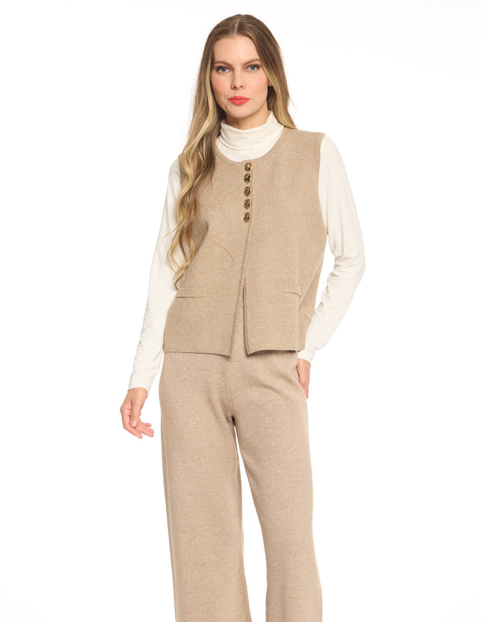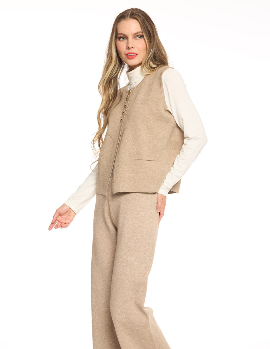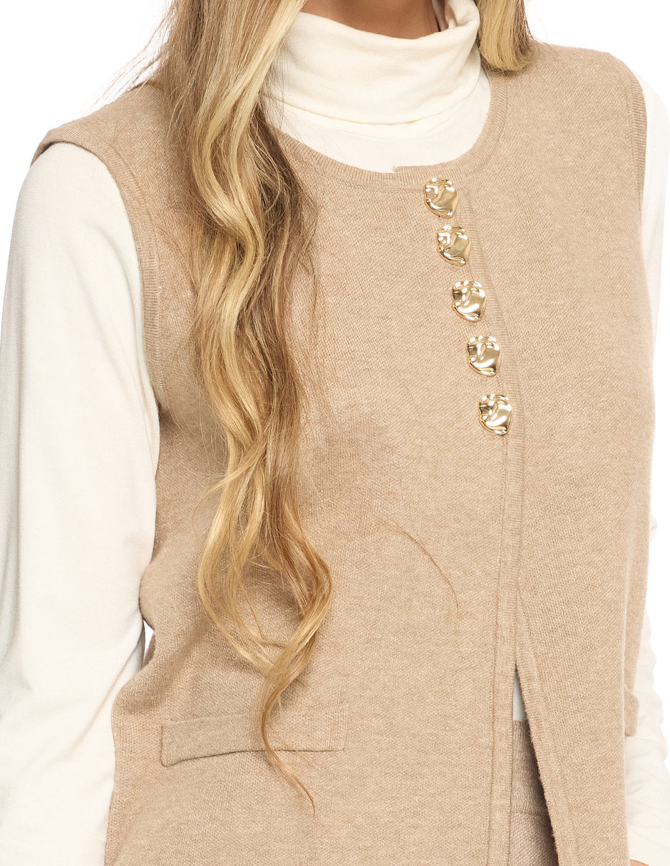 Chaleco punto, escote redondo, botones superiores al frente, detalle de vivos