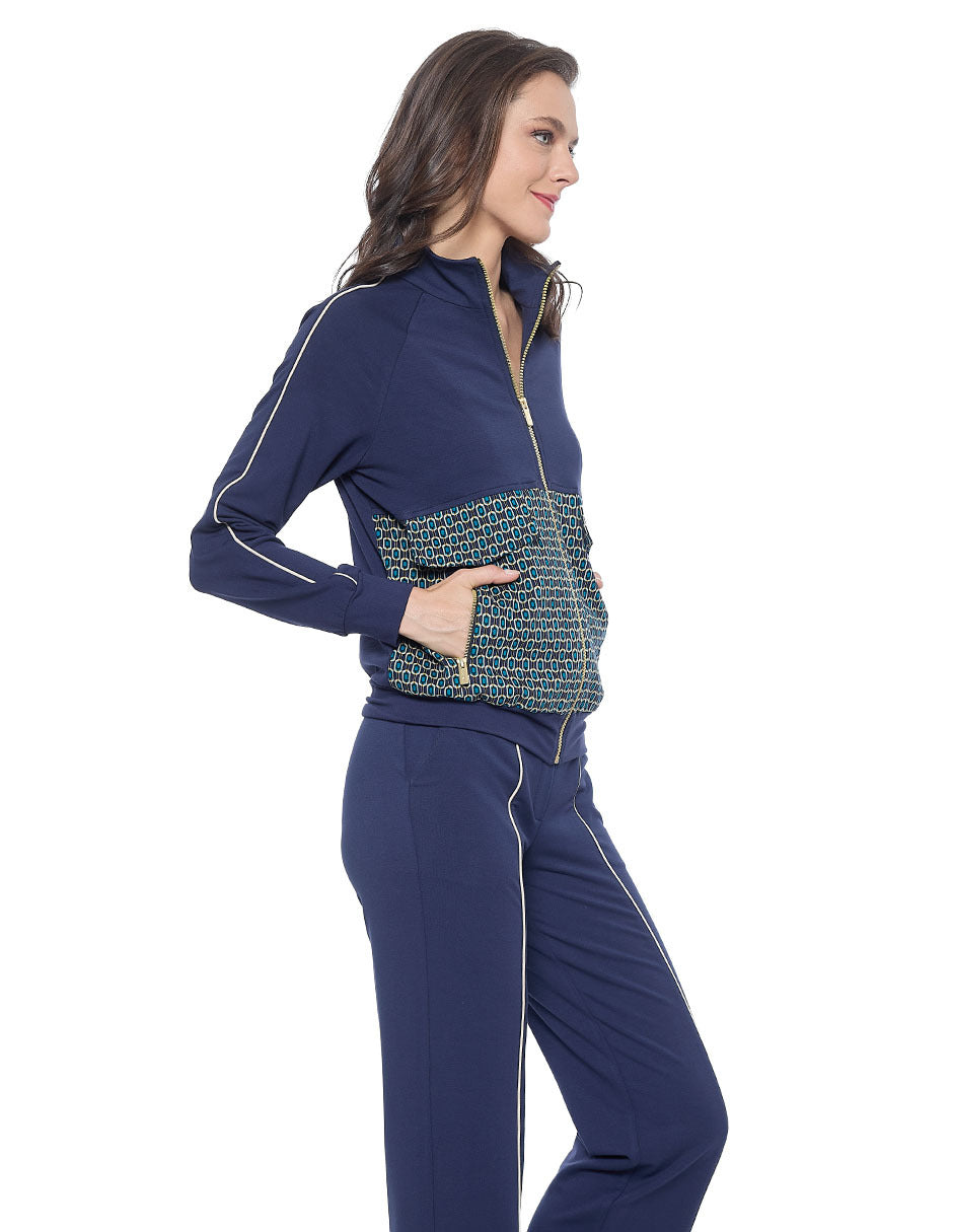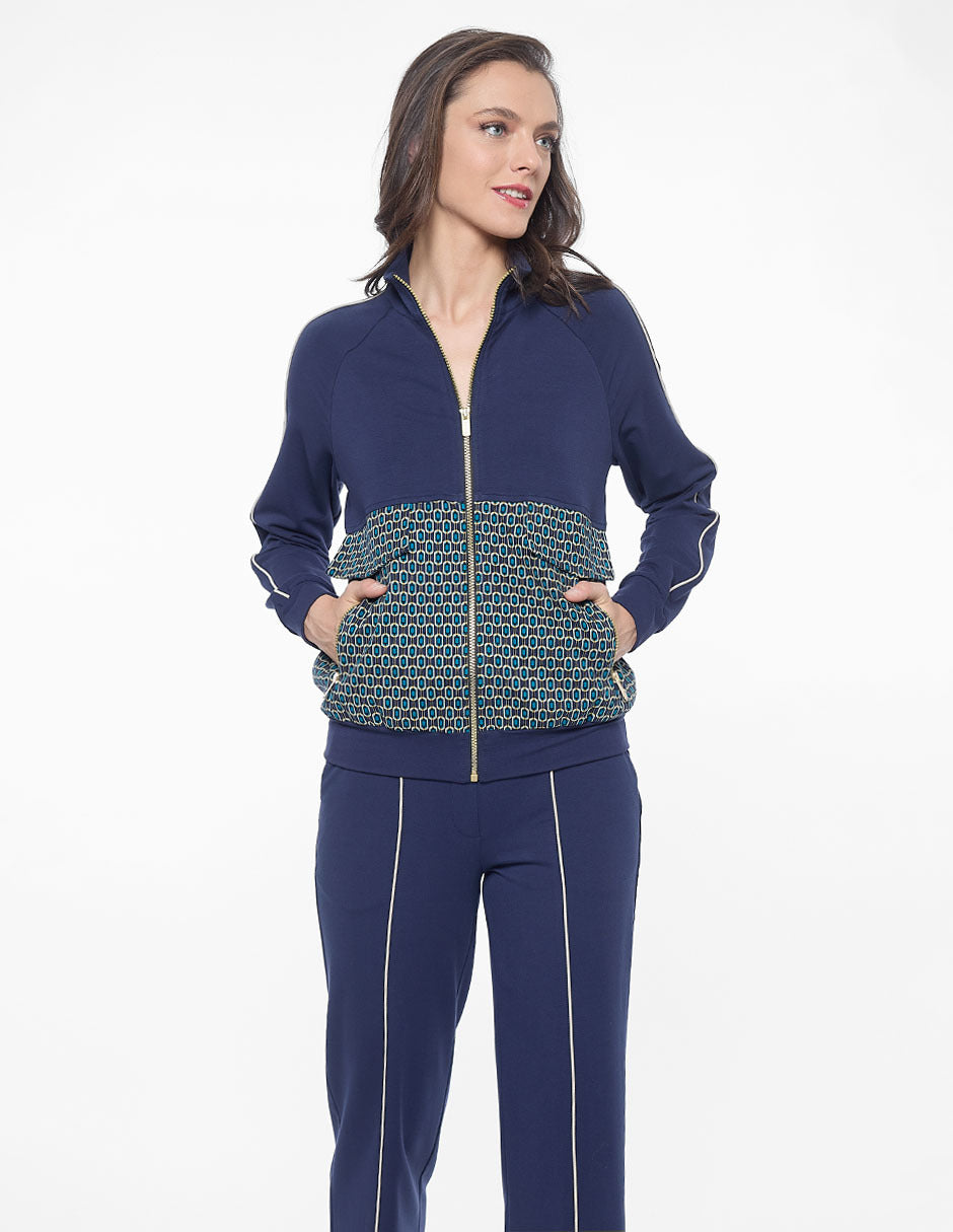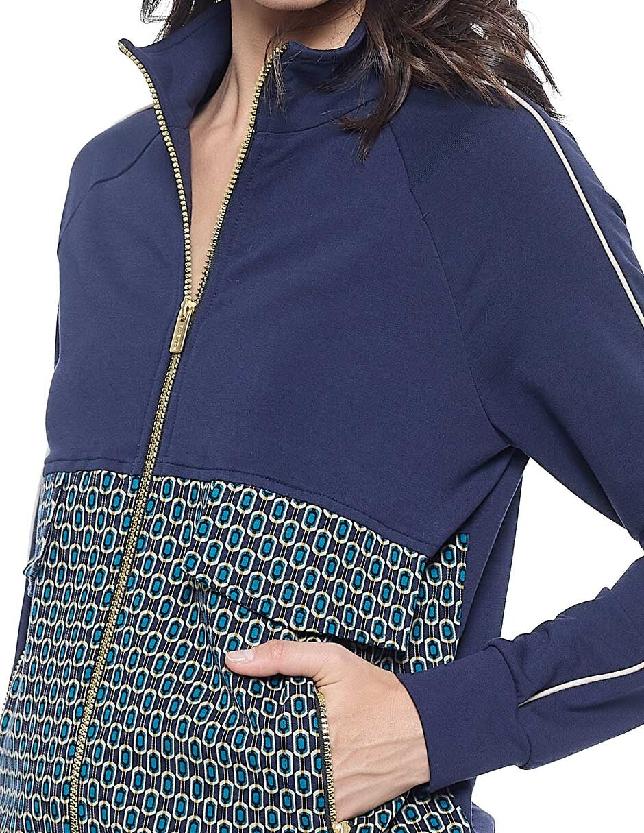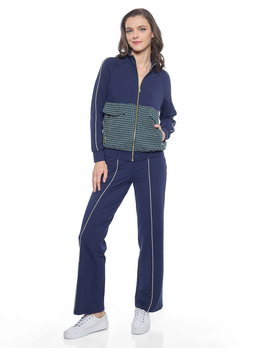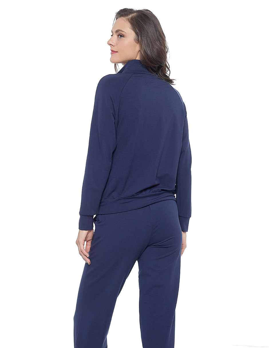 Chamarra lisa color azul marino, cuello alto con cierre con carteras y cierre en bolsas, manga ranglan con piola