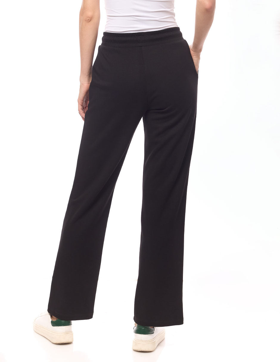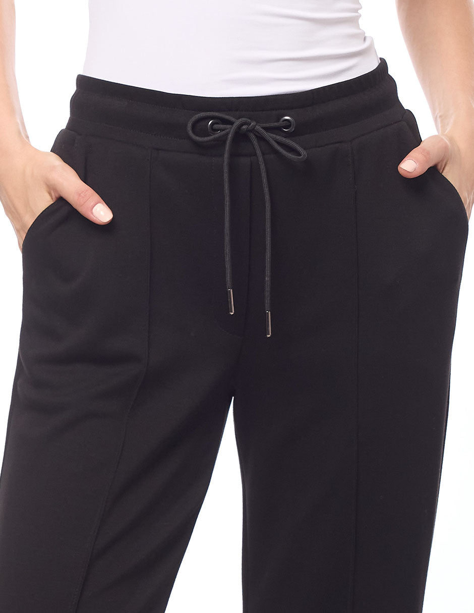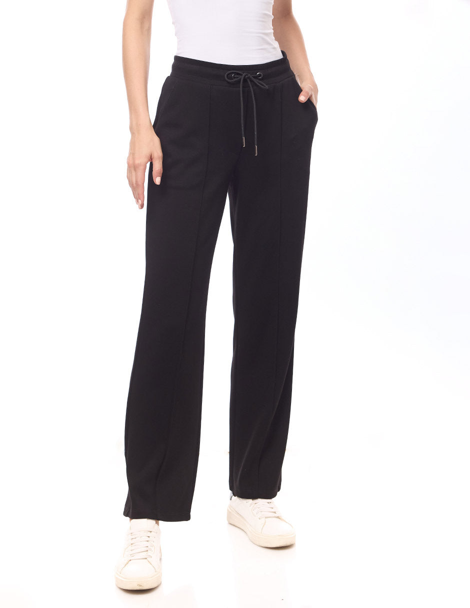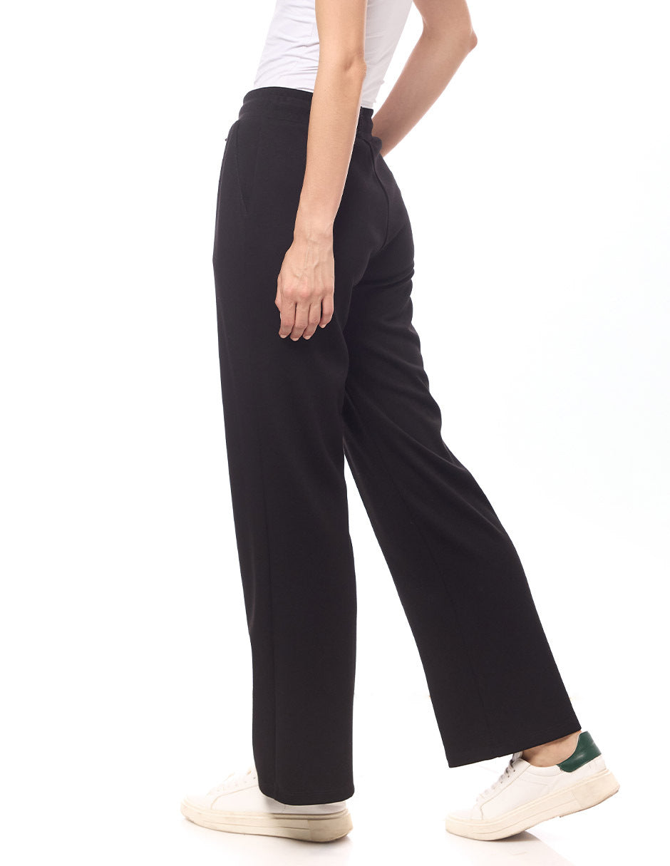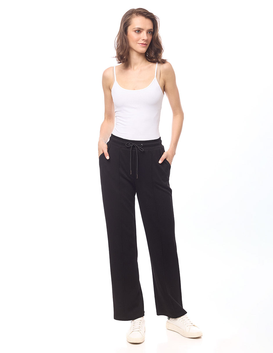 Pants color negro, liso, elástico con jareta funcional en pretina, alforza al frente, y bolsas sesgadas en costados