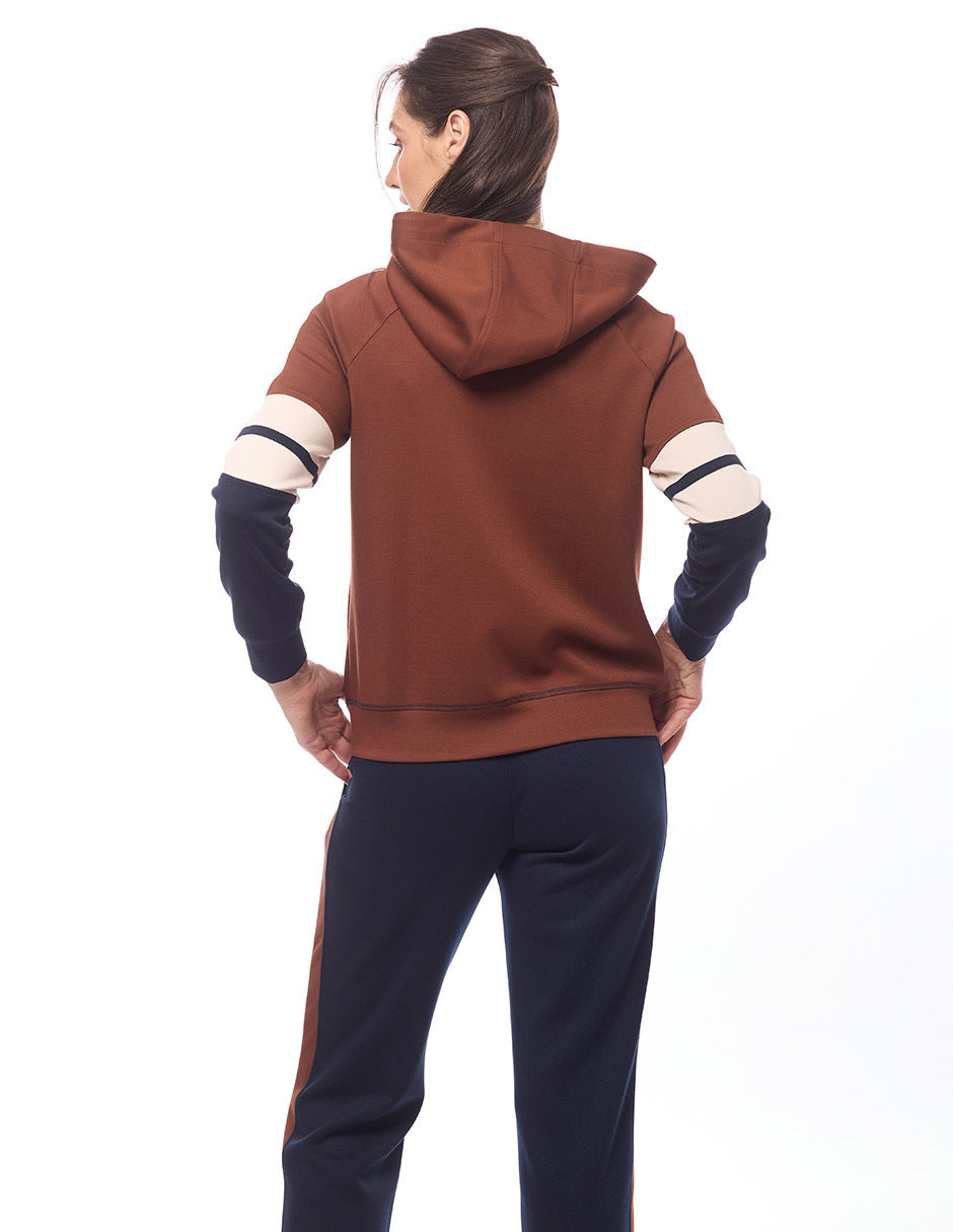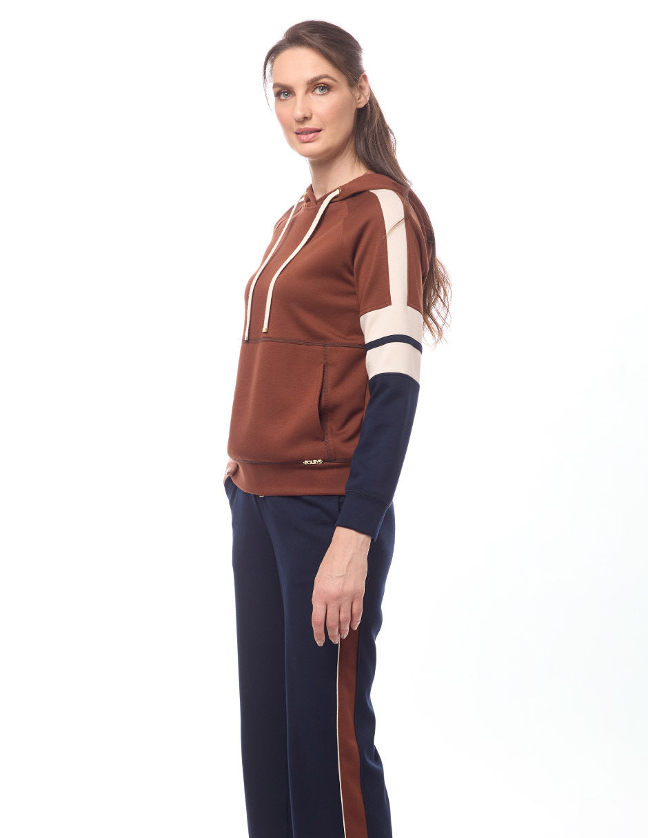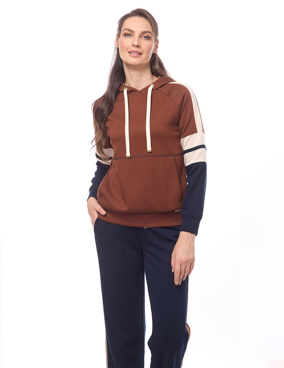 Sudadera lisa combinada color azul y café, capucha integrada con ojillos y jareta, bolsa canguro, y manga larga