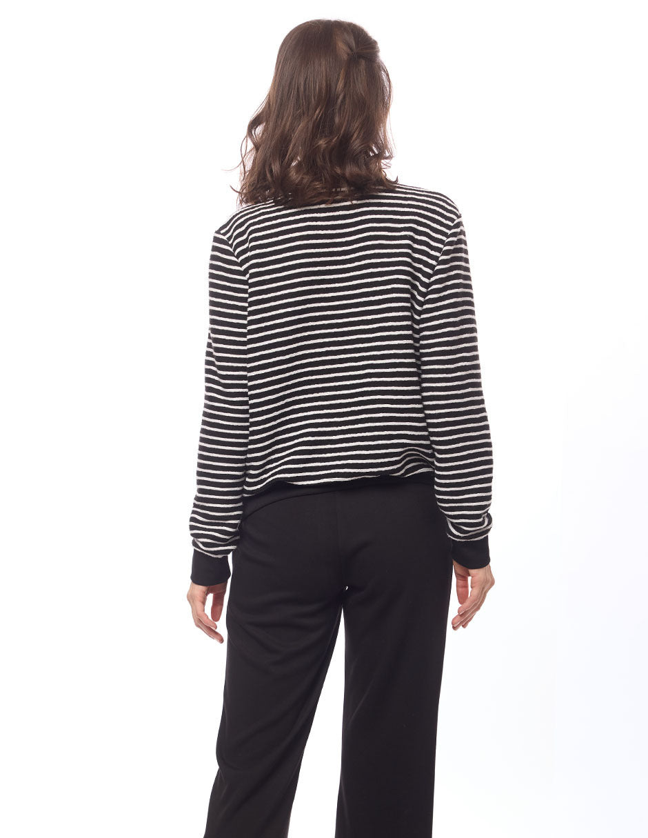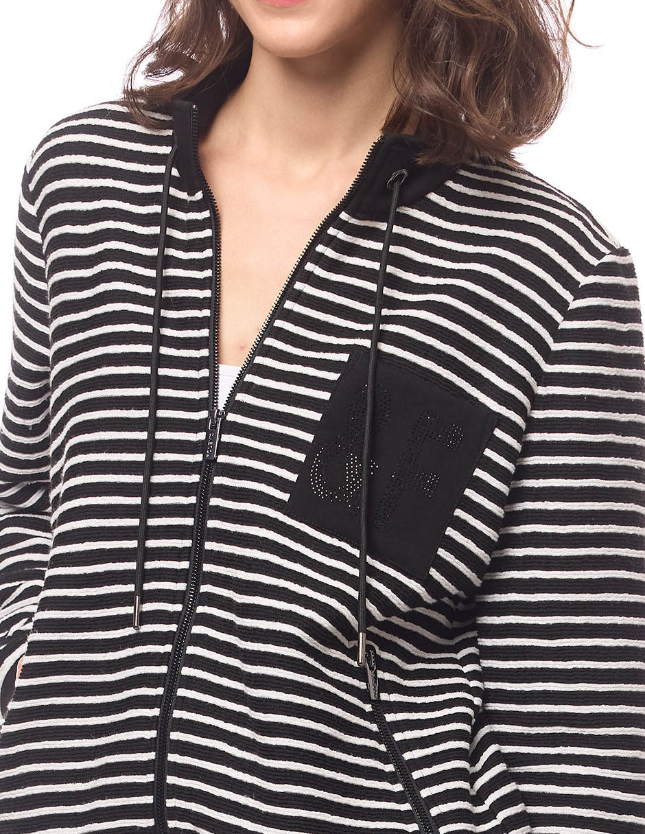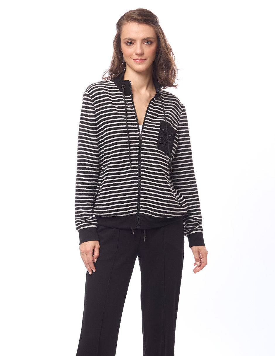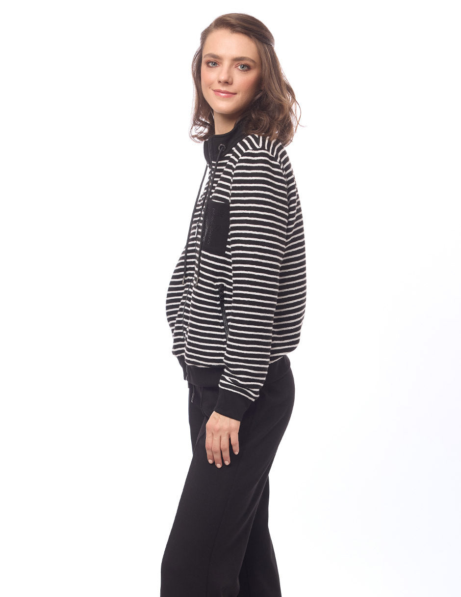 Chamarra en tejido de punto en rayas, color negro, contornos en liso, cuello alto con ojillos y jareta, cierre al frente y en bolsas, bolsa de parche lisa con transfer, manga larga