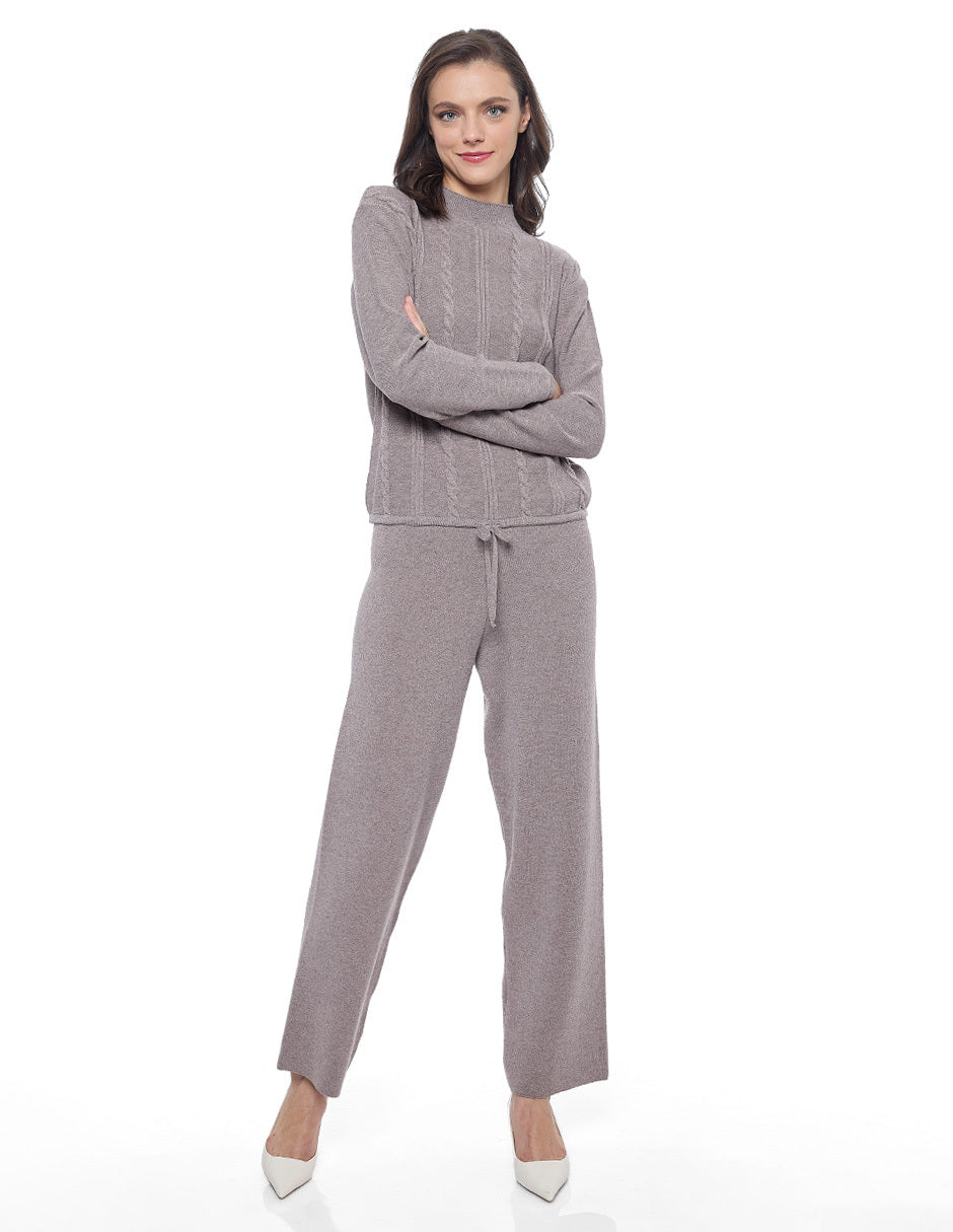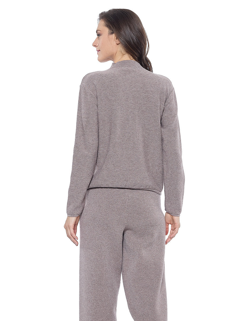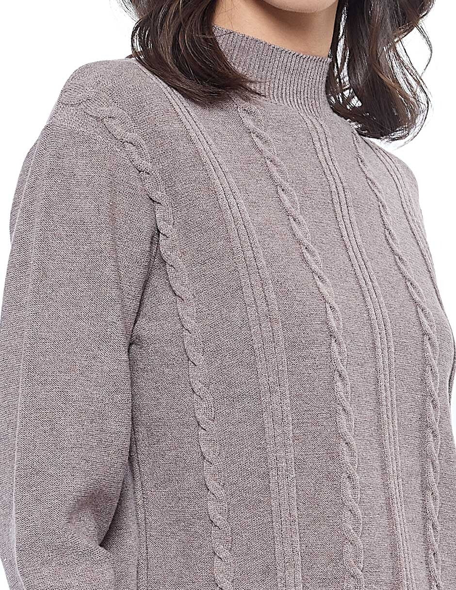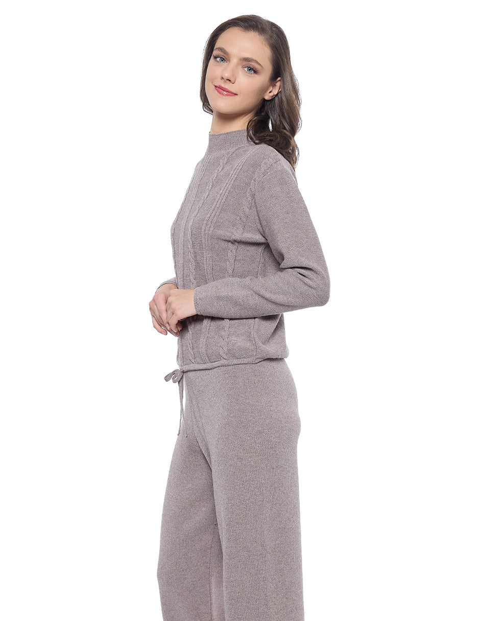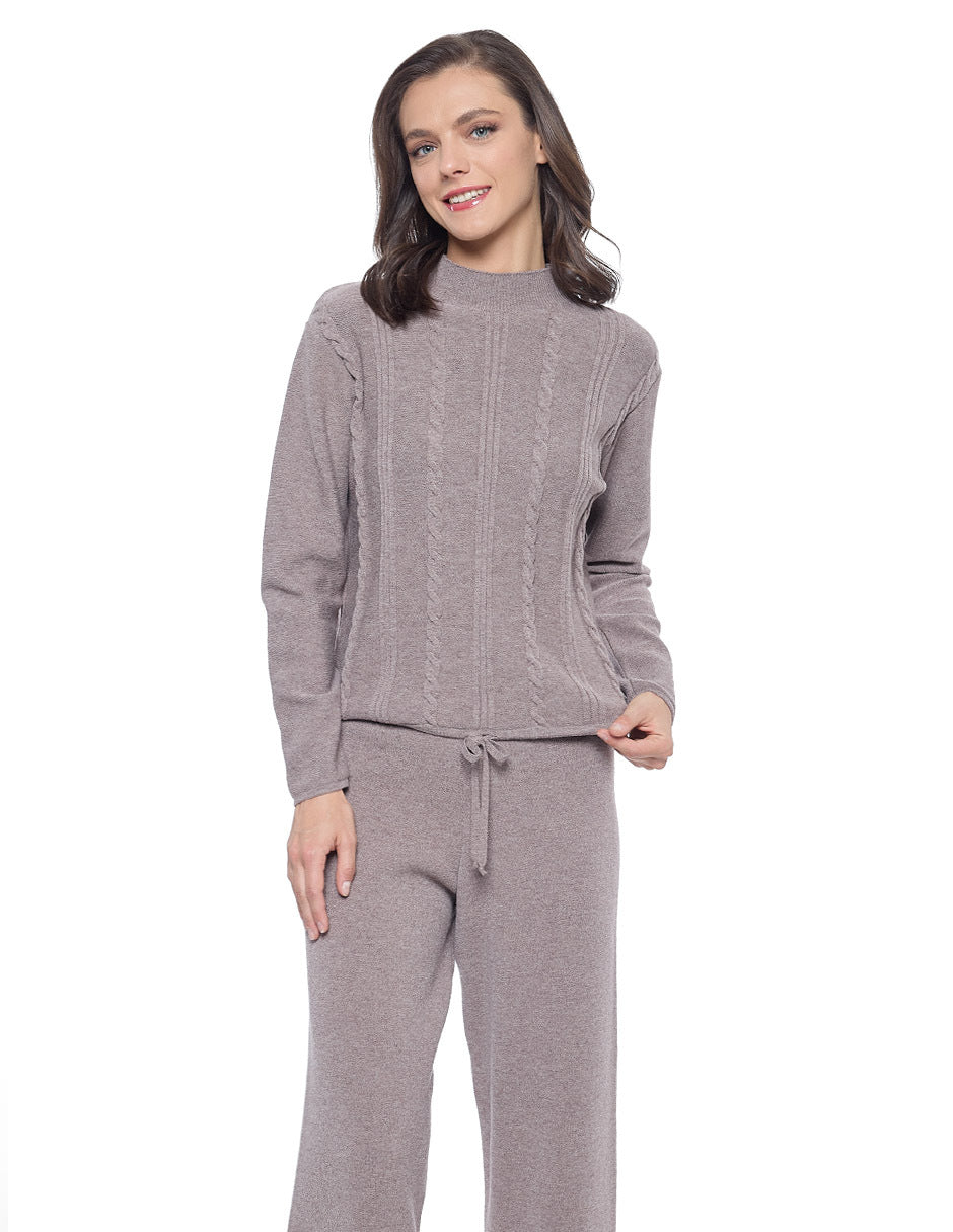 Suéter de punto, cuello alto, tejido trenzado en delantero, jareta funcional en ruedo, y manga larga