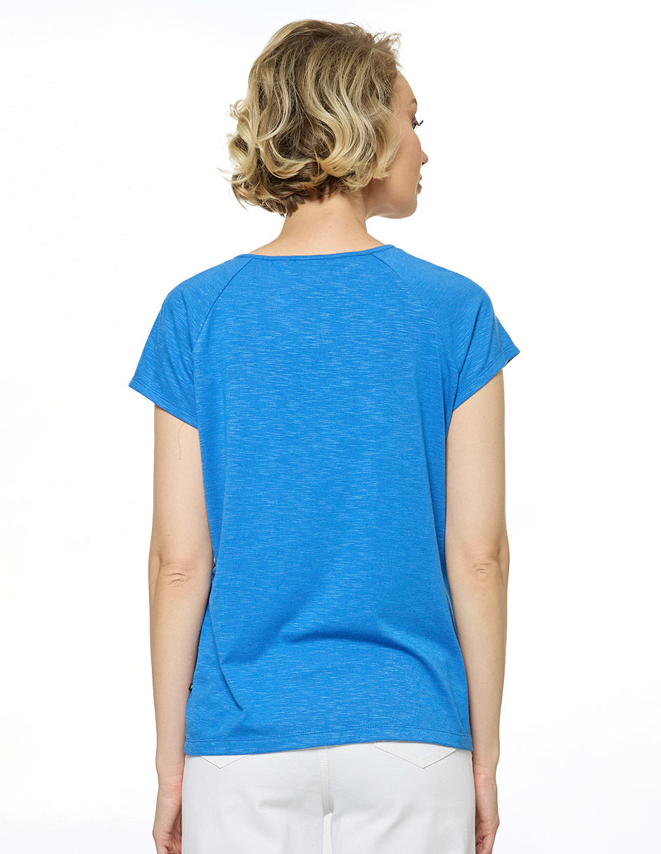 Blusa licra lisa, cuello redondo escote V con jareta, aplicación de encaje en delantero con pliegues, manga ranglan corta