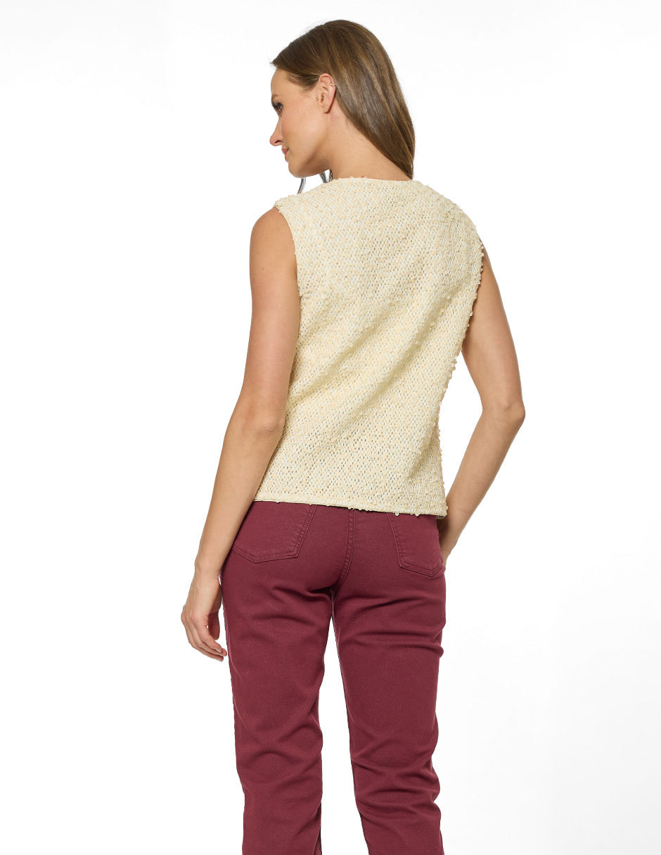 Chaleco tela calada con lentejuelas, escote V, broches al frente, forrado