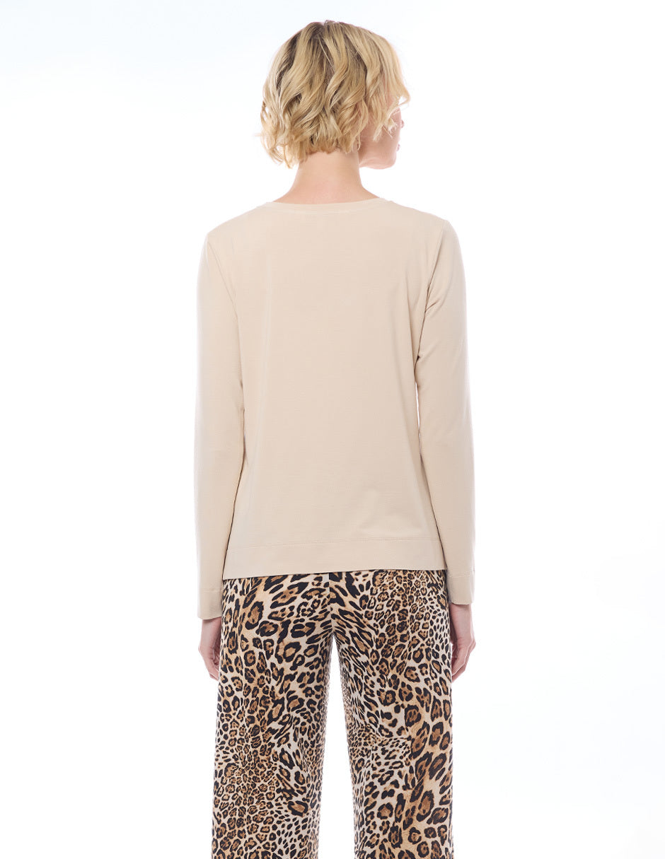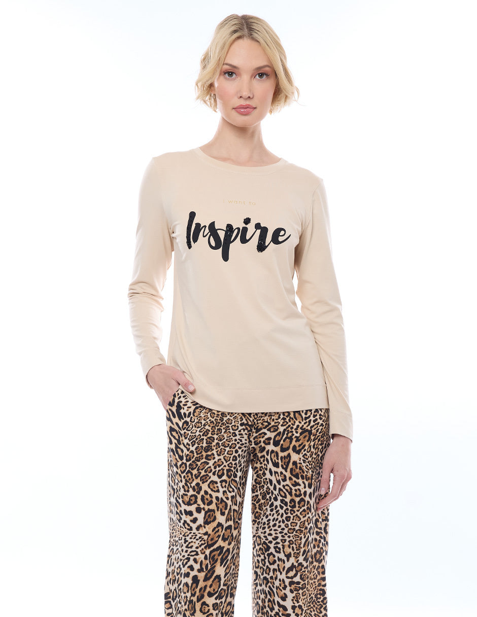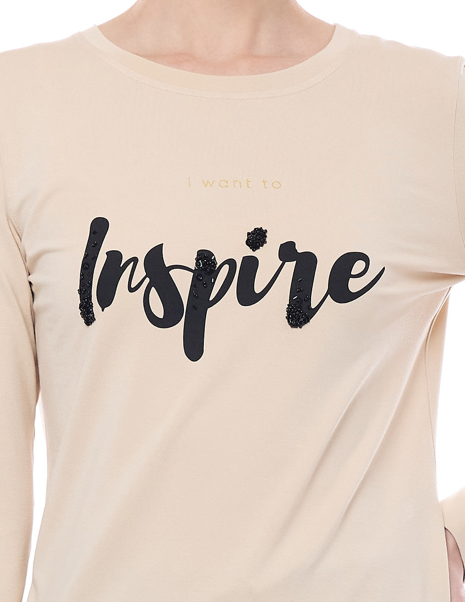 Blusa lycra lisa color beige, escote redondo, estampado de letras con bordado de canutillo, y manga larga