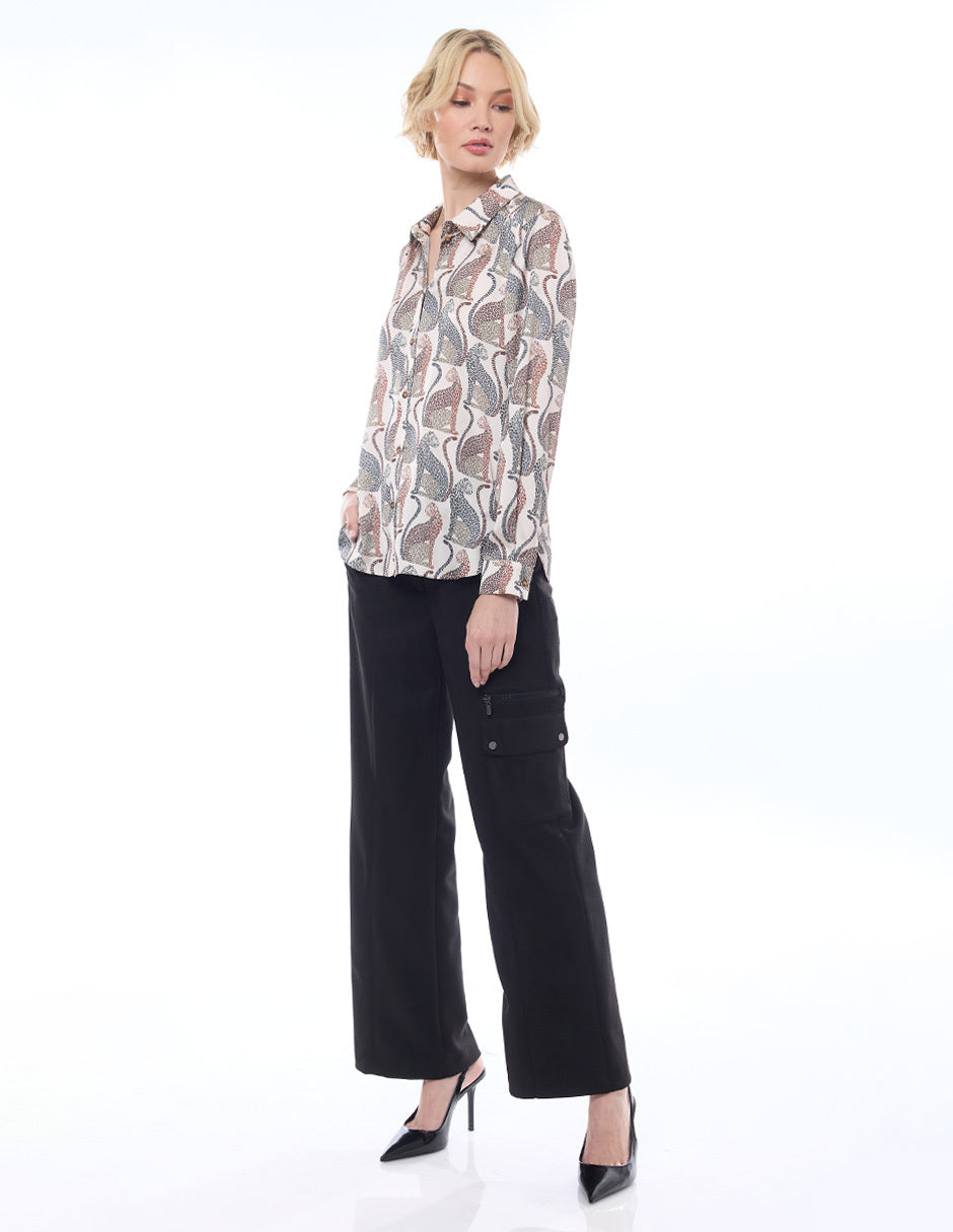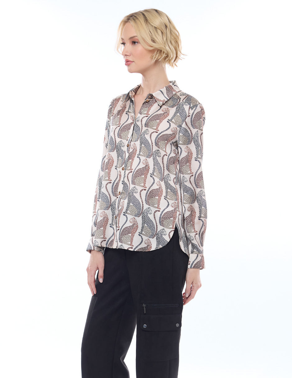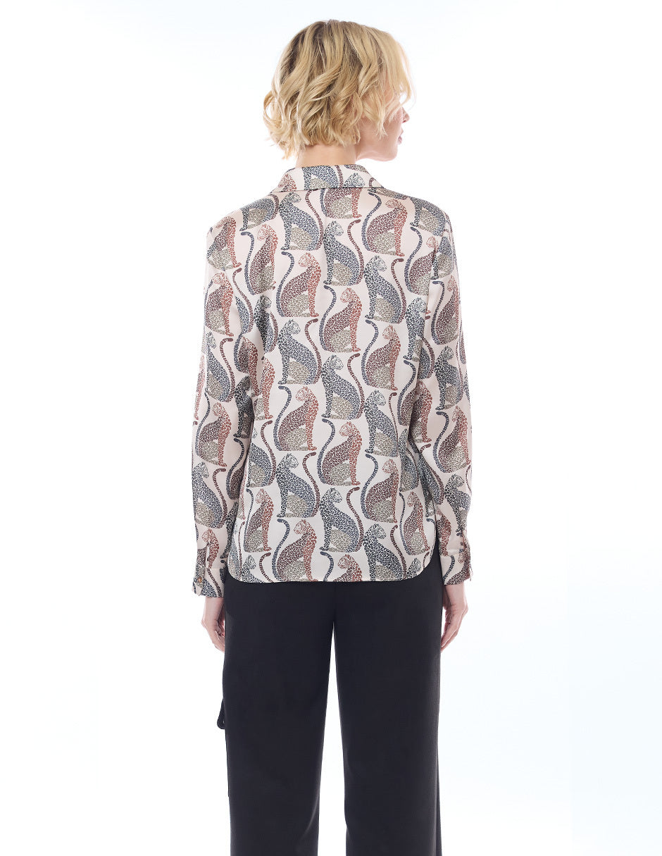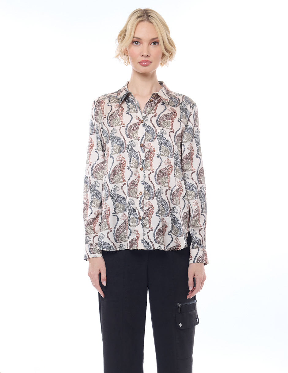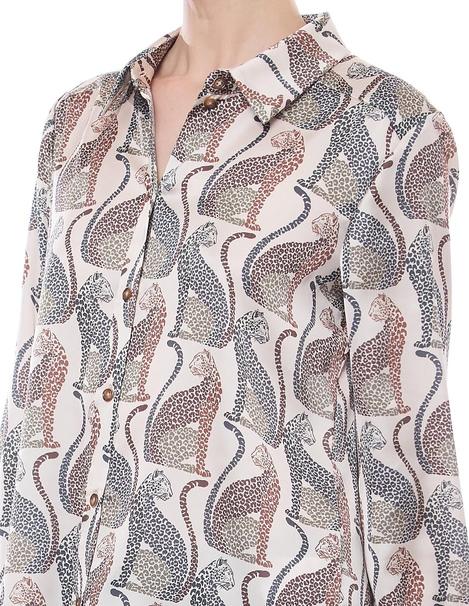 Blusa camisera color beige, estampado leopardos,y manga larga