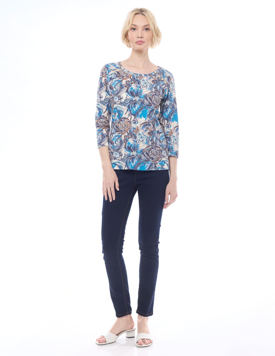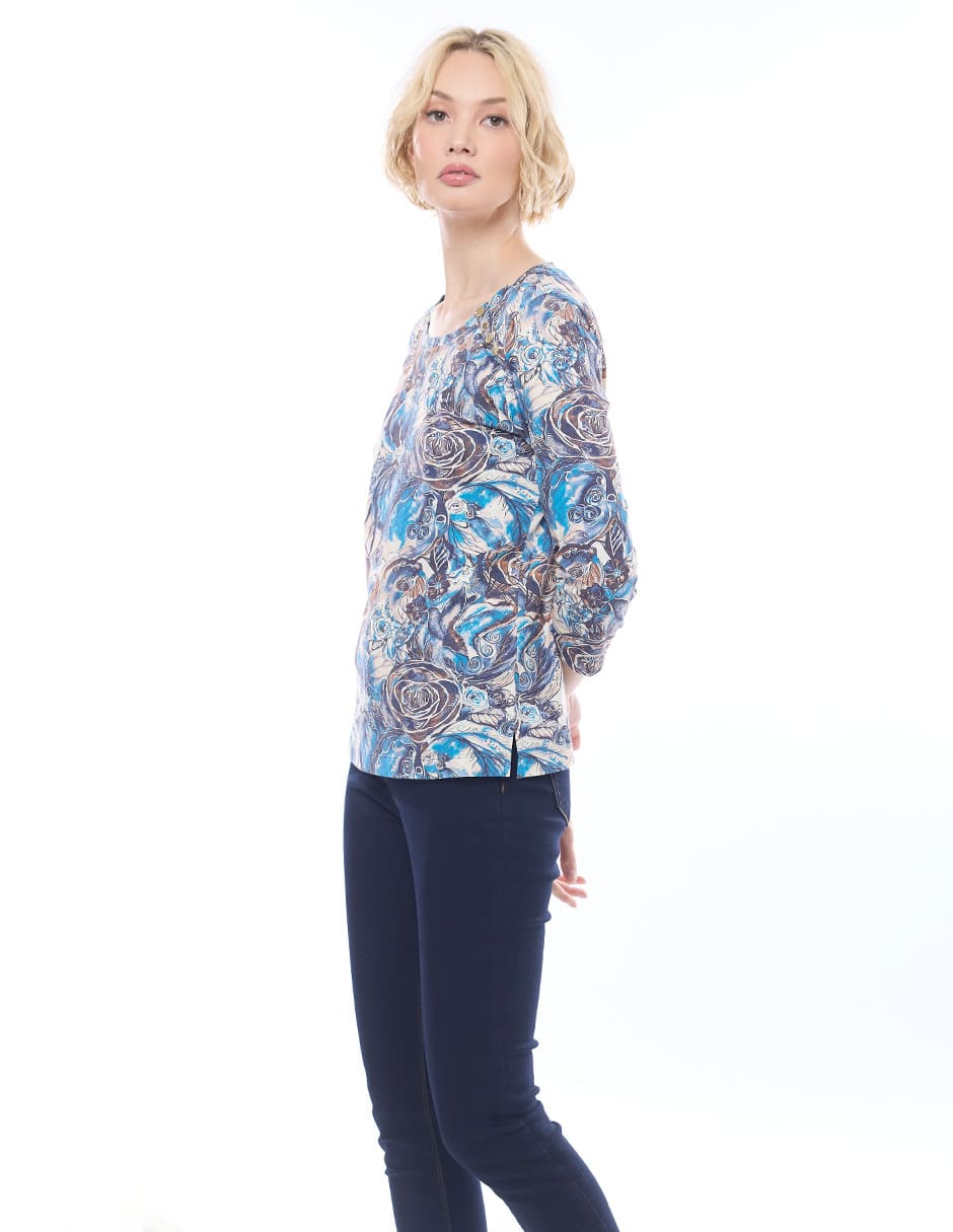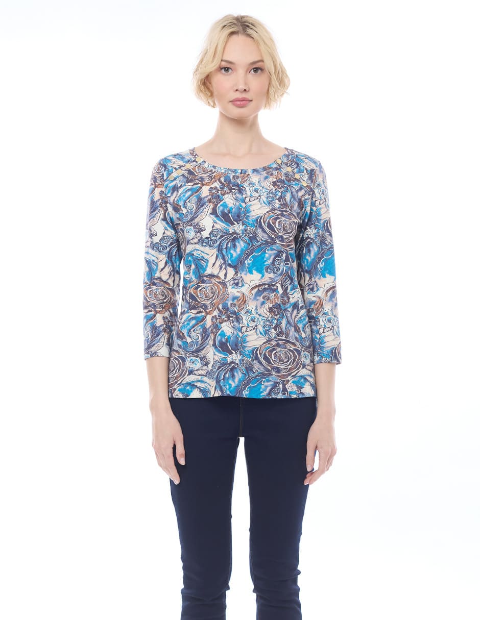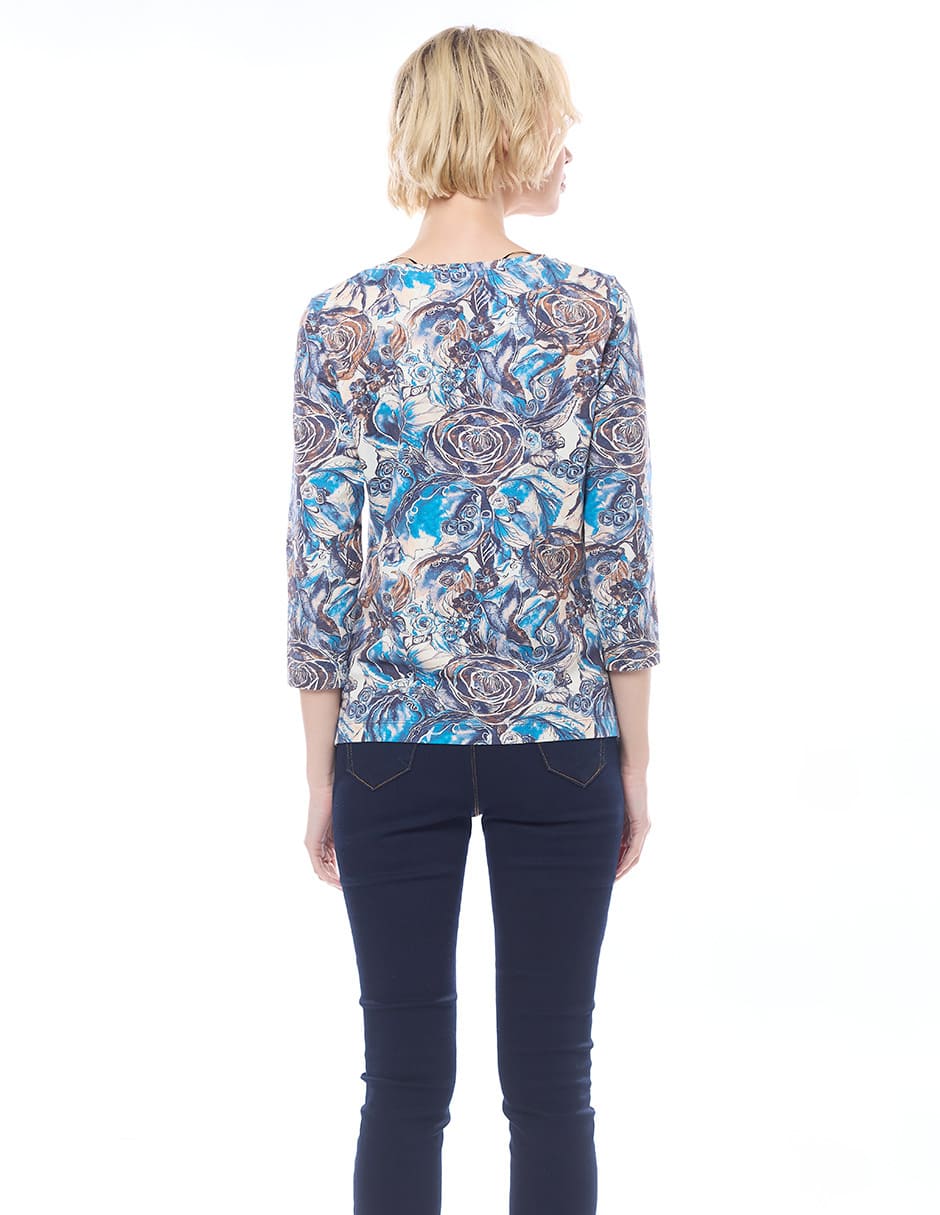 Blusa licra estampada color azul, escote redondo, detalle de broches en hombros, y manga 3/4