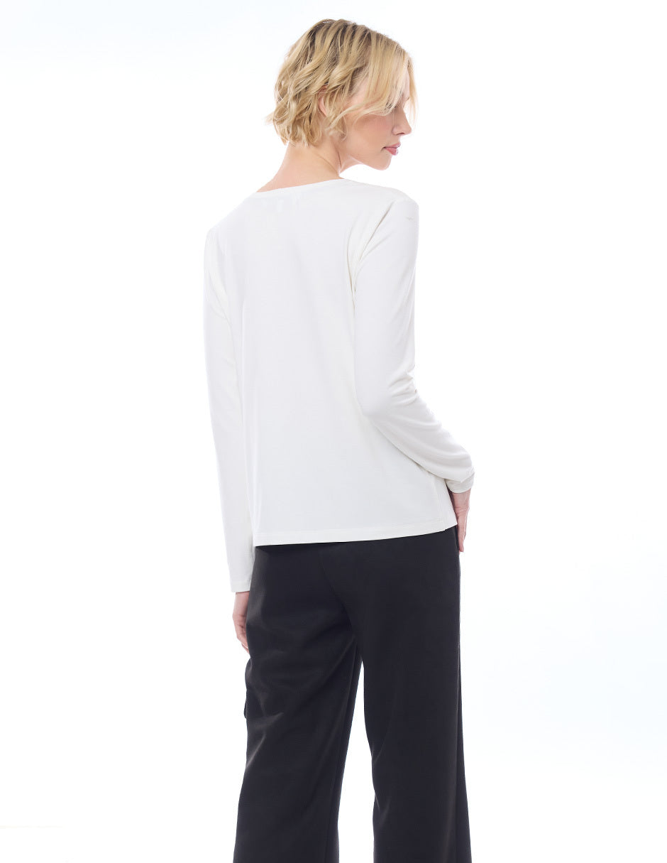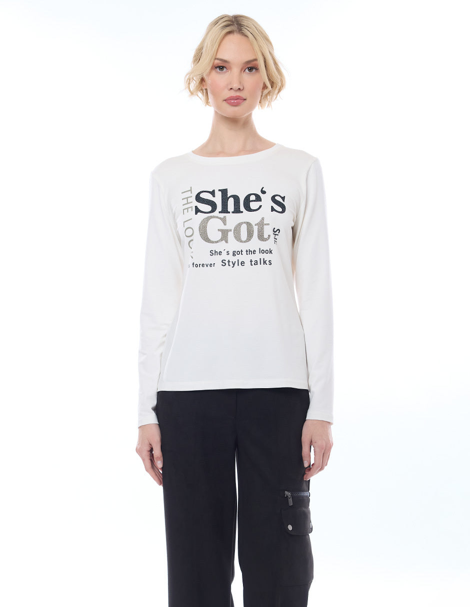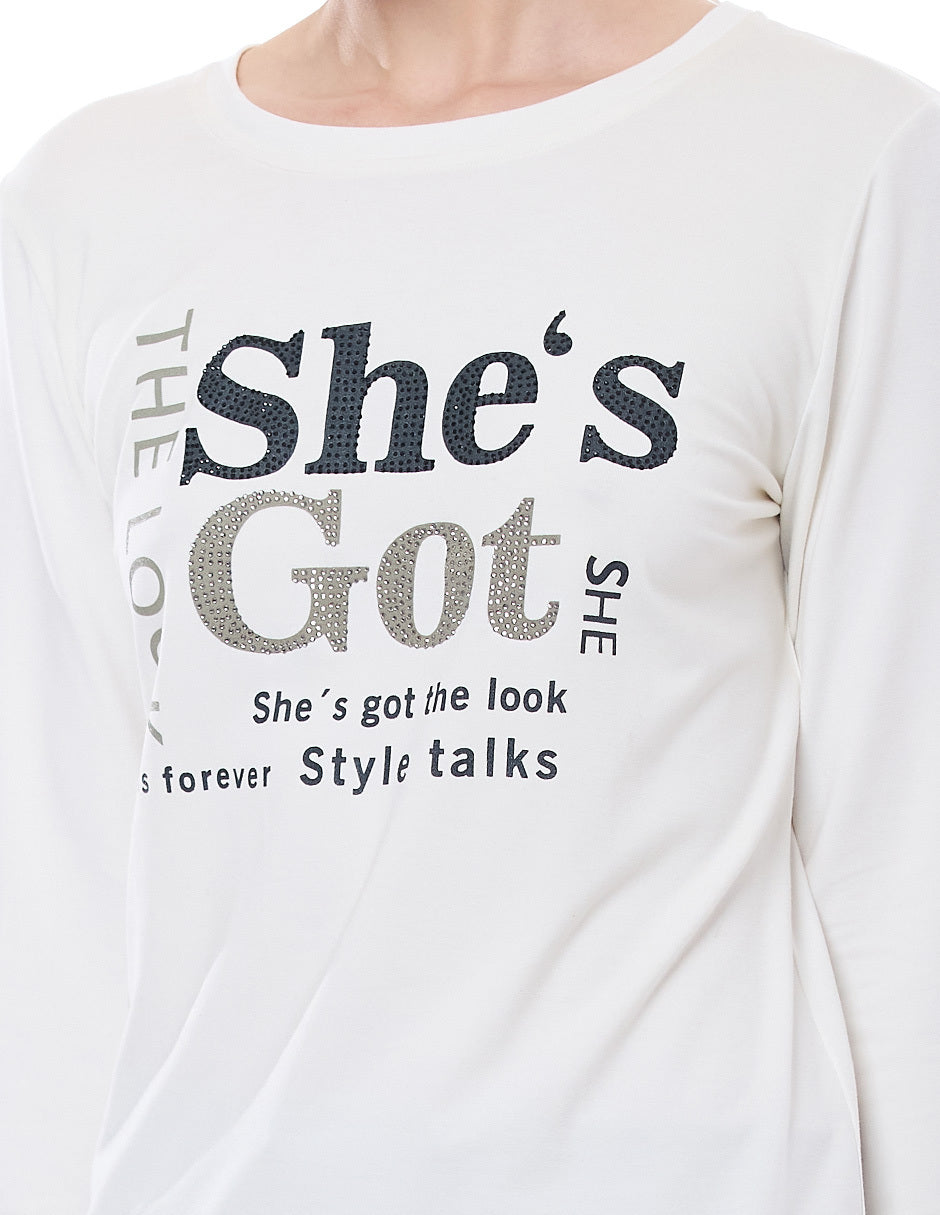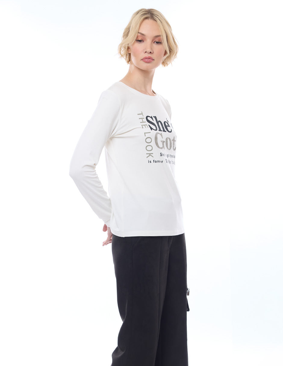 Blusa lycra lisa color hueso, escote redondo, estampado de letras con transfer, y manga larga
