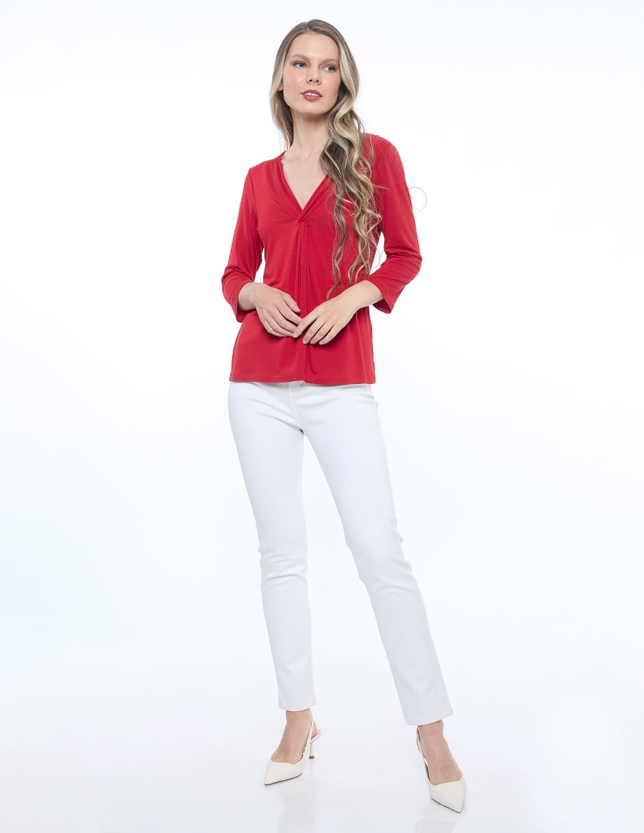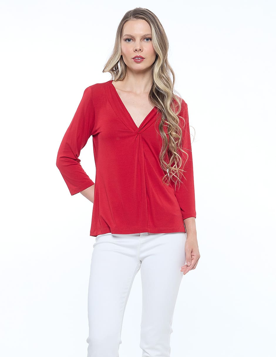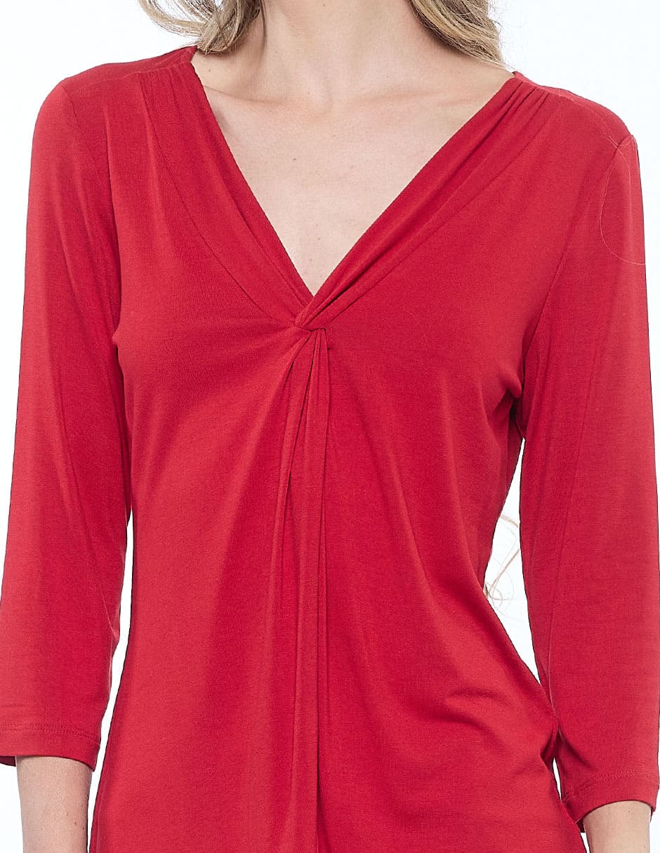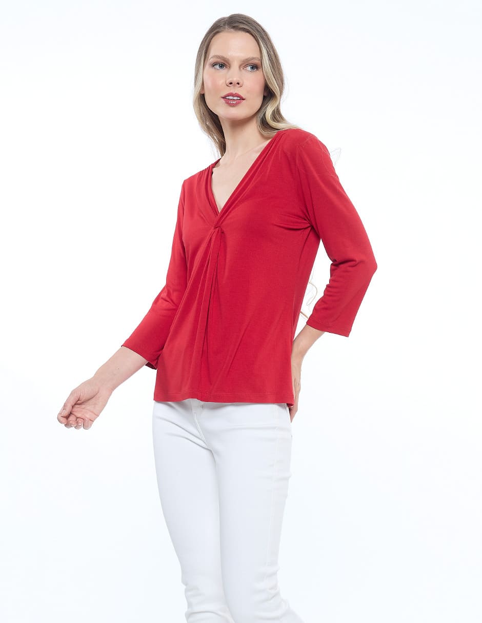 Blusa lycra lisa, escote V con nudo, manga 3/4