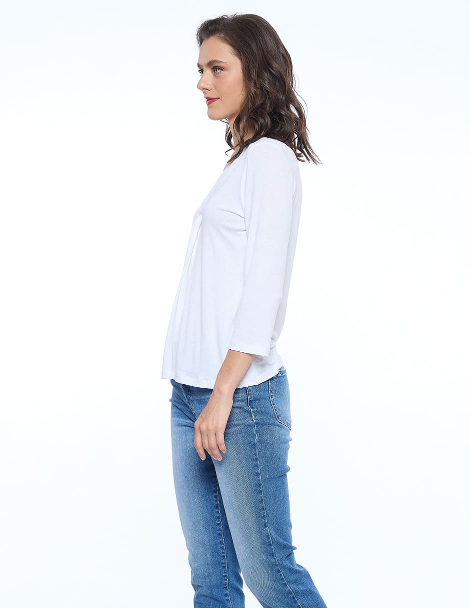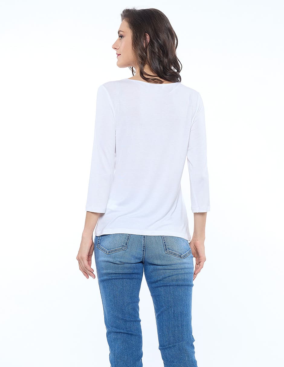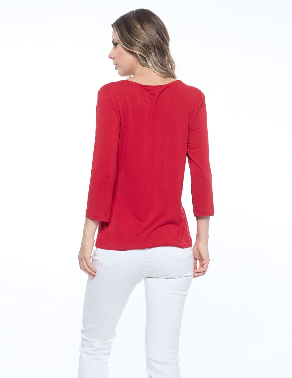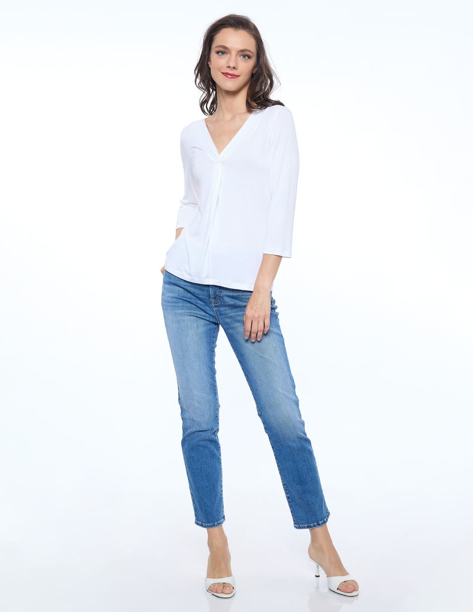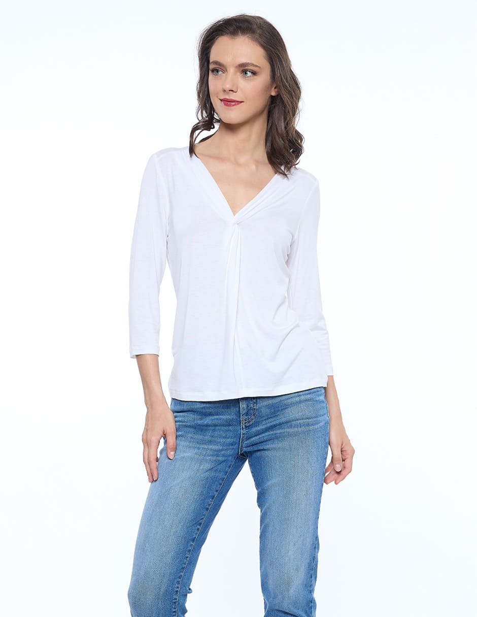 Blusa lycra lisa, escote V con nudo, manga 3/4