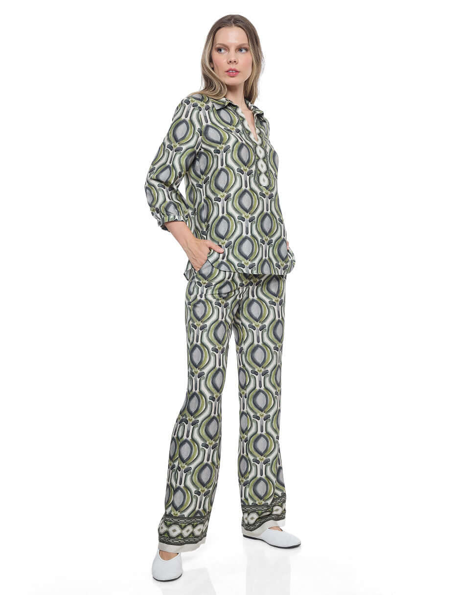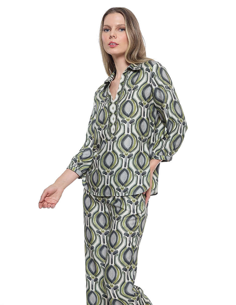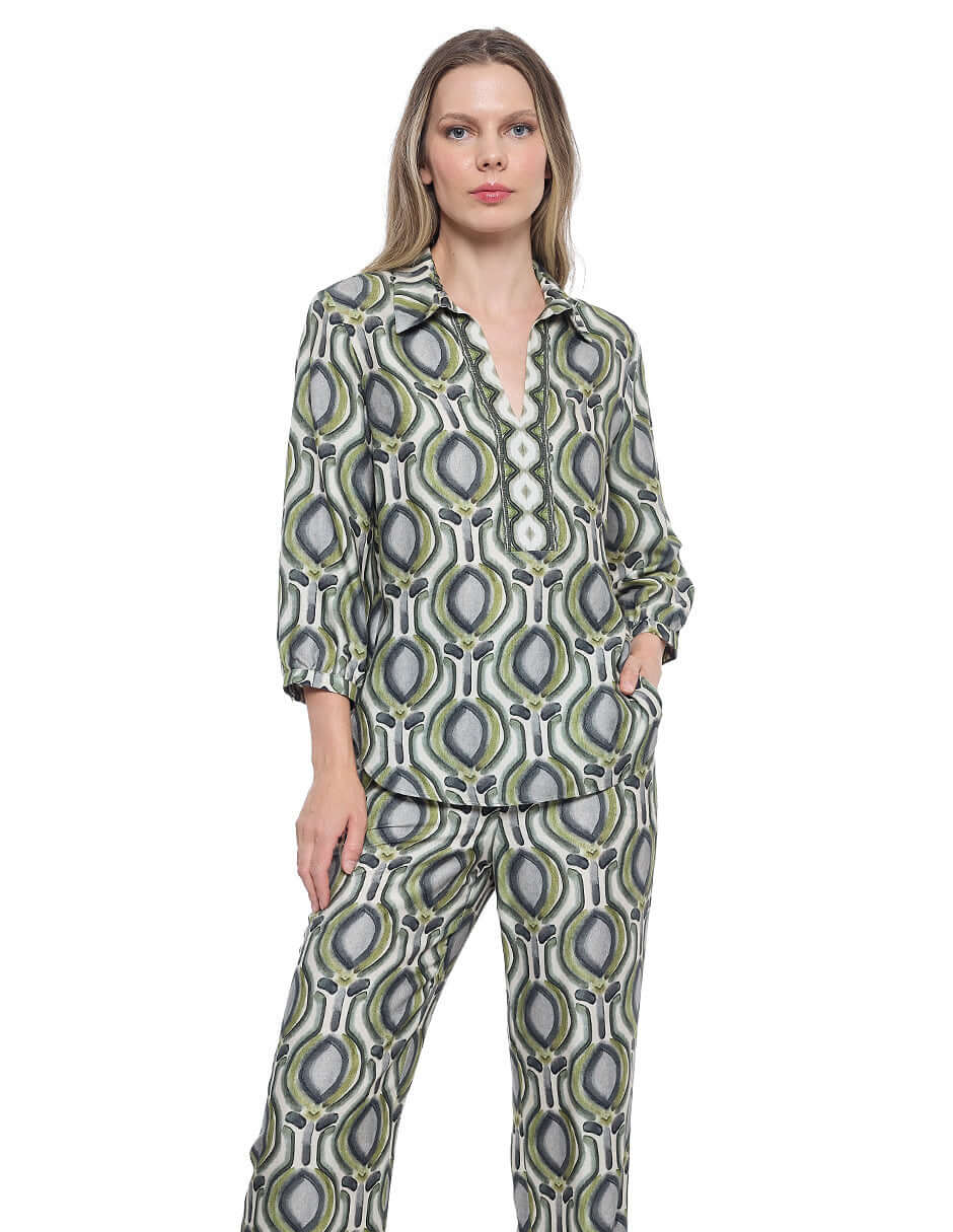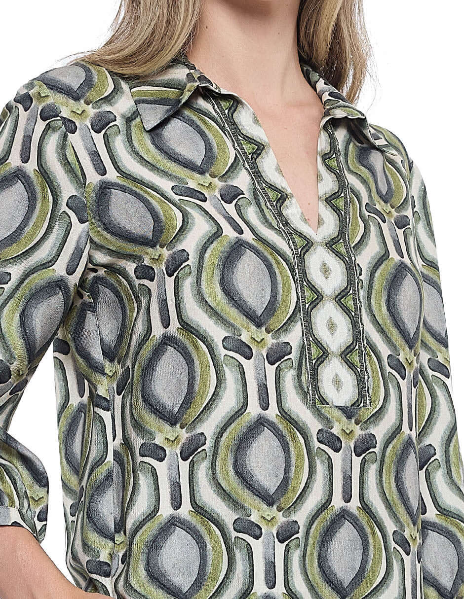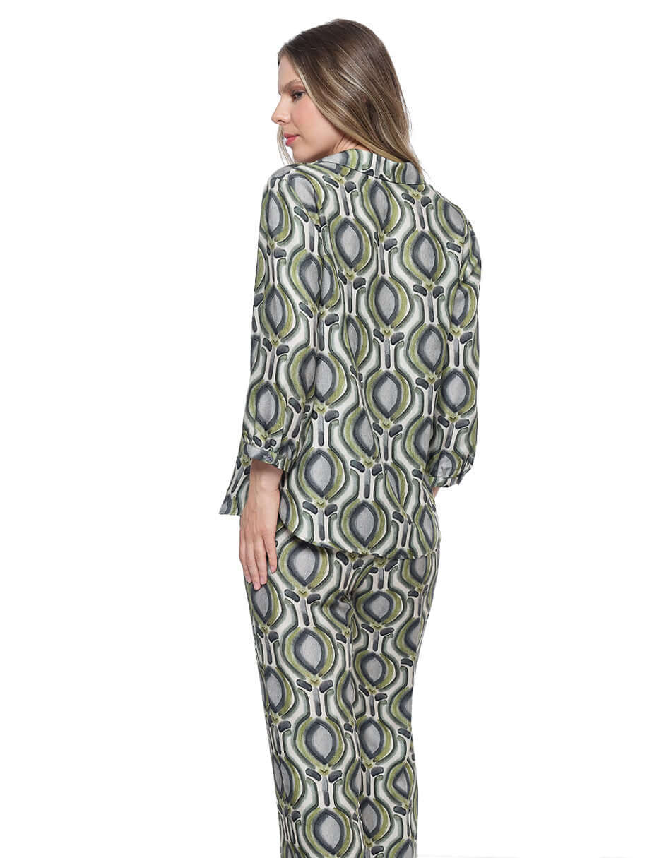 Blusa estampada color verde, cuello sport, escote V, forma y abertura en ruedo, manga 3/4 con plisado y puño