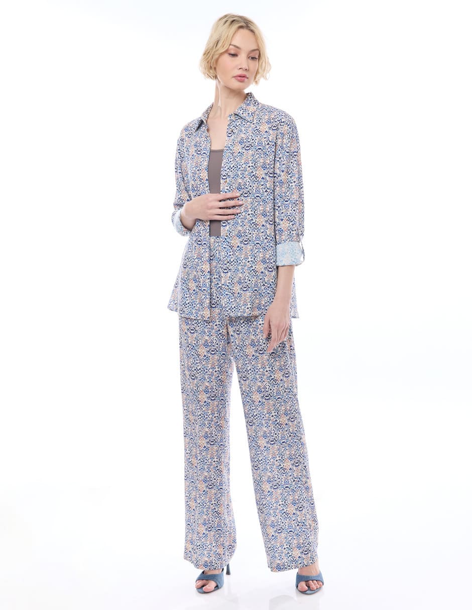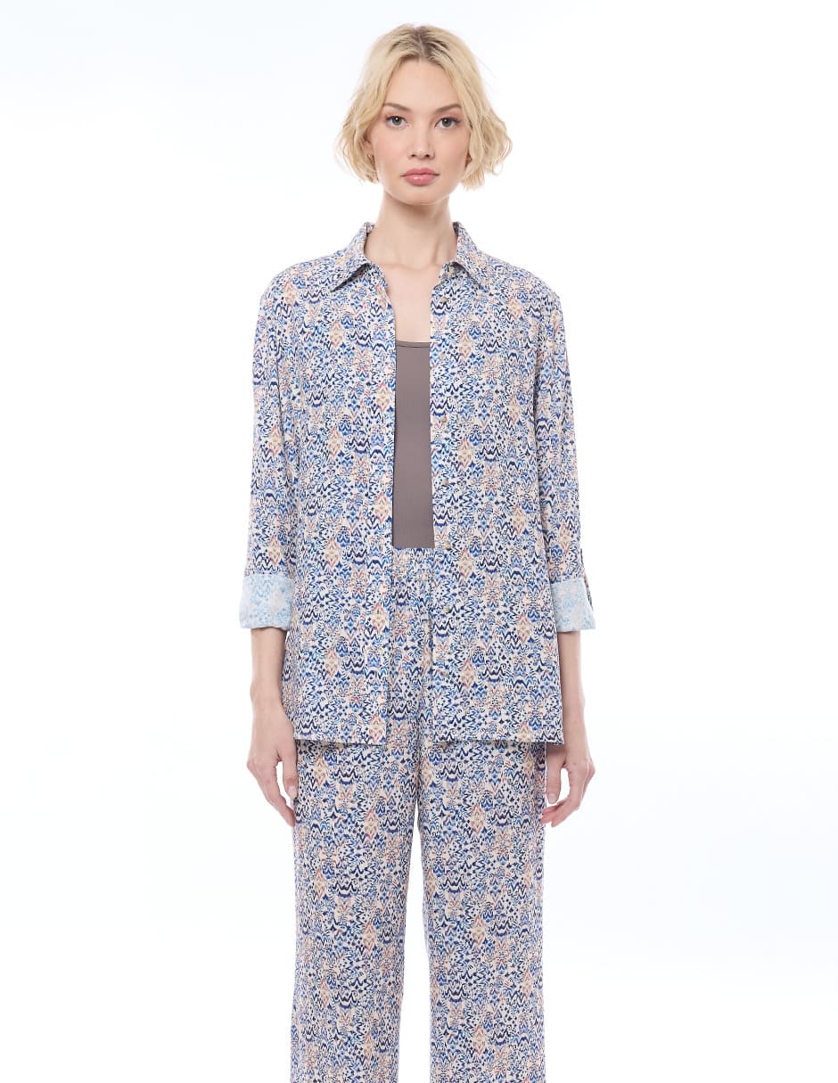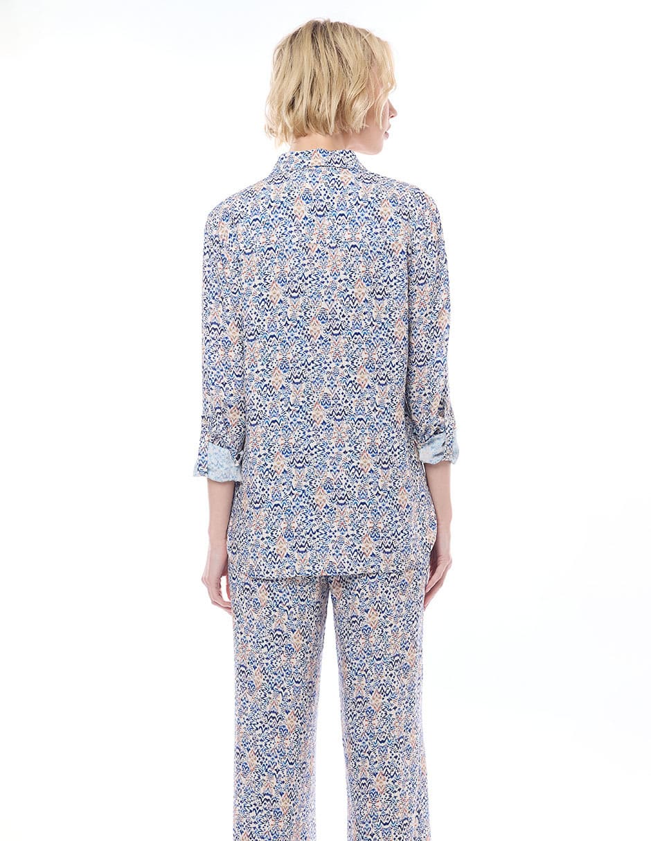 Blusón estampado color beige, cuello sport, bata trasera, manga larga con puño y elevador funcional