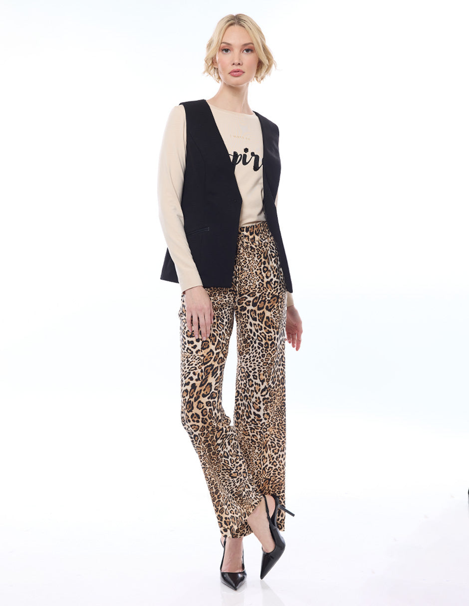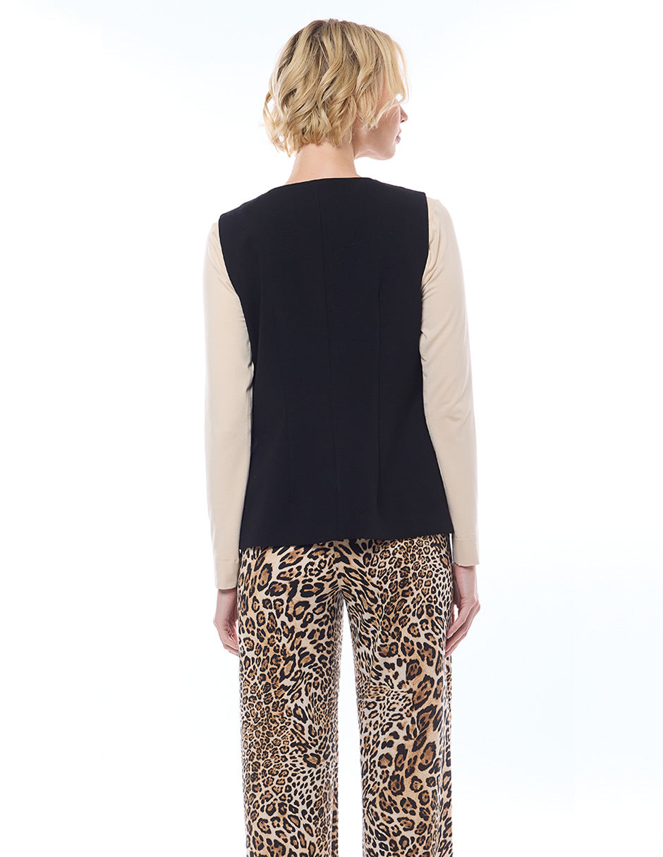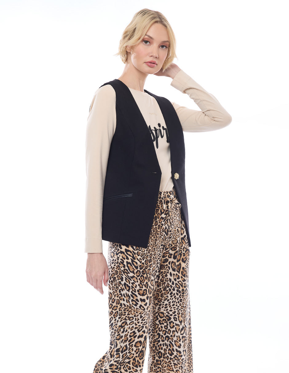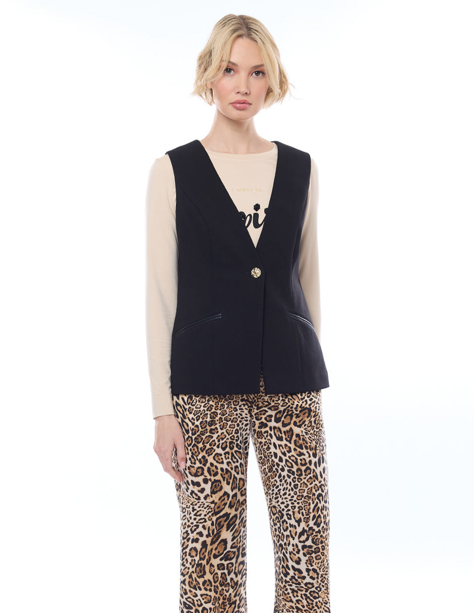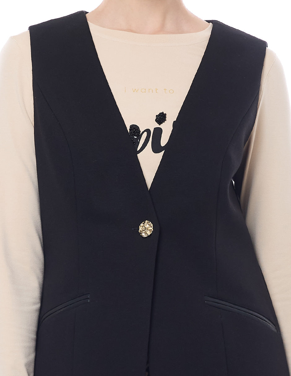 Chaleco liso color negro, escote V con un botón, bolsas de vivo en tacto piel