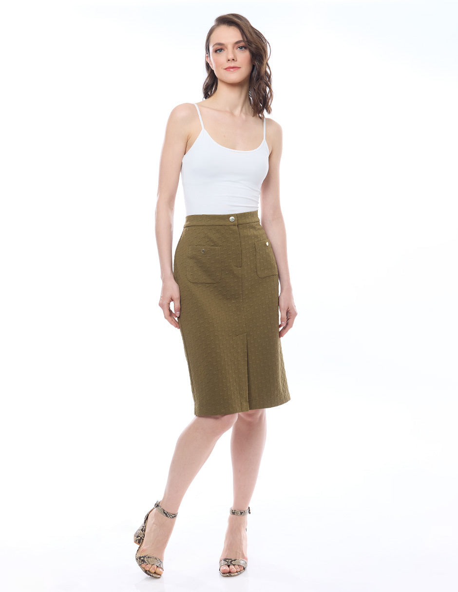 Falda chanel color verde olivo, brocada lisa, cierre y abertura al frente