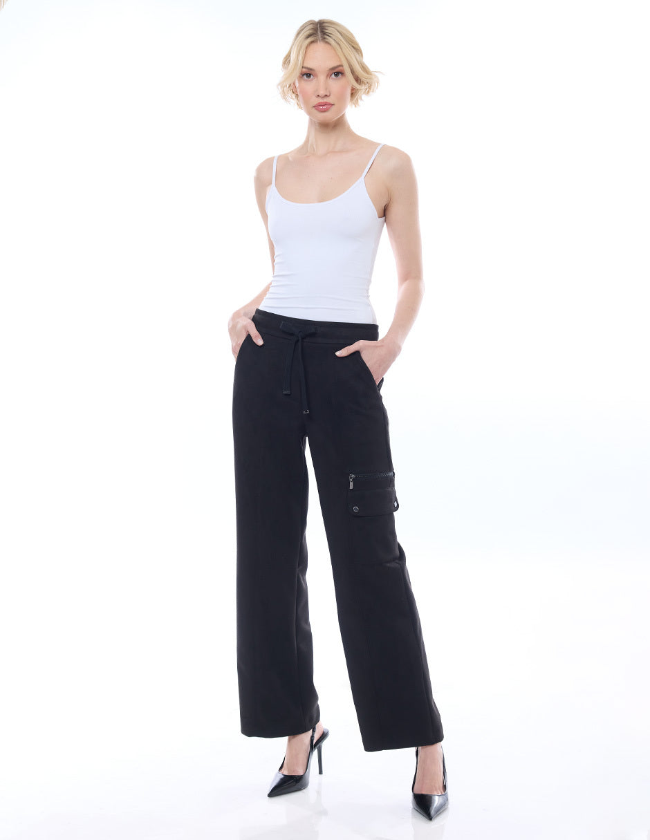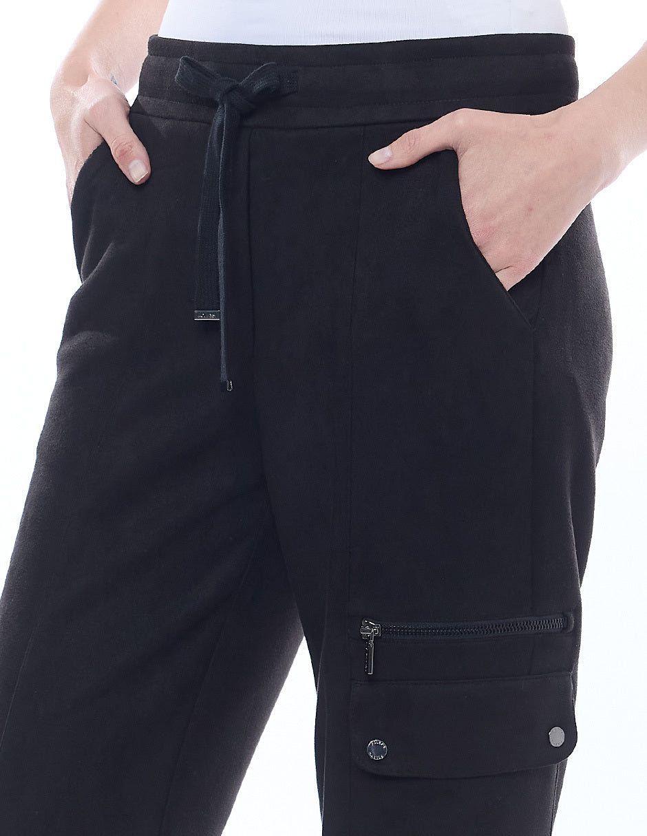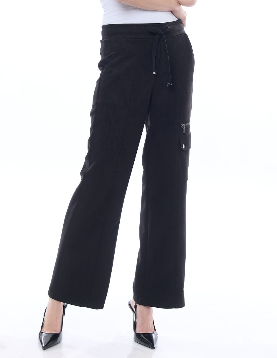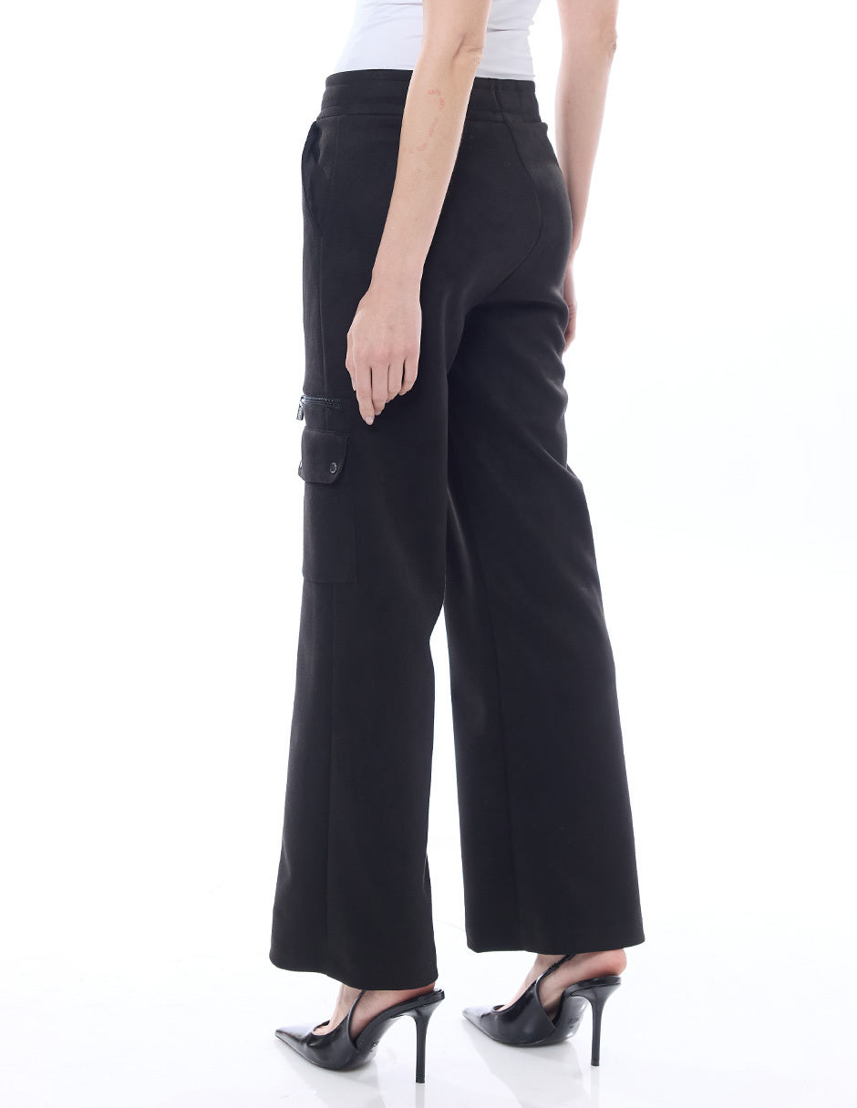 Pantalón liso color negro, elástico en cintura, bolsas en costado y de cargo