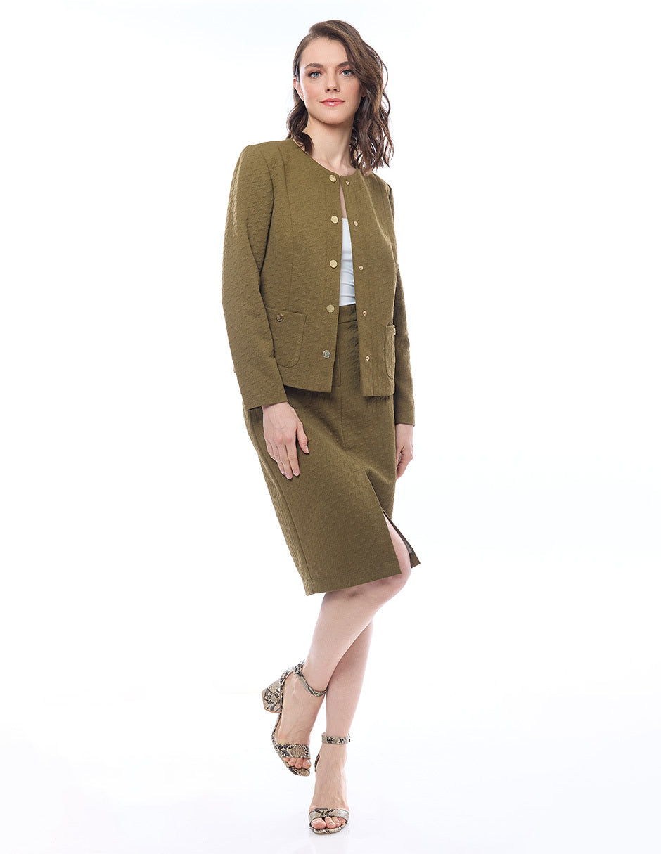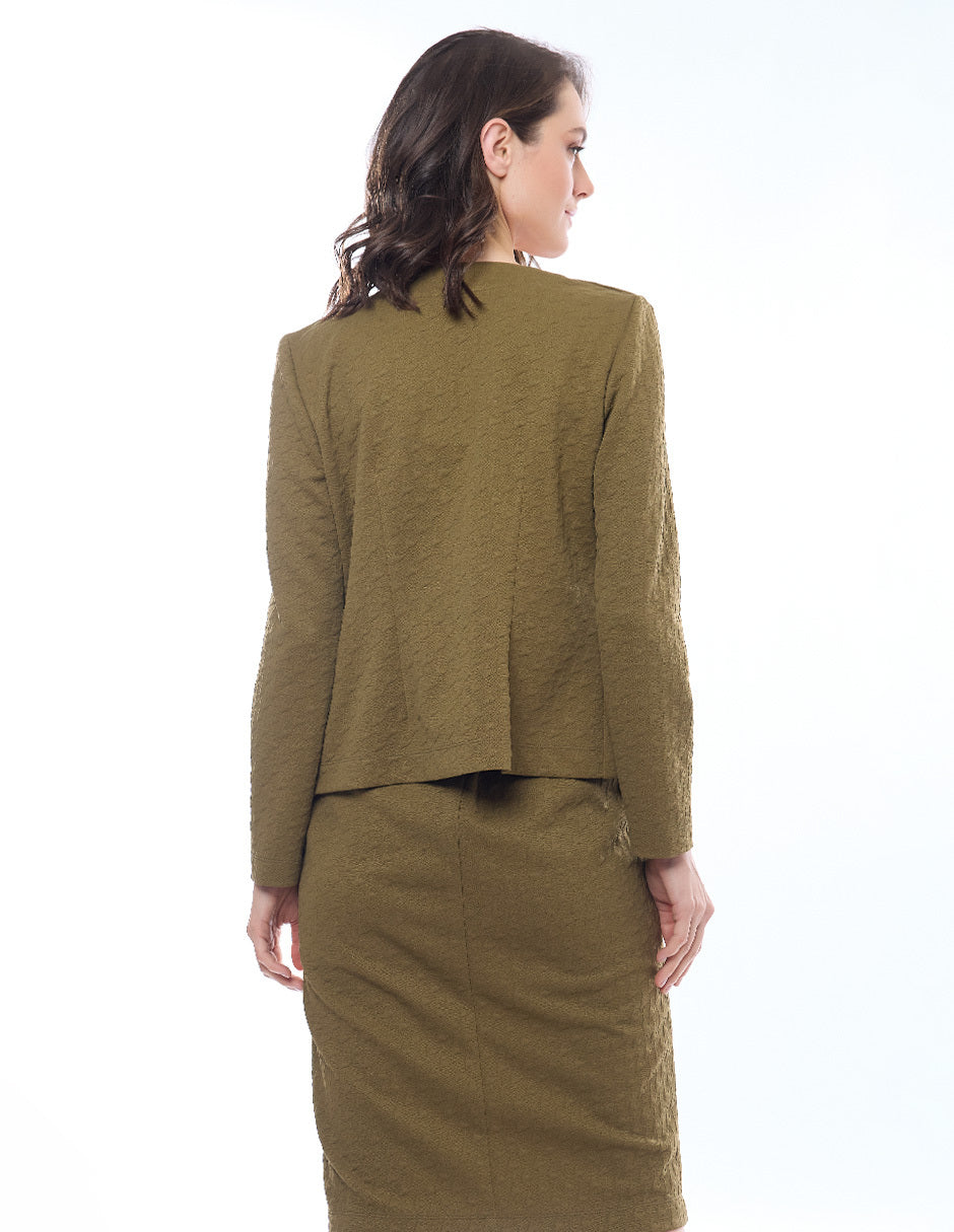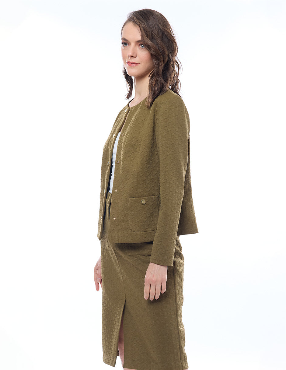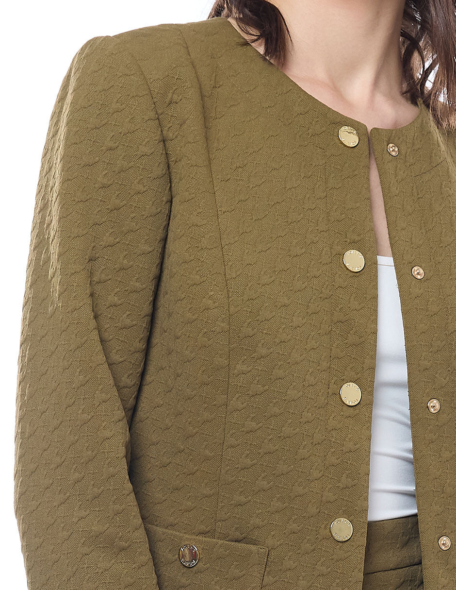 Saco brocado liso color verde olivo, escote redondo con broches, bolsas de parche, y manga larga