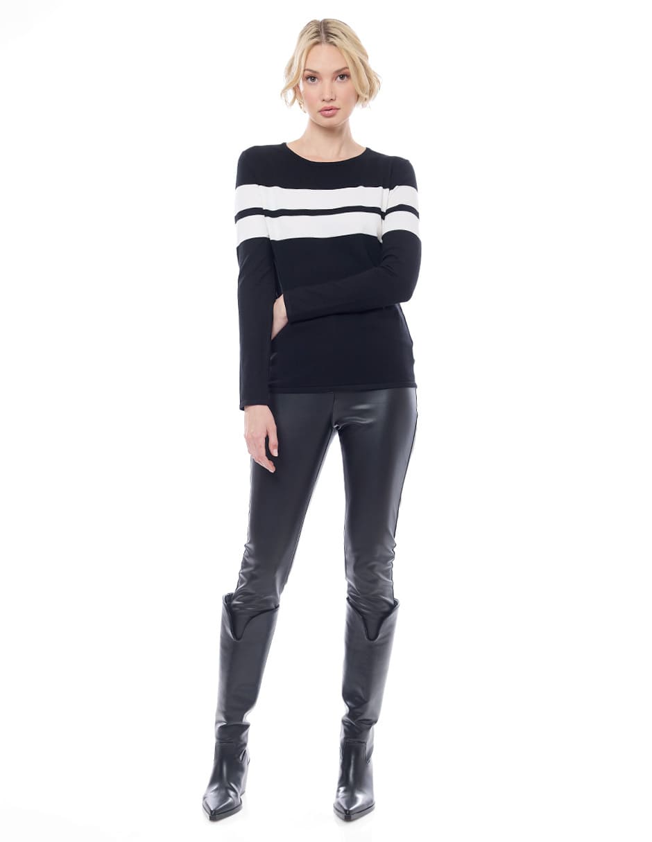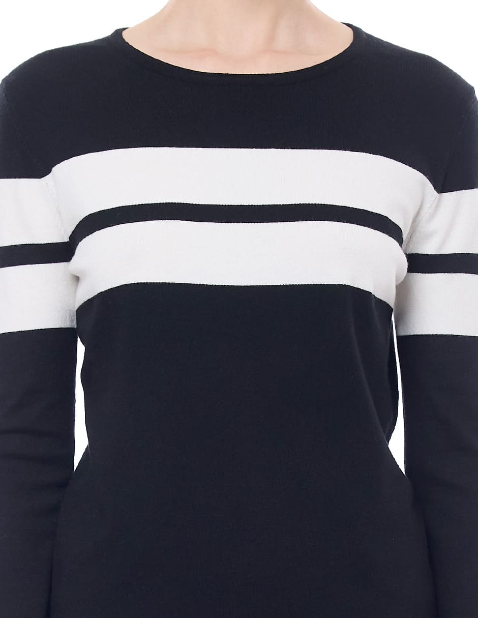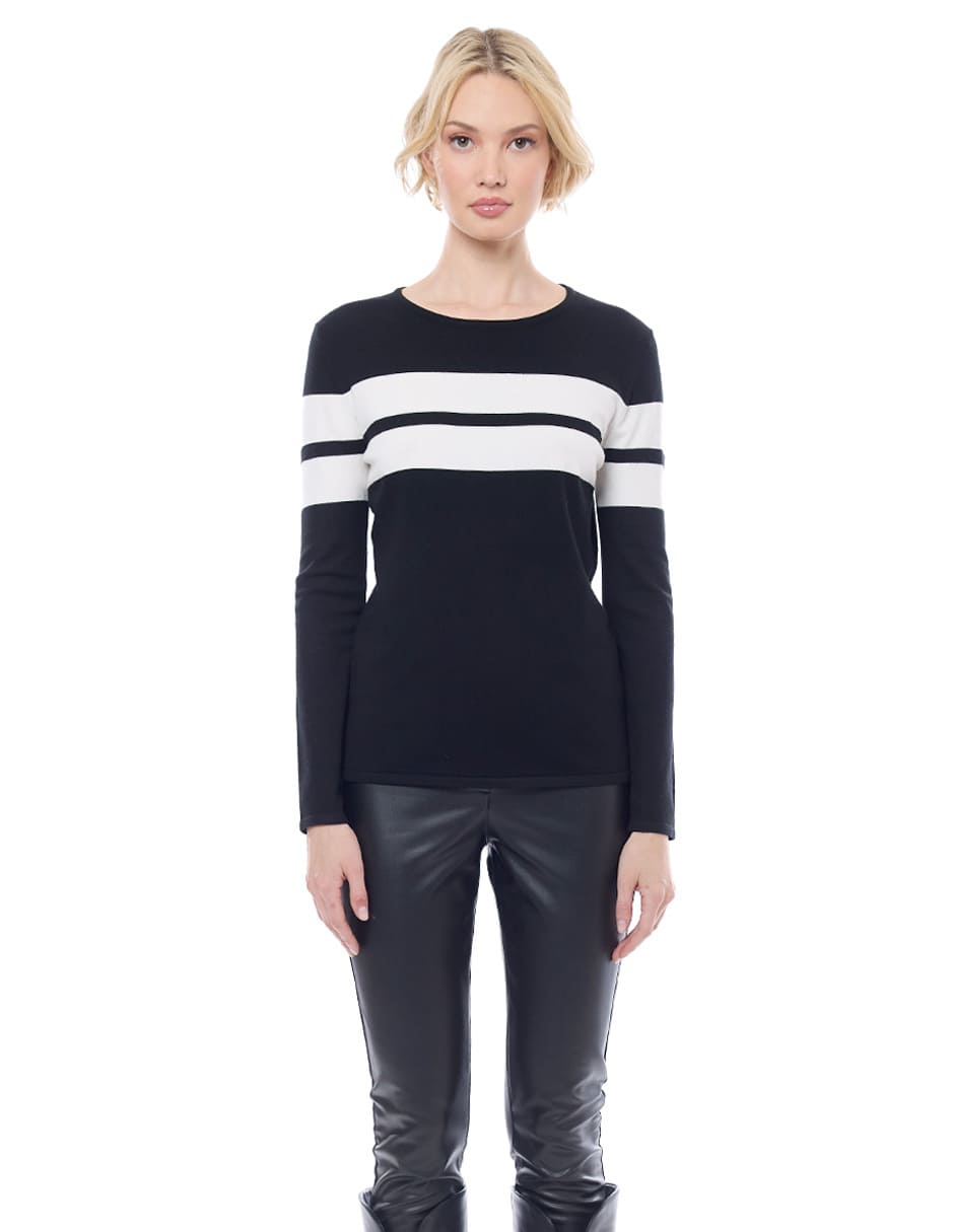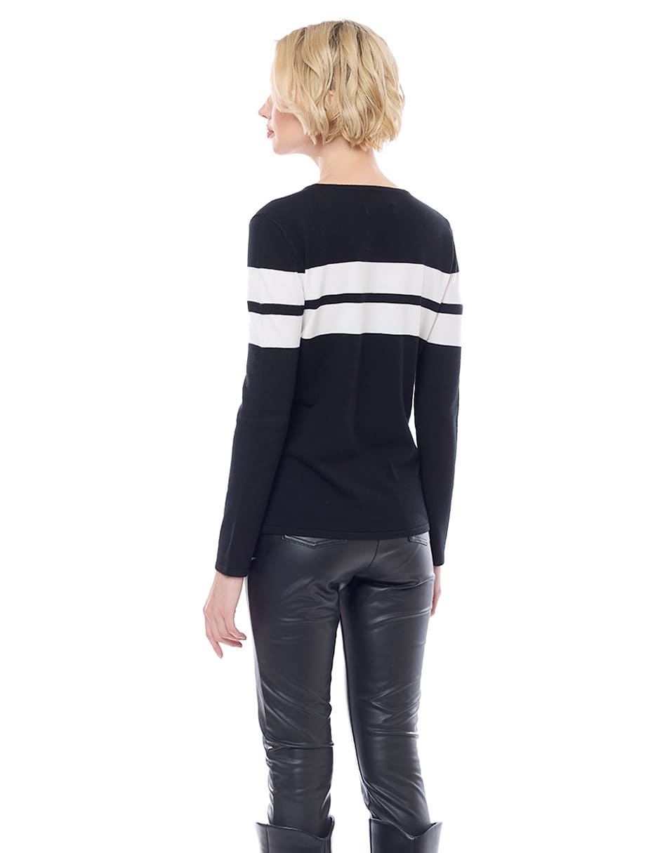 Suéter punto liso color negro con franjas anchas en combinación, escote redondo, y manga larga