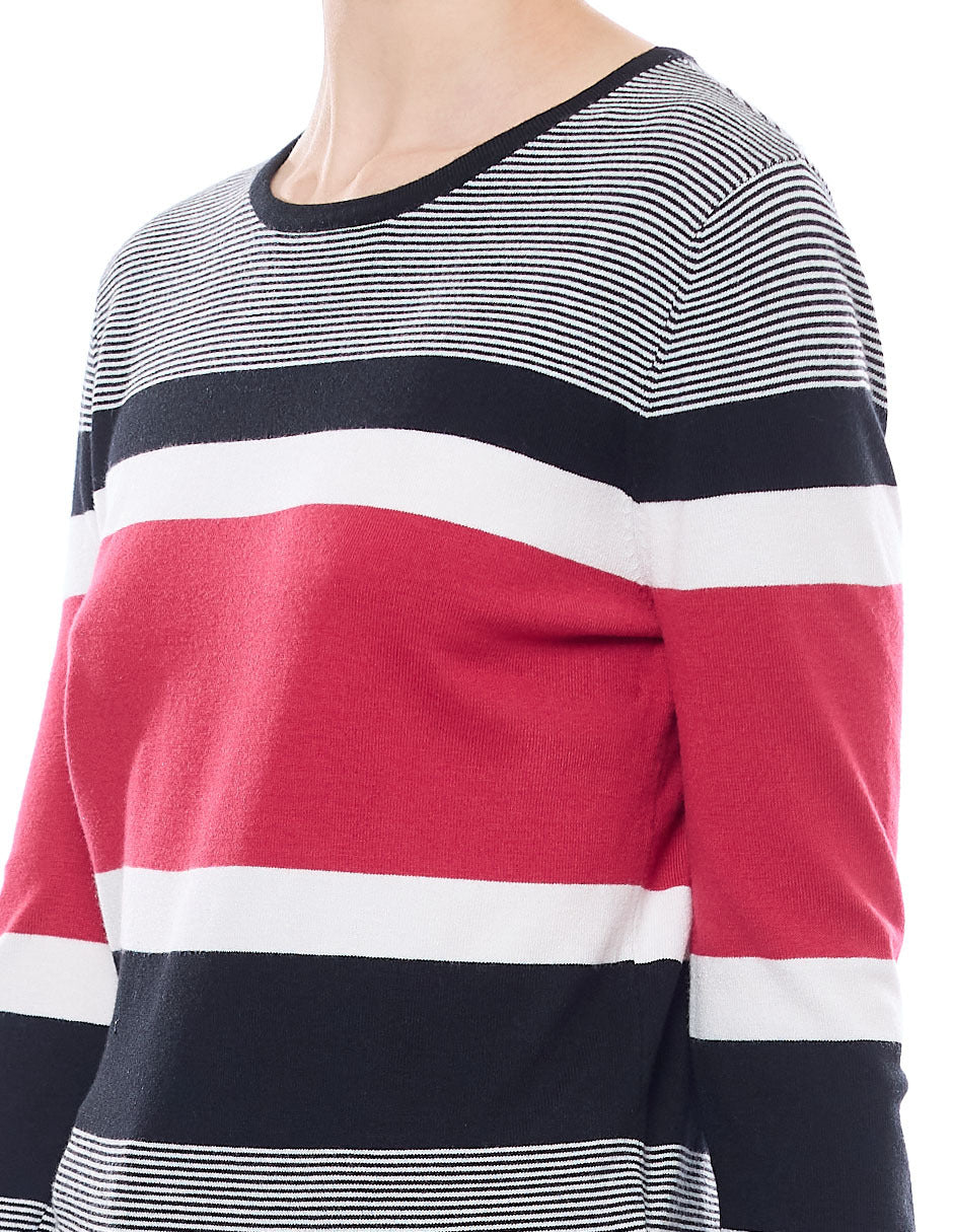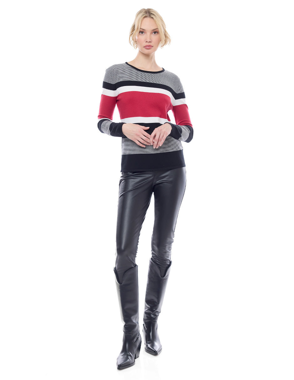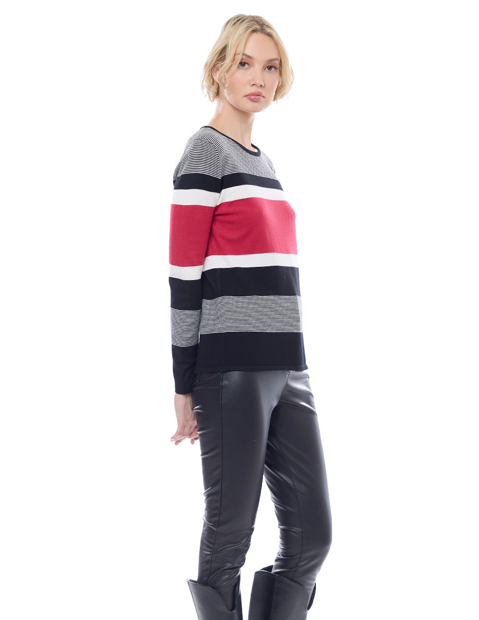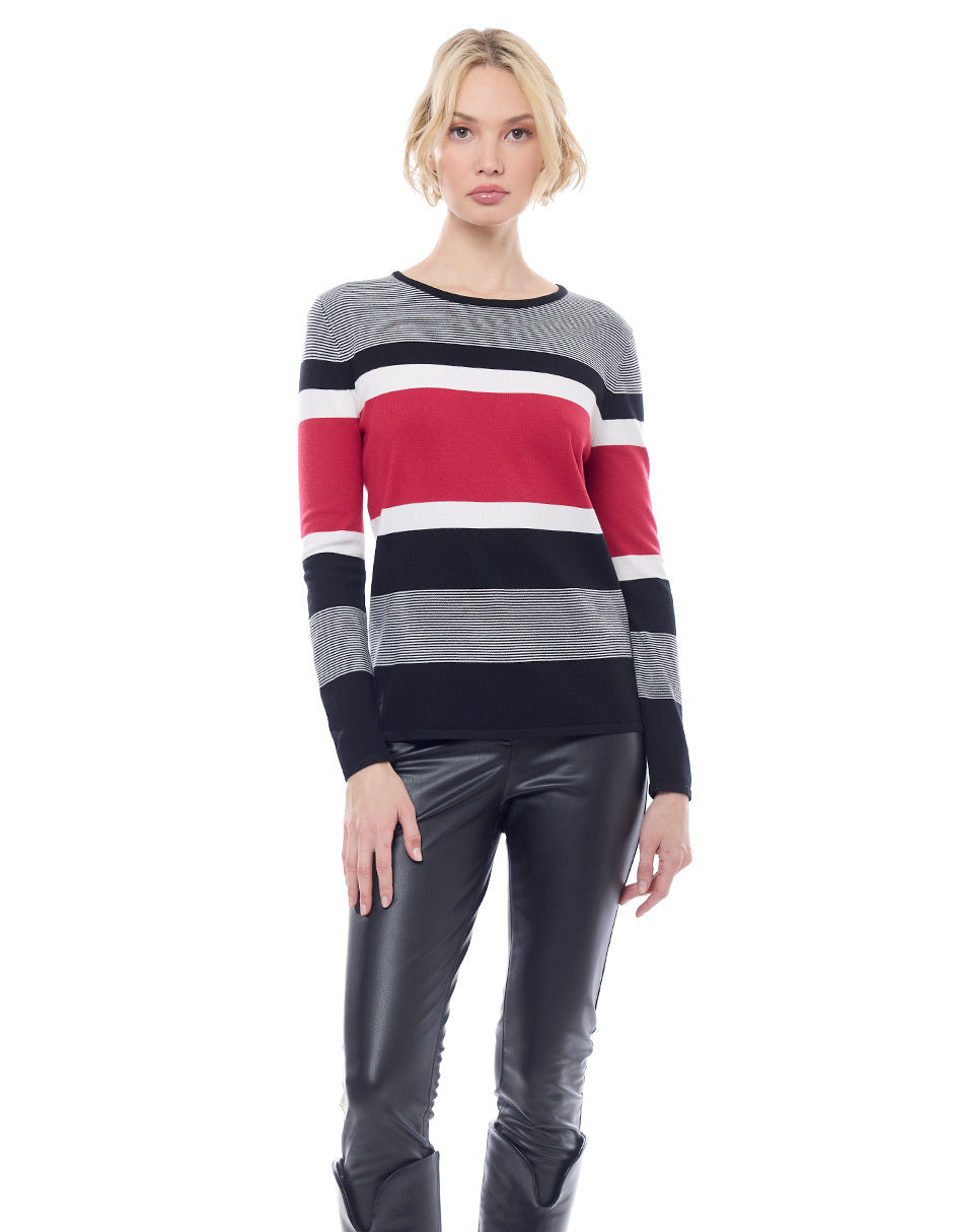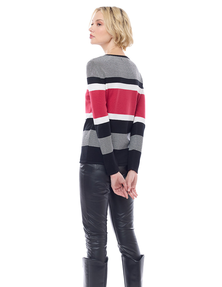 Suéter punto color negro con franjas en combinación, escote redondo, y manga larga