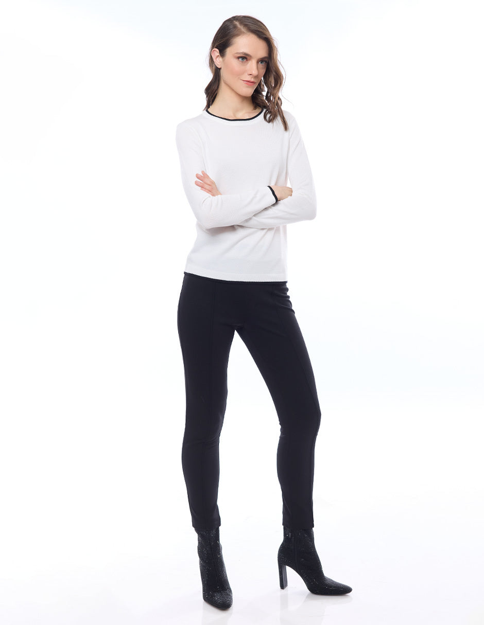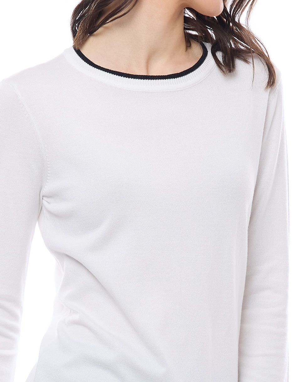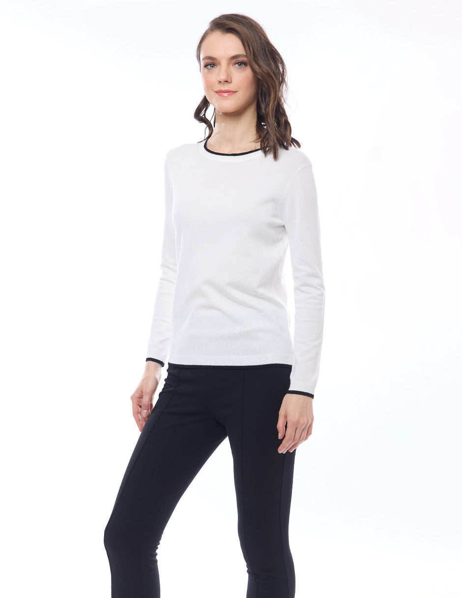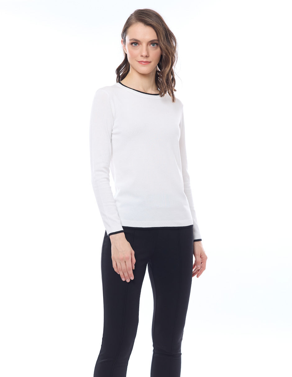 Suéter punto liso con filos en combinación, escote redondo, y manga larga