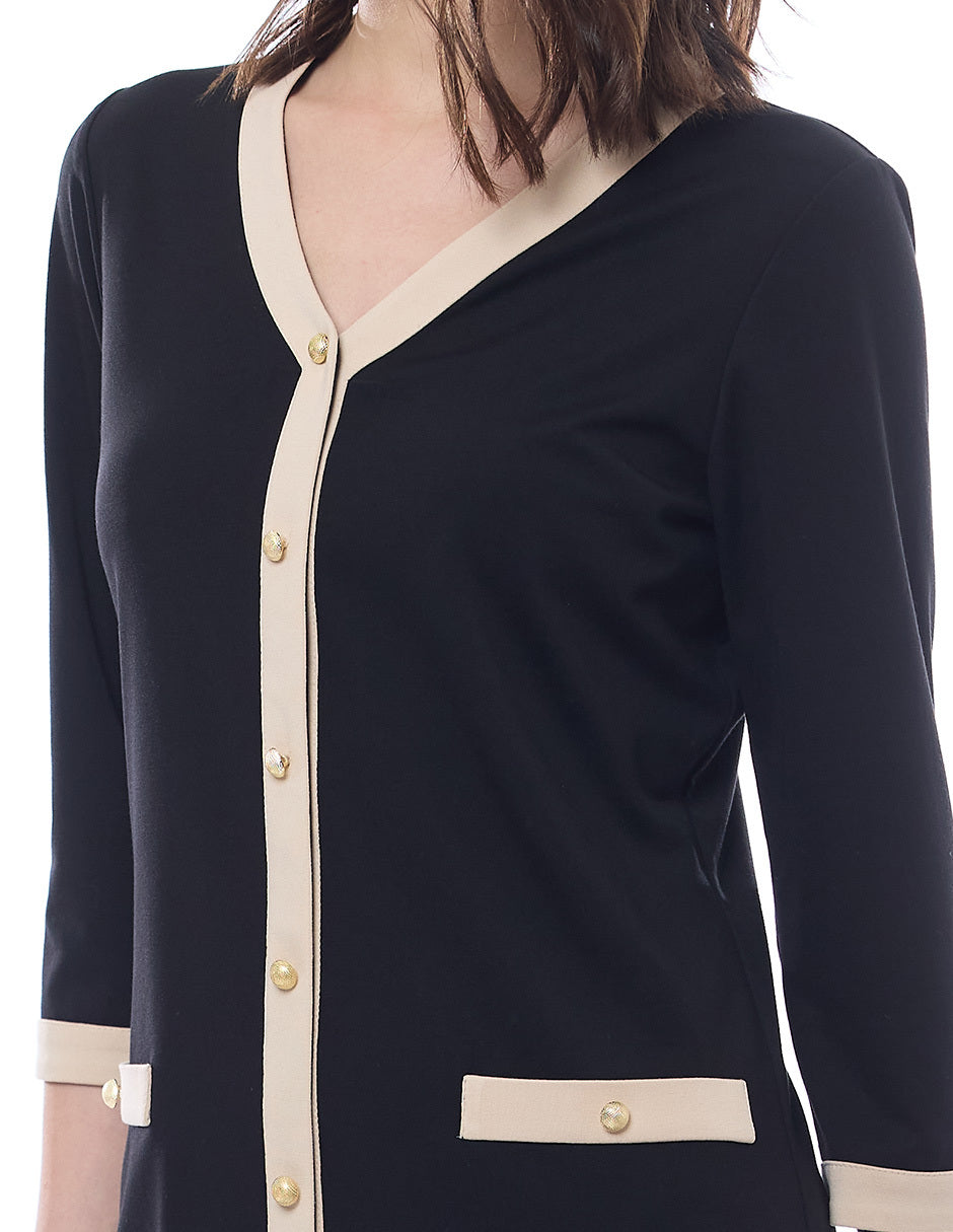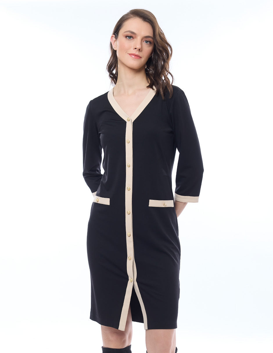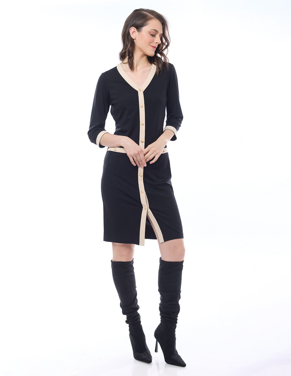 Vestido punto liso color negro con filos y vivos en combinación, escote V, y manga 3/4